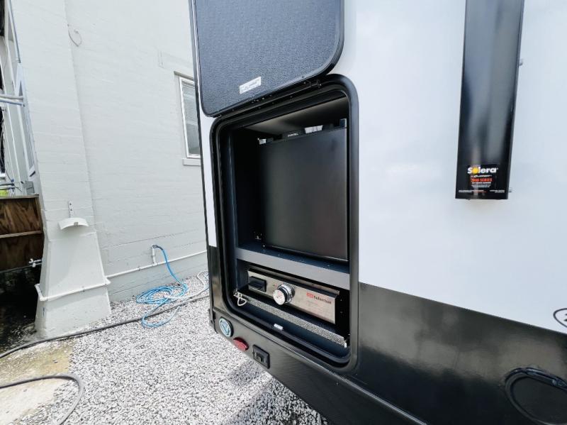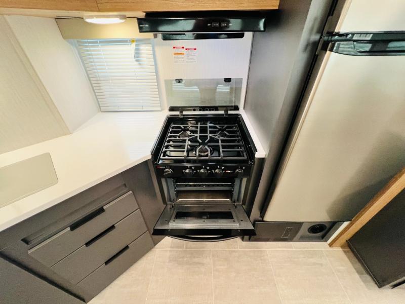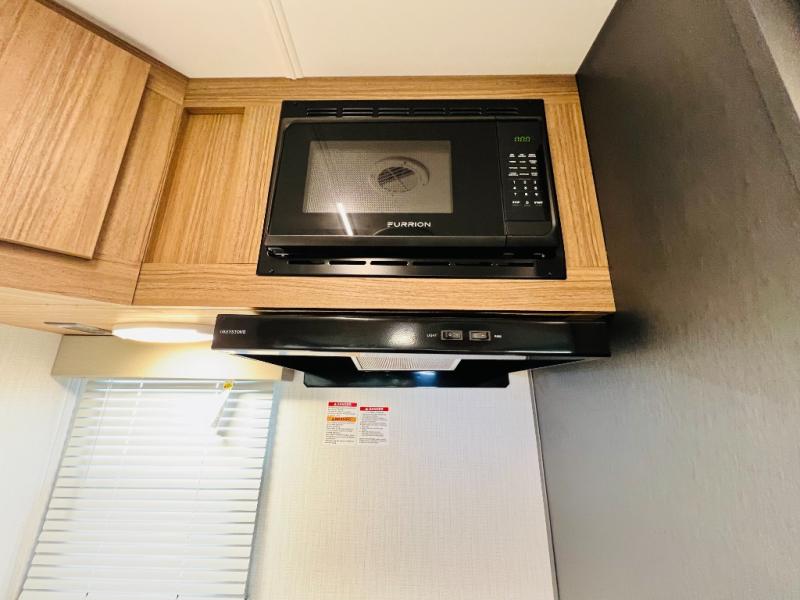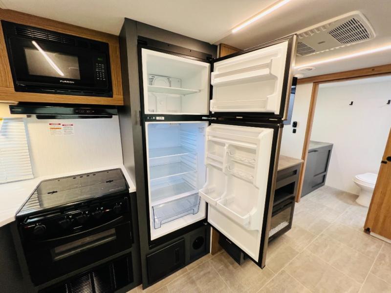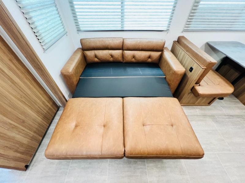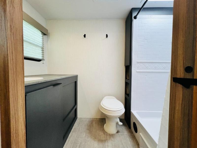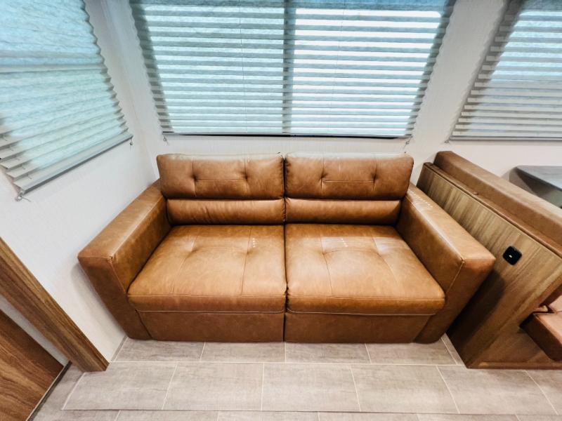 If you want luxury while you camp, then you came to the right place with this travel trailer! After a fun-filled day at the beach, you can rinse the sand out of your hair in the full shower surround located in the full rear bathroom which also has a linen closet and a sink with plenty of countertop space for your necessities that might not fit inside the medicine cabinet. Just outside the bathroom is the walk-in pantry where you can store all of your favorite snacks, a sofa to relax on, a booth dinette to enjoy meals at or transform into an extra sleeping space, and a fully equipped kitchen with stainless steel appliances to whip up your best dishes. The front private bedroom has a queen size bed to lay your head on at night along with wardrobes and nightstands on either side for your items!