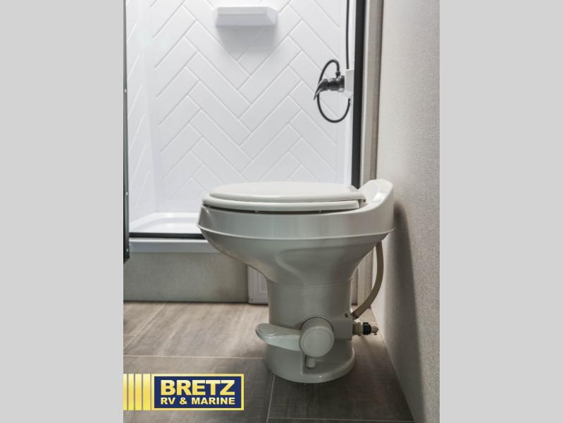 The whole family can fit in this travel trailer! Enter the unit through one of the dual entry doors and see all that it has to offer. Starting with the front private bedroom that has a queen size bed to lay your head on at night and wardrobes on either side to hang up your clothes. The fully equipped kitchen has stainless steel appliances to prepare your best home cooked meals, as well as a walk-in pantry for everyone's favorite snacks. Enjoy your delicious meals at the booth dinette then play a card game or relax on the sofa while watching a movie on the 40" LED TV. The double bunk beds offer a comfortable place for up to four individuals depending on their size, and they are conveniently right next to the rear corner bathroom which has an exit door so you can get back to playing outside fast!
