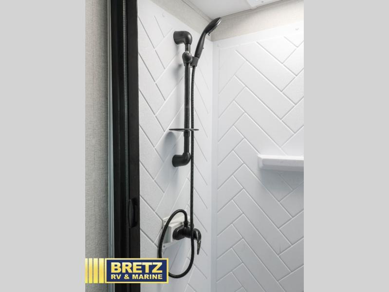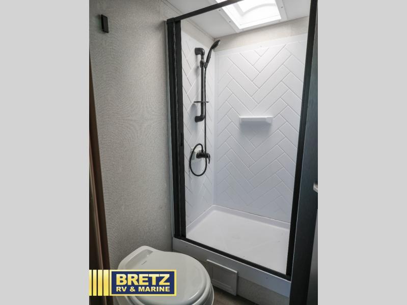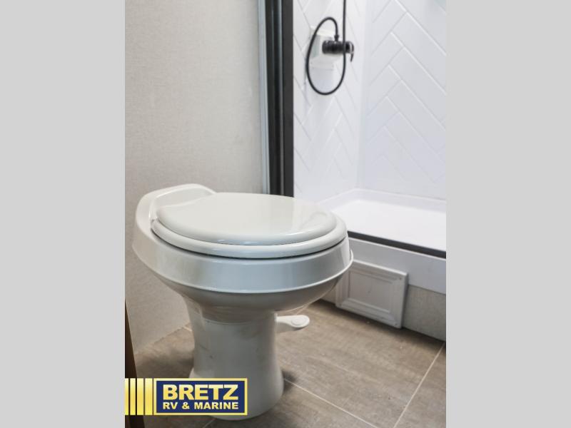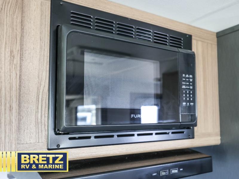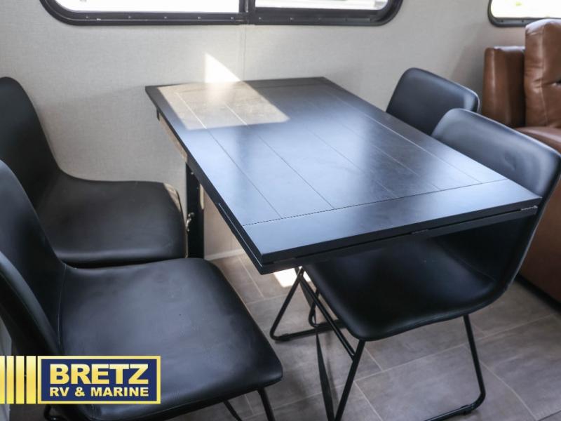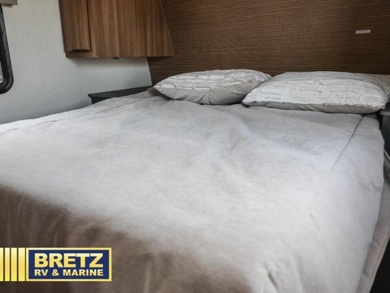 If space is what you're looking for, space is what you'll get in this travel trailer! There are dual opposing slides in the combined kitchen and living room, and the kitchen island will bring the whole room together. This Corterra kitchen includes everything you need to prepare meals each day, including a three burner cooktop and 22" oven, a 10.7 cu. ft. residential refrigerator, and extra counter space to prep each day. Your crew can relax on the two sofas or play a game at the booth dinette, or you may just find yourselves outdoors under the two 11' power awnings. After a day of exploring outdoors, you can freshen up in the full bath, then head to bed in the front private bedroom. Here, you'll enjoy a queen bed, dual closets, plus a dresser/wardrobe to keep everything tidy!