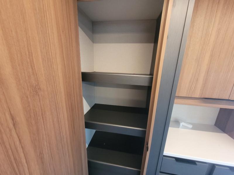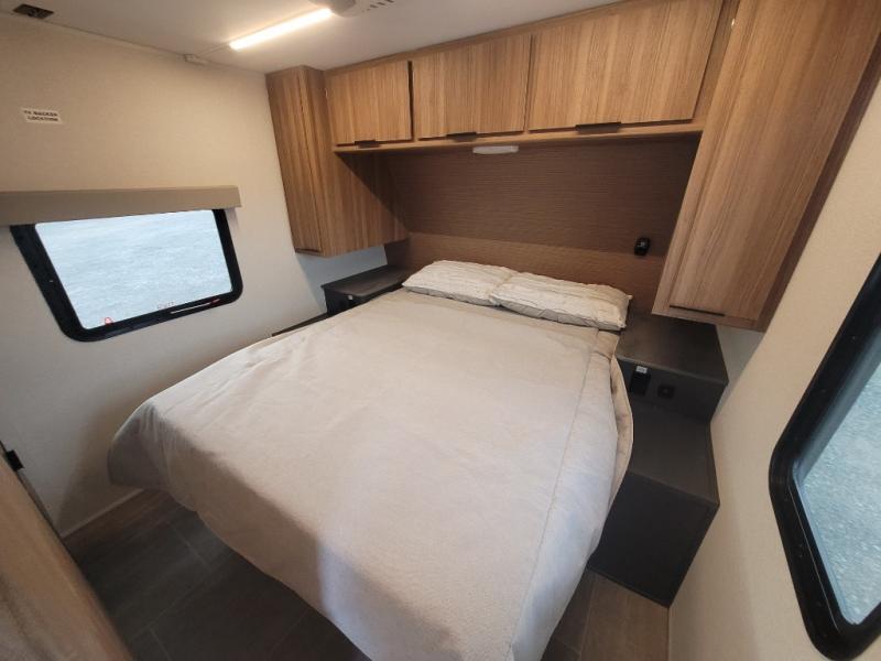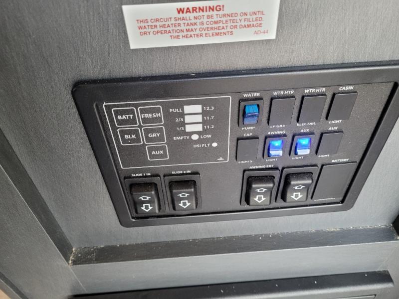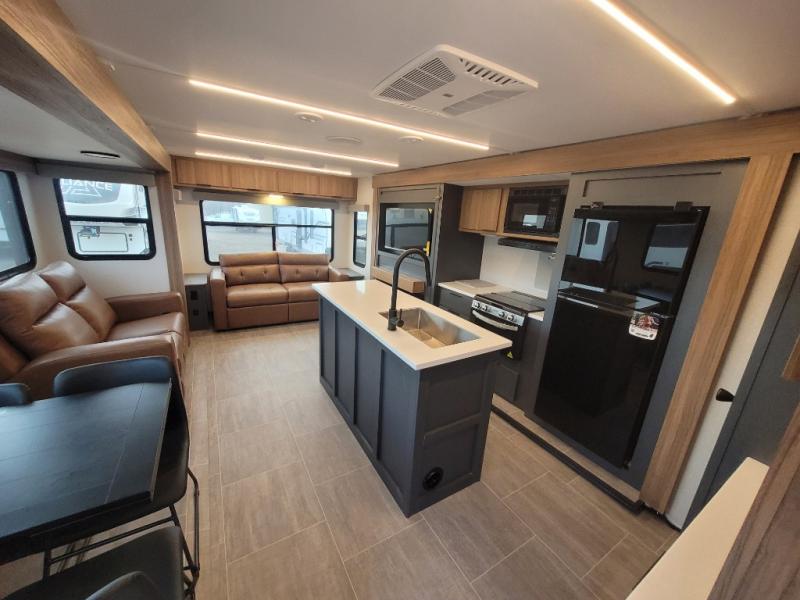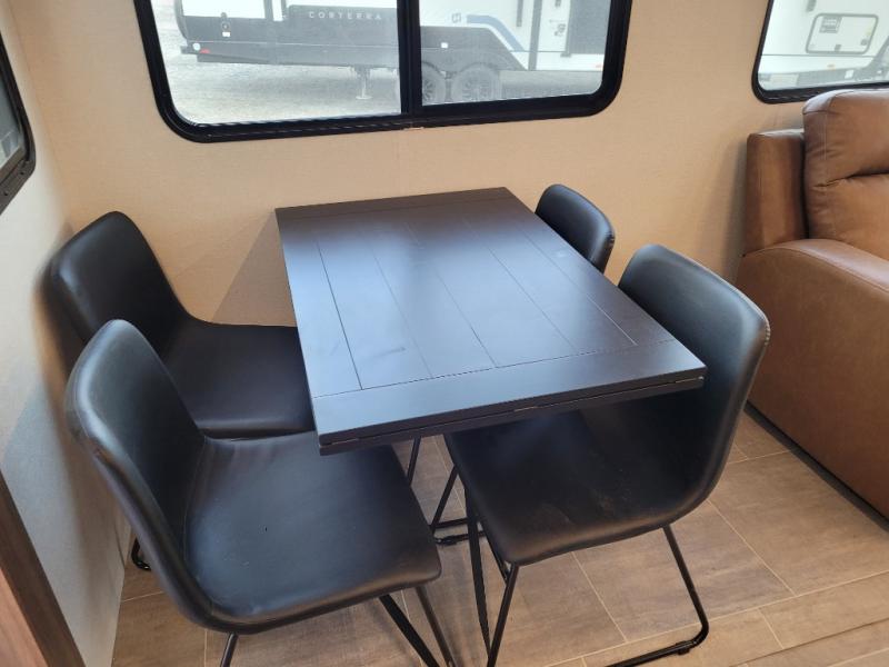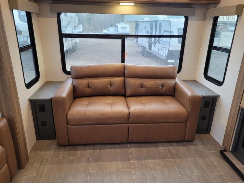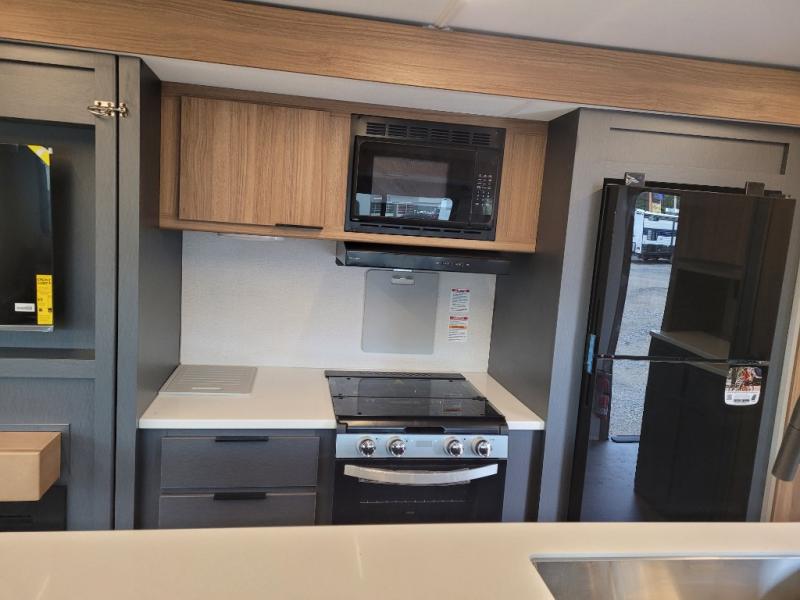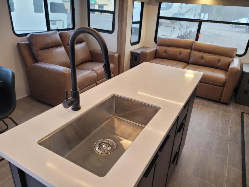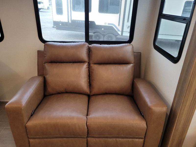 If space is what you're looking for, space is what you'll get in this travel trailer! There are dual opposing slides in the combined kitchen and living room, and the kitchen island will bring the whole room together. This Corterra kitchen includes everything you need to prepare meals each day, including a three burner cooktop and 22" oven, a 10.7 cu. ft. residential refrigerator, and extra counter space to prep each day. Your crew can relax on the two sofas or play a game at the booth dinette, or you may just find yourselves outdoors under the two 11' power awnings. After a day of exploring outdoors, you can freshen up in the full bath, then head to bed in the front private bedroom. Here, you'll enjoy a queen bed, dual closets, plus a dresser/wardrobe to keep everything tidy!