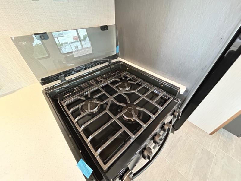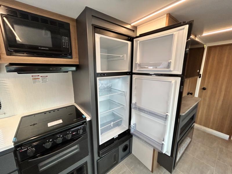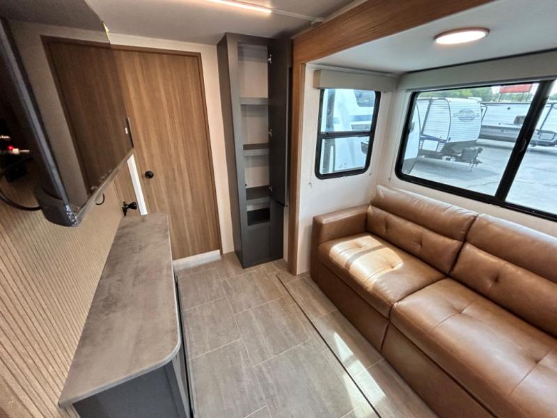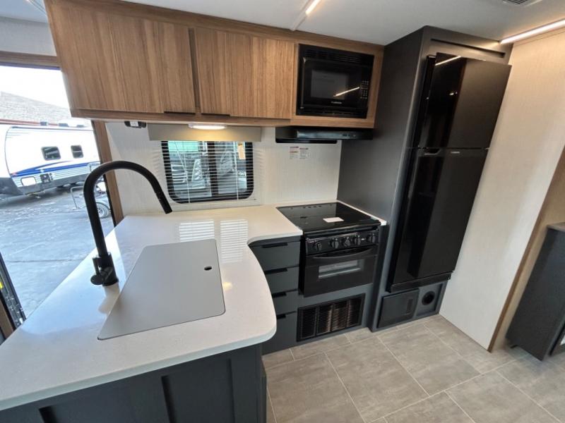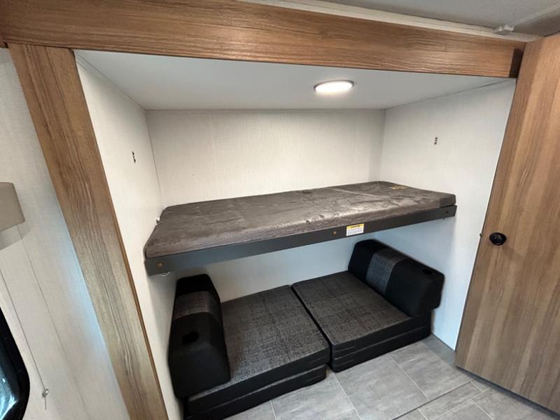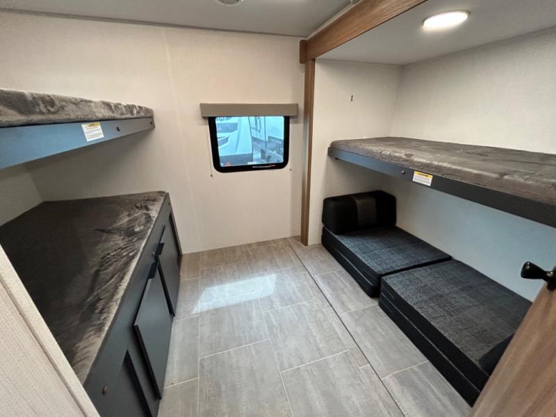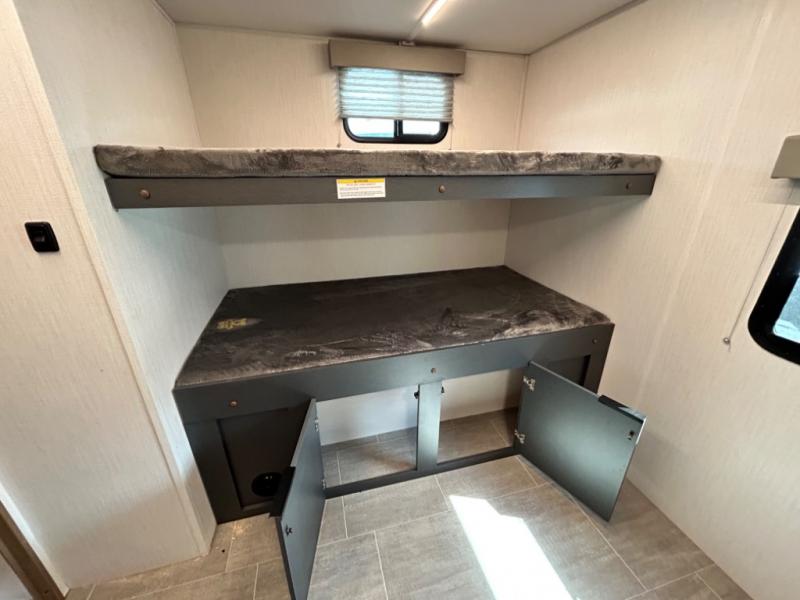 You won't believe all that this travel trailer has inside! Enter the unit through one of the dual entry doors and see all that it has to offer. Starting with the front private bedroom that has a queen size bed to lay your head on at night and wardrobes on either side to hang up your clothes. The fully equipped kitchen has stainless steel appliances to prepare your best home cooked meals, as well as an outside kitchen to breathe in some fresh air while you cook. Enjoy your delicious meals at the booth dinette then play a card game or relax on the sofa while watching a movie on the 40" LED TV. The rear private bunkhouse has a flip-up bunk bed above a sofa and another bunk bed above a bottom bed with storage space below it. Everyone can freshen up in the full bathroom which also has one of the dual entry doors!