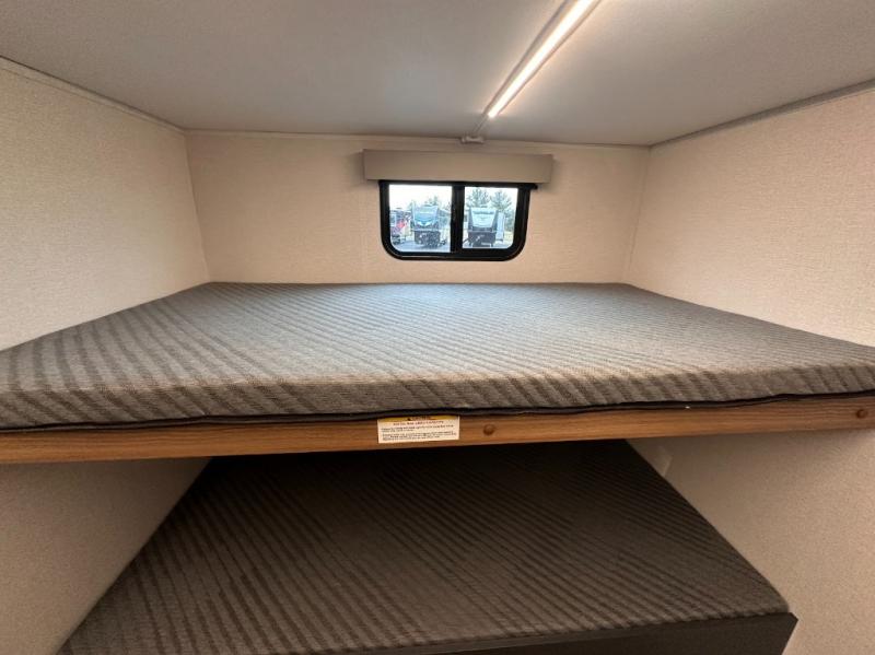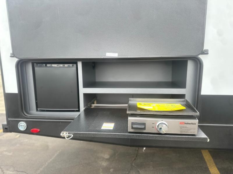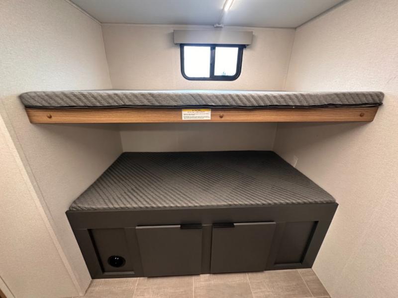 You won't believe all that this travel trailer has inside! Enter the unit through one of the dual entry doors and see all that it has to offer. Starting with the front private bedroom that has a queen size bed to lay your head on at night and wardrobes on either side to hang up your clothes. The fully equipped kitchen has stainless steel appliances to prepare your best home cooked meals, as well as an outside kitchen to breathe in some fresh air while you cook. Enjoy your delicious meals at the booth dinette then play a card game or relax on the sofa while watching a movie on the 40" LED TV. The rear private bunkhouse has a flip-up bunk bed above a sofa and another bunk bed above a bottom bed with storage space below it. Everyone can freshen up in the full bathroom which also has one of the dual entry doors!