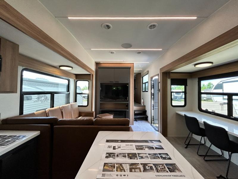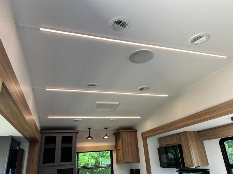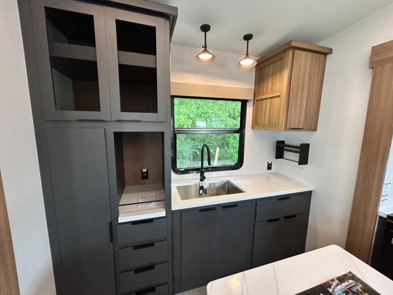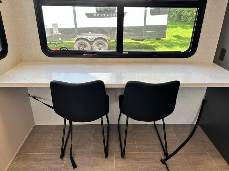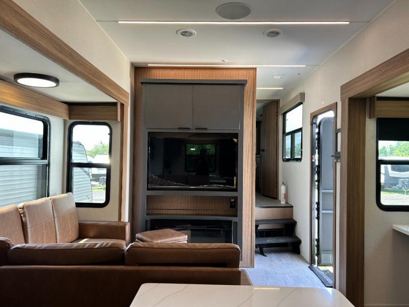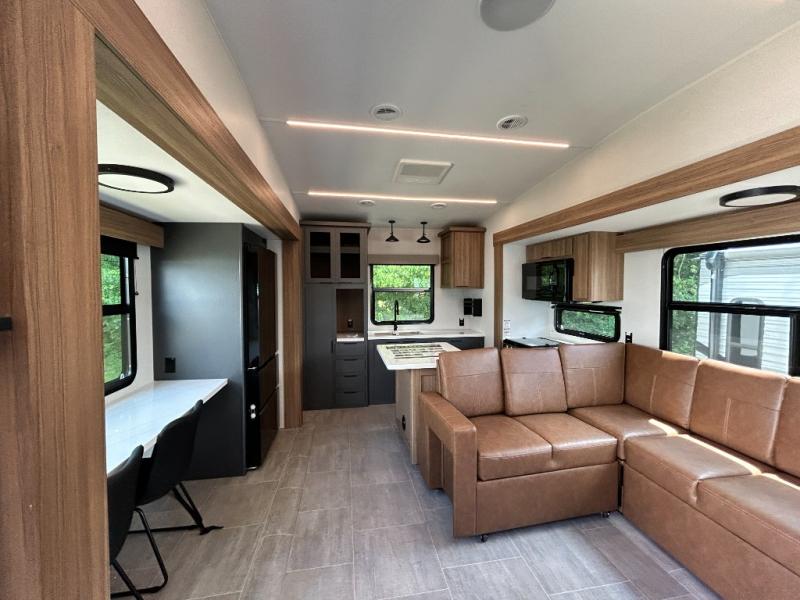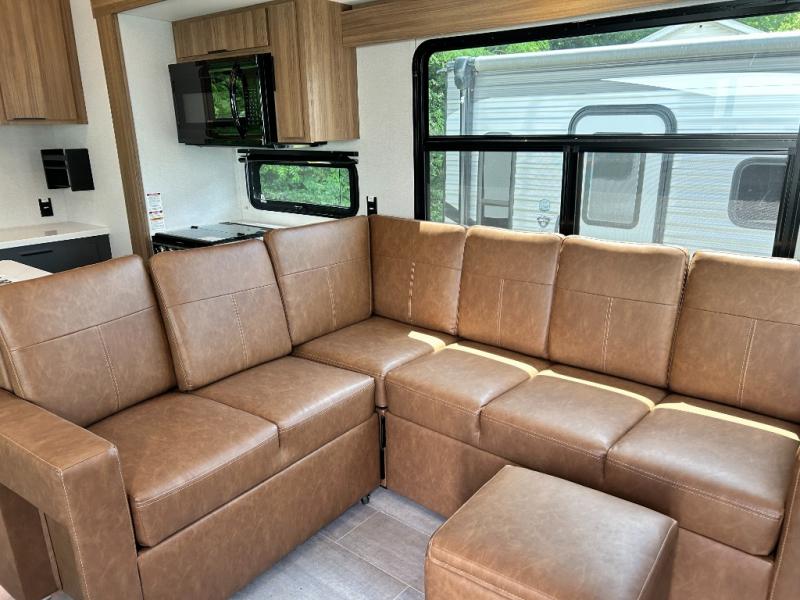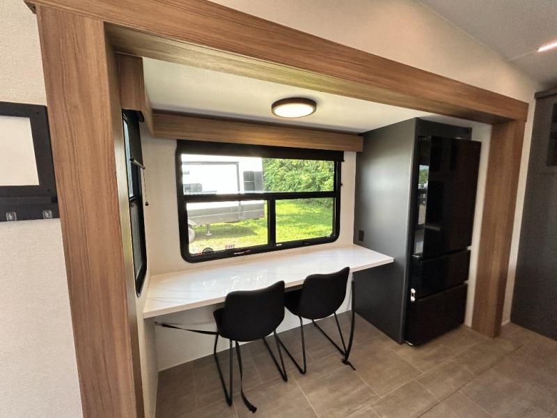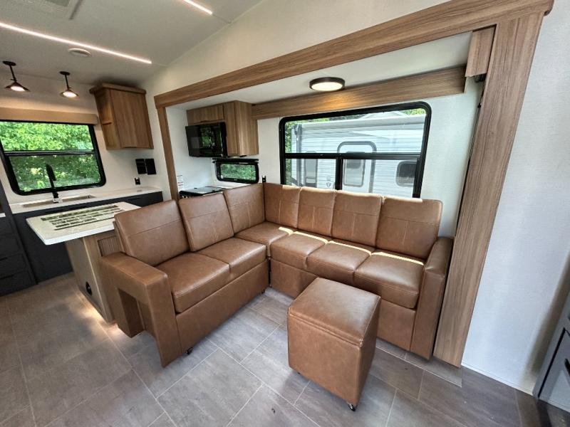 Pack your bags and head out on a luxurious trip to the campground in this fifth wheel! The rear kitchen has everything you need to prepare delicious home cooked meals, as well as two bar stools to sit at the counter while you read the morning paper and wait for the coffee to finish brewing at the coffee bar. Enjoy your meals with a view while sitting at the table and chairs facing a large open window. When you are ready to unwind for the night, head to the dual entry bathroom to rinse the sand out of your hair in the designer one-piece shower surround and then change into a comfy pair of pajamas that are stored in one of the two dressers in the front private bedroom. The bedroom also has wardrobes, a 72" x 80" king bed slide, and one of the doors leading into the bathroom. The L-shaped sofa with ottoman has hidden cup holders and USB charging ports so you can charge your phone and enjoy your favorite beverage while you watch a movie on the 55" Smart TV or simply enjoy the warm electric fireplace!