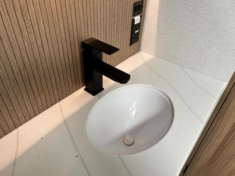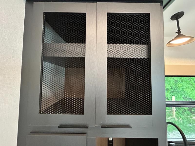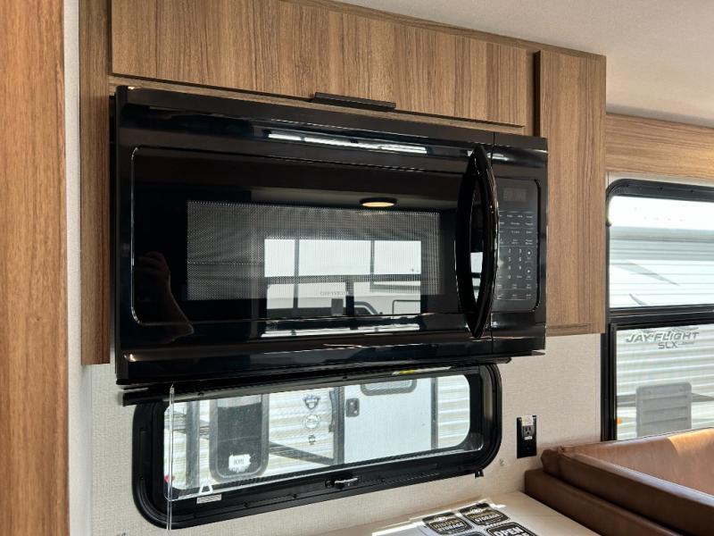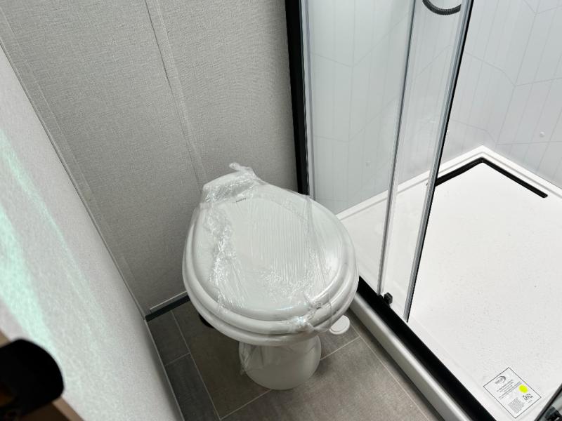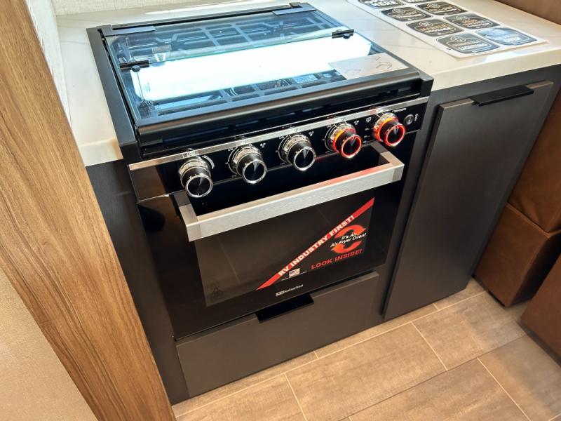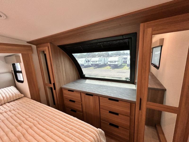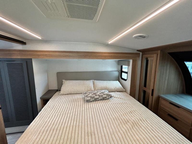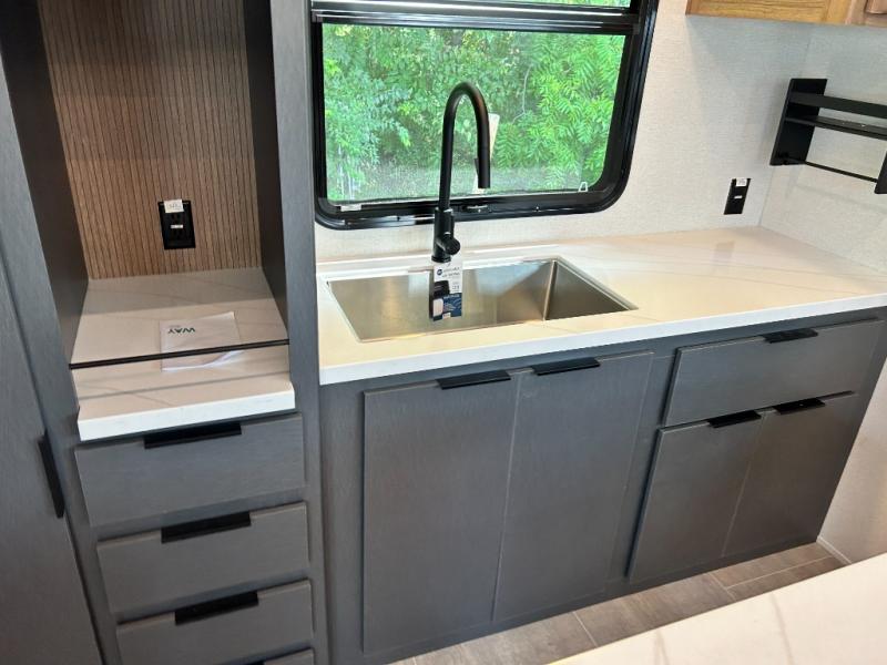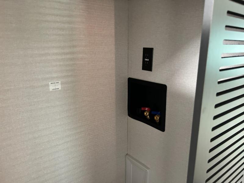 Pack your bags and head out on a luxurious trip to the campground in this fifth wheel! The rear kitchen has everything you need to prepare delicious home cooked meals, as well as two bar stools to sit at the counter while you read the morning paper and wait for the coffee to finish brewing at the coffee bar. Enjoy your meals with a view while sitting at the table and chairs facing a large open window. When you are ready to unwind for the night, head to the dual entry bathroom to rinse the sand out of your hair in the designer one-piece shower surround and then change into a comfy pair of pajamas that are stored in one of the two dressers in the front private bedroom. The bedroom also has wardrobes, a 72" x 80" king bed slide, and one of the doors leading into the bathroom. The L-shaped sofa with ottoman has hidden cup holders and USB charging ports so you can charge your phone and enjoy your favorite beverage while you watch a movie on the 55" Smart TV or simply enjoy the warm electric fireplace!