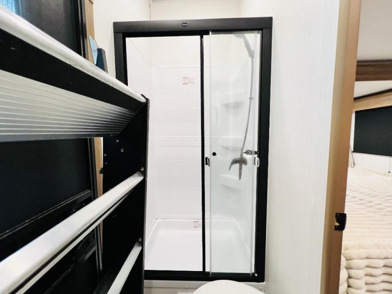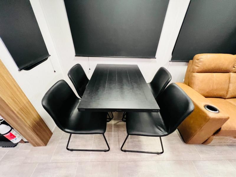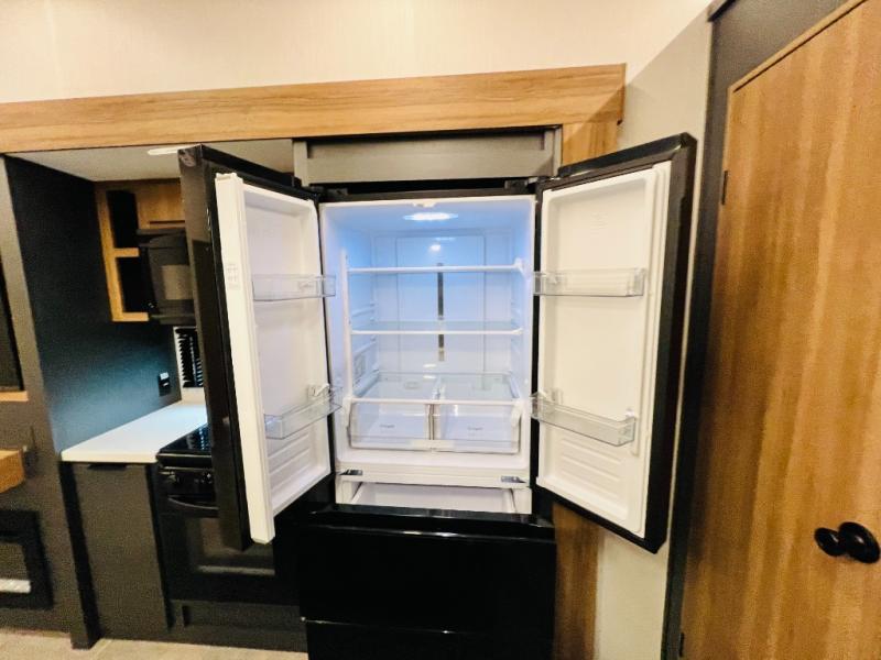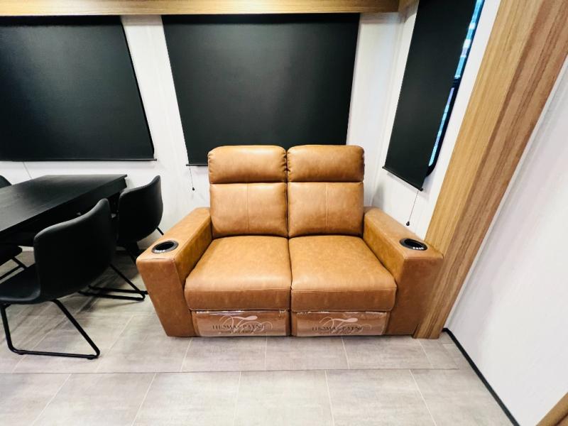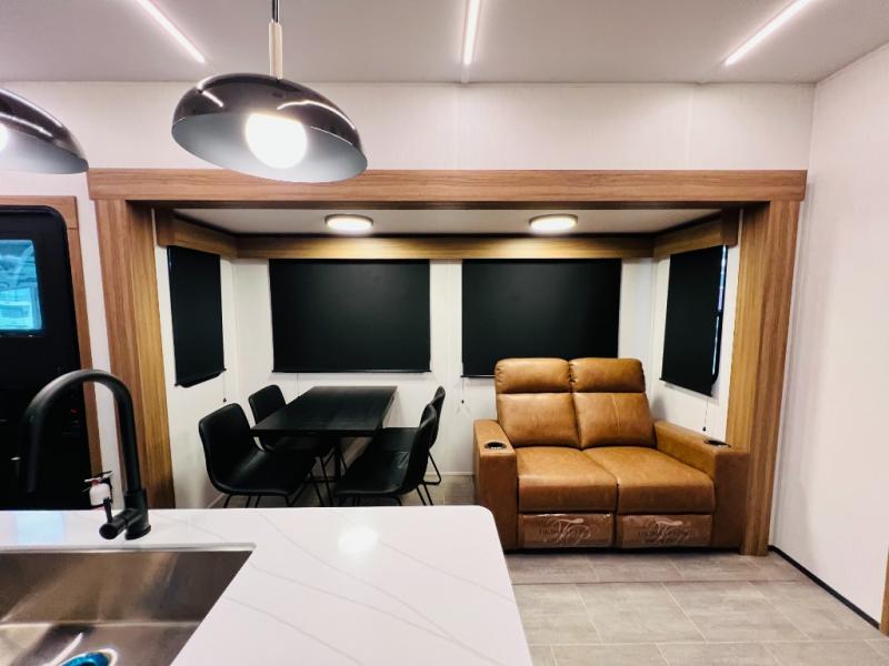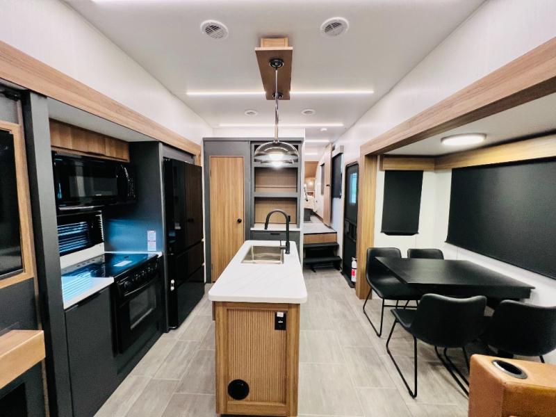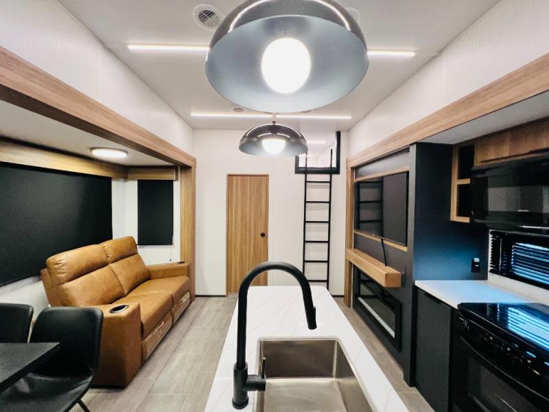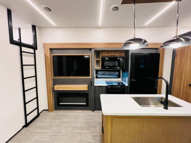 The whole family will love camping in this fifth wheel! It has everything you could need and then some, like the two full bathrooms and bedrooms. The front private bedroom has a queen bed with a wardrobe slide and a closet prepped to add a washer and dryer. The second bedroom has a queen bed slide that can be switched out for an optional sofa and a desk with TV prep, wardrobes, and a loft above it all, plus it has access to a full bathroom that also has one of the dual entry doors for easy access to the outdoors. The kitchen and living area will have you feeling right at home with a kitchen island, a 55" Smart TV and fireplace with hidden storage. There is even a wine rack and coffee bar for everyone to enjoy their favorite beverages. Enjoy your meals at the free standing table with four chairs. The residential furniture has footrests, hidden cup holders, and USB charging ports to keep your electronics at 100%!