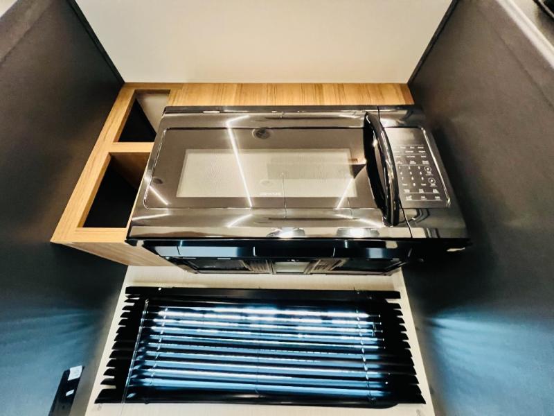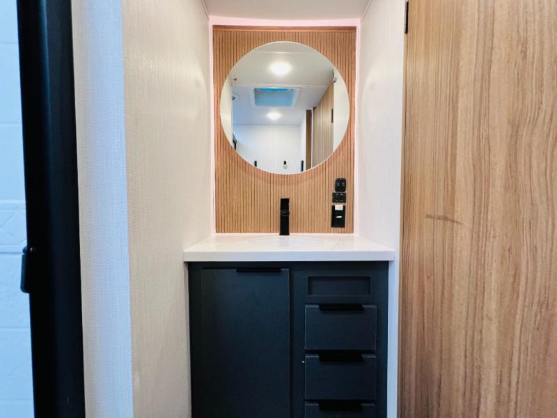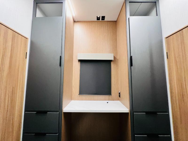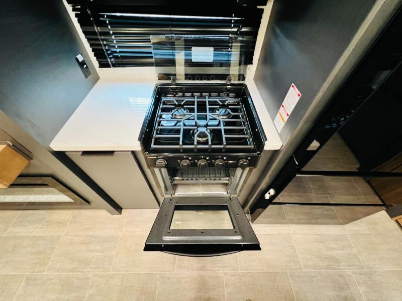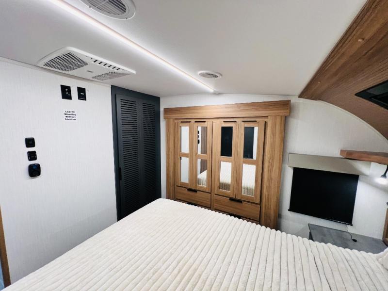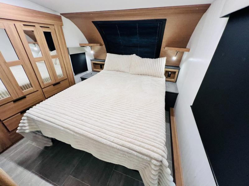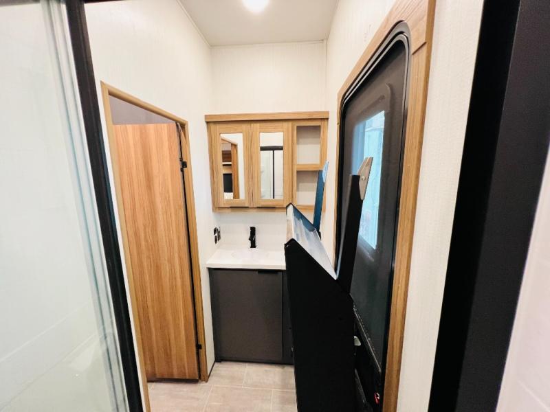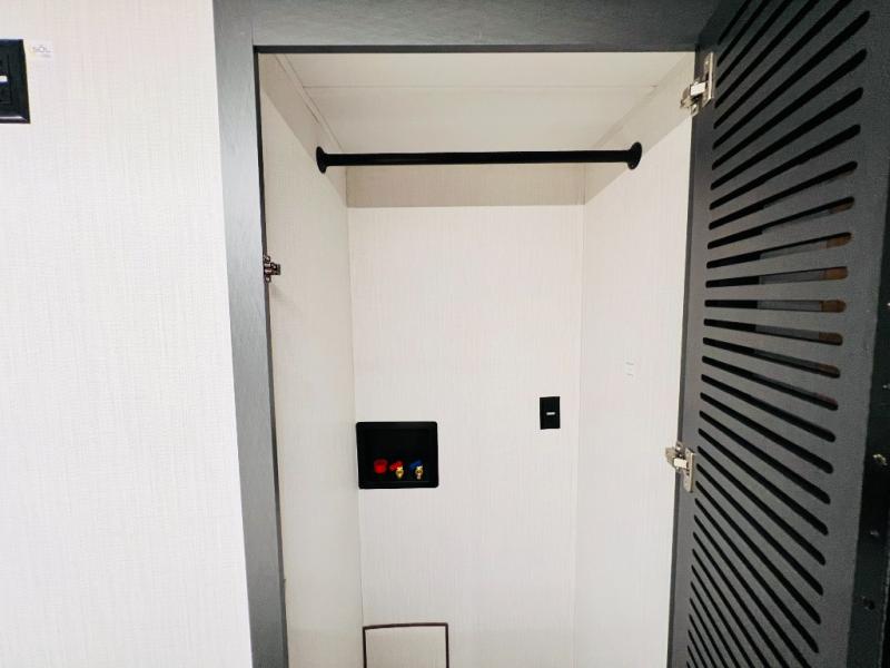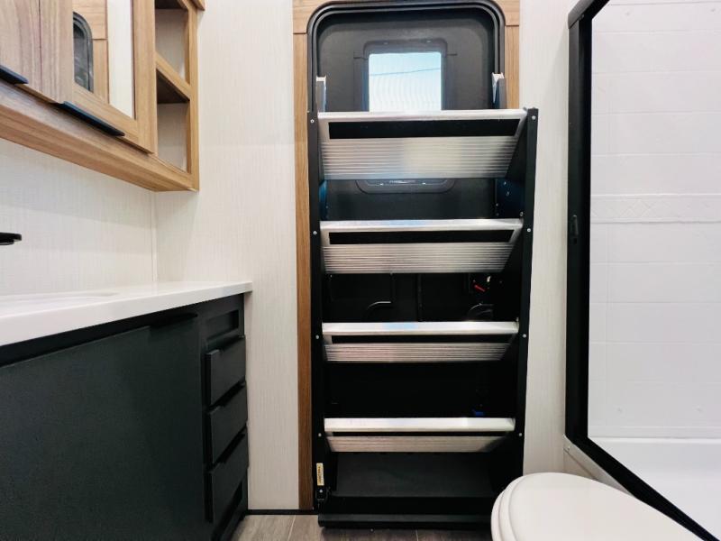 The whole family will love camping in this fifth wheel! It has everything you could need and then some, like the two full bathrooms and bedrooms. The front private bedroom has a queen bed with a wardrobe slide and a closet prepped to add a washer and dryer. The second bedroom has a queen bed slide that can be switched out for an optional sofa and a desk with TV prep, wardrobes, and a loft above it all, plus it has access to a full bathroom that also has one of the dual entry doors for easy access to the outdoors. The kitchen and living area will have you feeling right at home with a kitchen island, a 55" Smart TV and fireplace with hidden storage. There is even a wine rack and coffee bar for everyone to enjoy their favorite beverages. Enjoy your meals at the free standing table with four chairs. The residential furniture has footrests, hidden cup holders, and USB charging ports to keep your electronics at 100%!