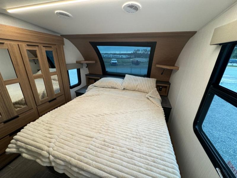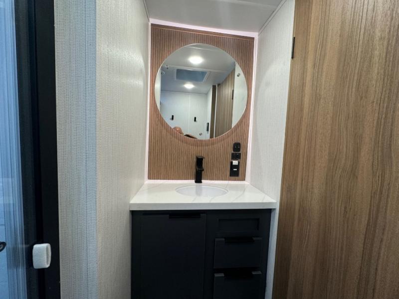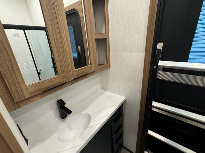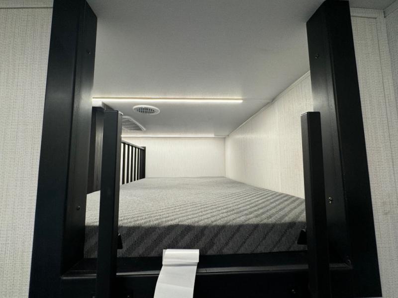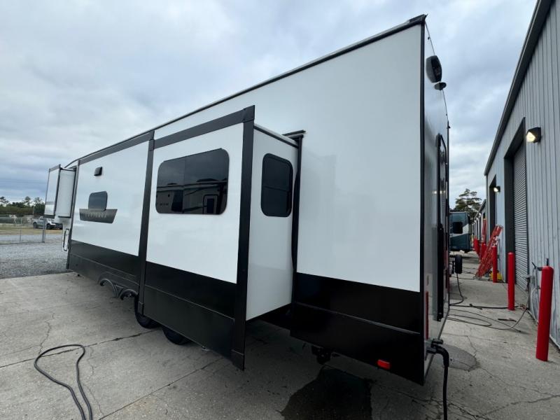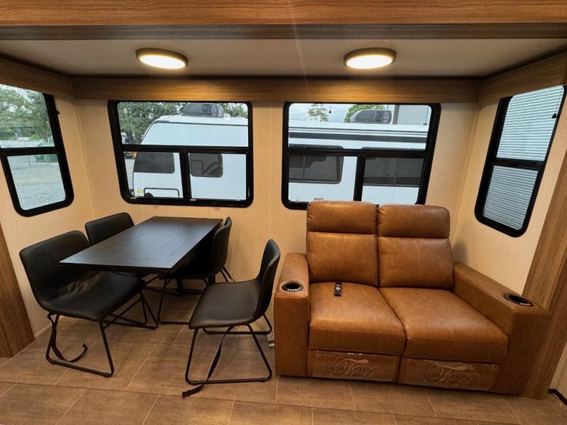 The whole family will love camping in this fifth wheel! It has everything you could need and then some, like the two full bathrooms and bedrooms. The front private bedroom has a queen bed with a wardrobe slide and a closet prepped to add a washer and dryer. The second bedroom has a queen bed slide that can be switched out for an optional sofa and a desk with TV prep, wardrobes, and a loft above it all, plus it has access to a full bathroom that also has one of the dual entry doors for easy access to the outdoors. The kitchen and living area will have you feeling right at home with a kitchen island, a 55" Smart TV and fireplace with hidden storage. There is even a wine rack and coffee bar for everyone to enjoy their favorite beverages. Enjoy your meals at the free standing table with four chairs. The residential furniture has footrests, hidden cup holders, and USB charging ports to keep your electronics at 100%!