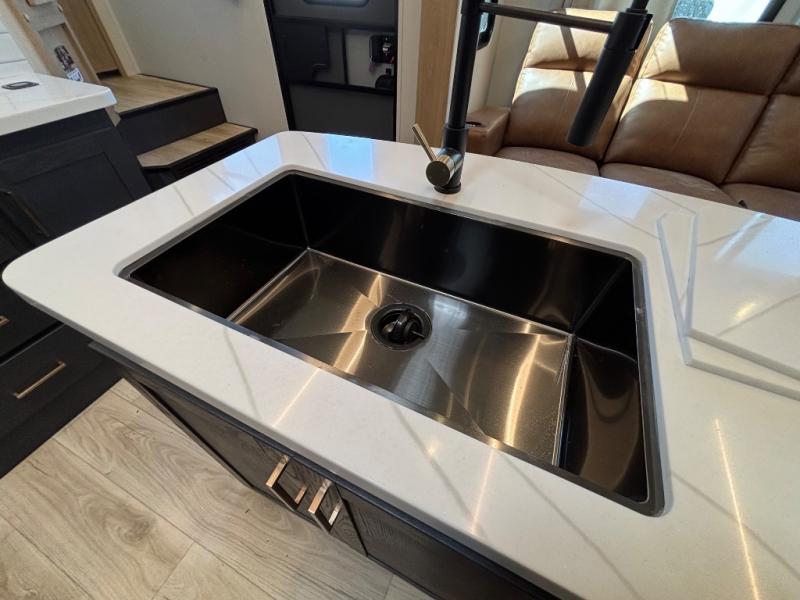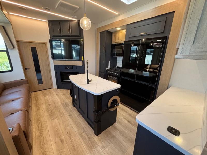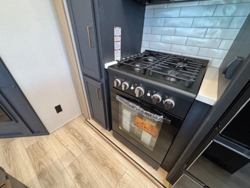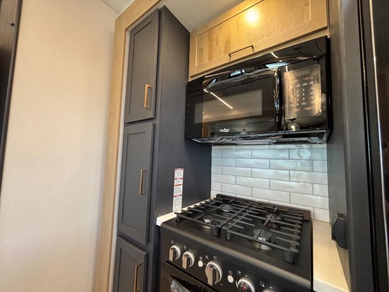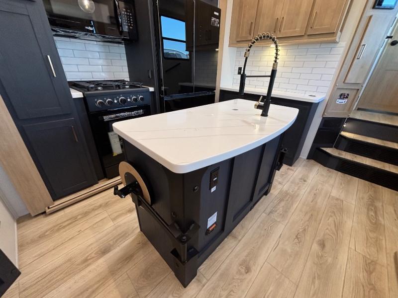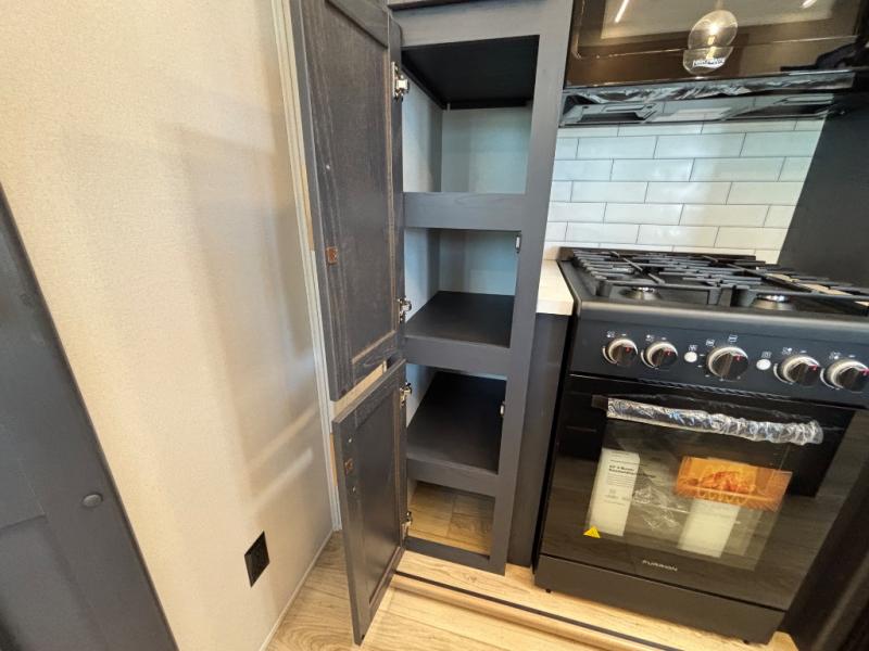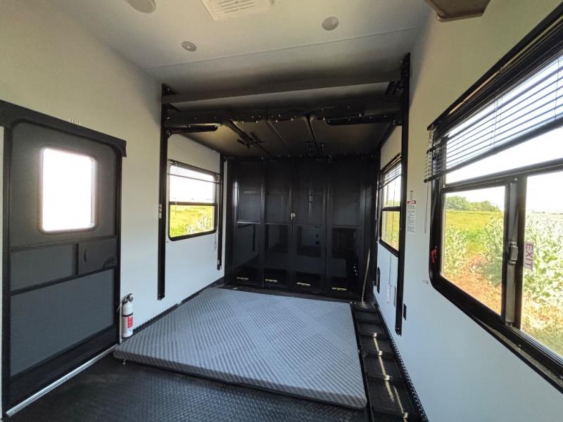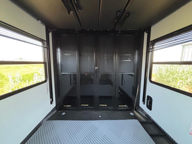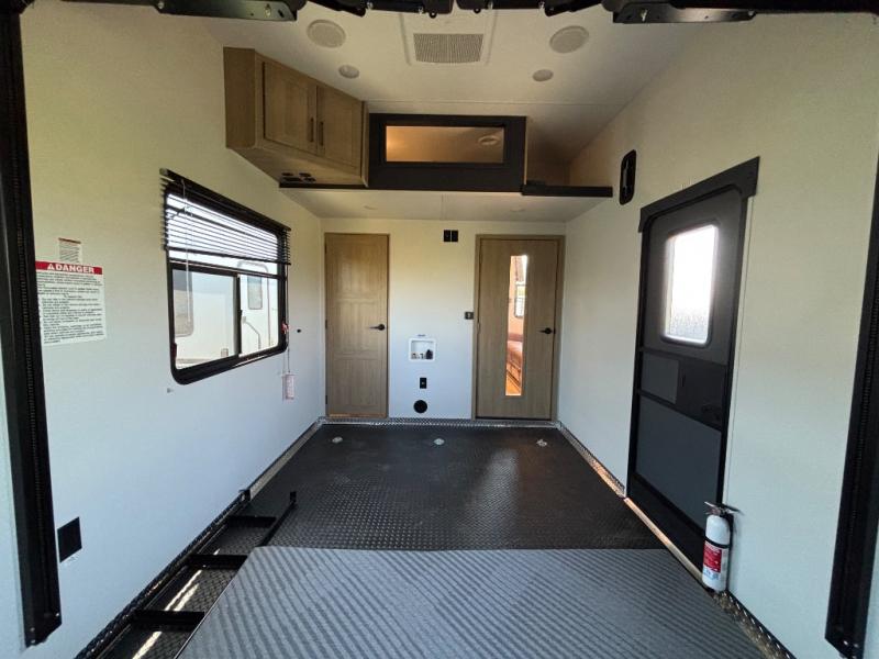 Trips to the lake or woods are made complete in this four slide out toy hauler. You can comfortably sleep eight people each night between the East to West tilting king bed, the electric queen bed with a bed underneath, plus the large sofa in the main living area. There is even a loft for the littles ones or you can use this space for storage! Having a bath and a half on board is sure to come in handy, along with dual entry doors and tons of storage space. This Cyclone kitchen is packed with everything you need while you're away from home, including a massive 24" stand alone oven, a hutch and a pantry for food storage, plus a kitchen island with swing out stools.