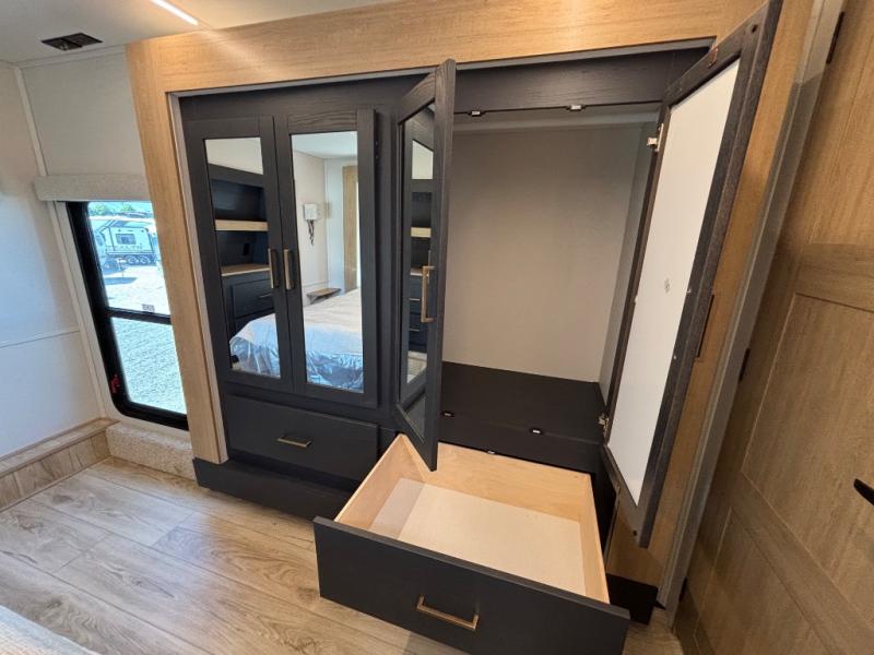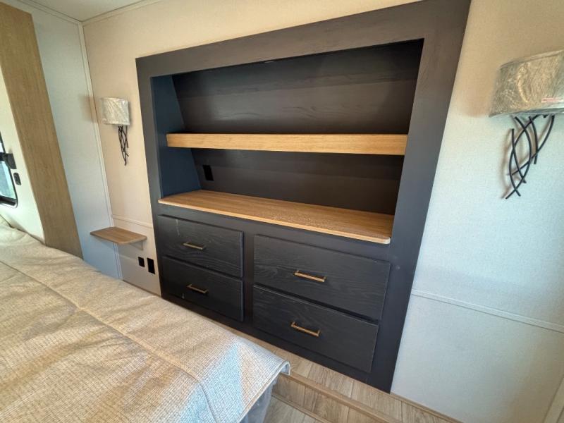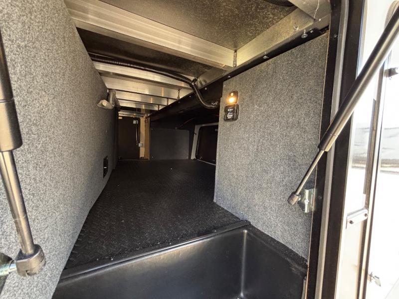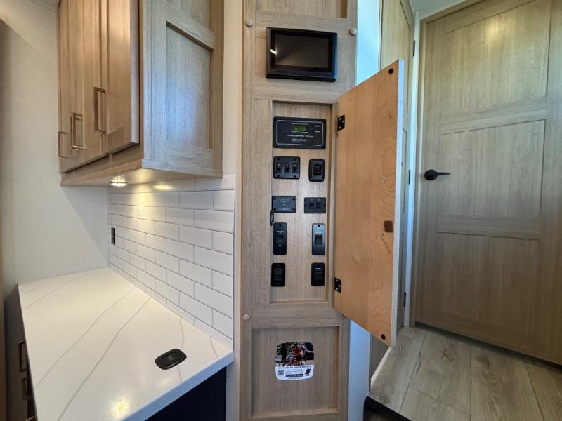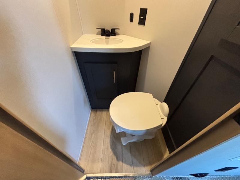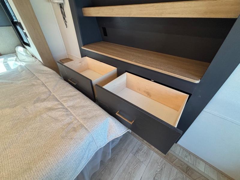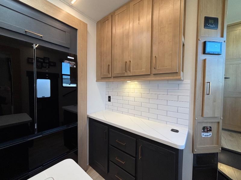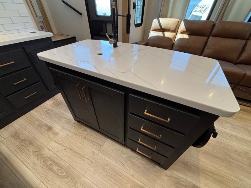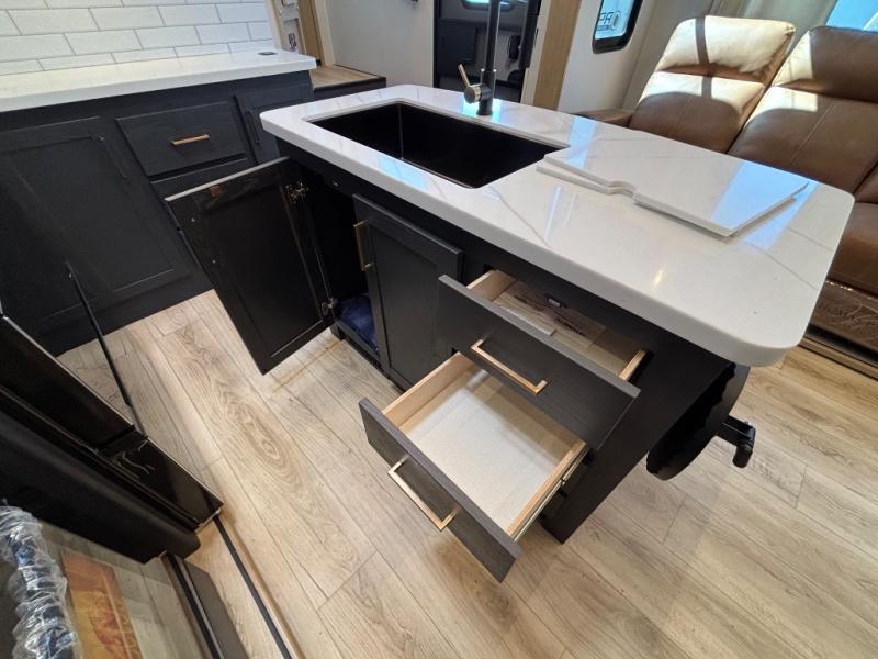 Trips to the lake or woods are made complete in this four slide out toy hauler. You can comfortably sleep eight people each night between the East to West tilting king bed, the electric queen bed with a bed underneath, plus the large sofa in the main living area. There is even a loft for the littles ones or you can use this space for storage! Having a bath and a half on board is sure to come in handy, along with dual entry doors and tons of storage space. This Cyclone kitchen is packed with everything you need while you're away from home, including a massive 24" stand alone oven, a hutch and a pantry for food storage, plus a kitchen island with swing out stools.