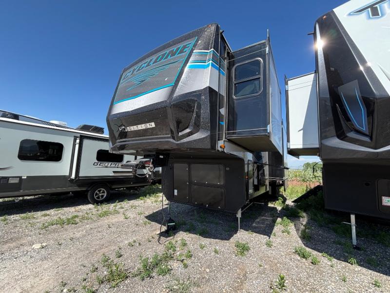Satisfy your wanderlust with a Heartland Cyclone fifth wheel toy hauler! You won't have to sacrifice any luxury either with indulgent features like the king bedroom suite with an exclusive East to West bed tilt system with 30% more floor space, Stor-Mor three-sided access to the basement with 30% more storage capacity, and Step Caddy folding patio step for better stability as you enter or exit the patio. The industry first Grill and Go 25" residential pull out three burner griddle combo comes on models with an exterior kitchen for an easier cooking experience. Full height shaker cabinetry provides 25% more storage space so you can bring more camping necessities with you. If you like to dry camp longer then you will appreciate the industry's largest 150 gallons fresh water tanks. Come find the perfect model for you today!