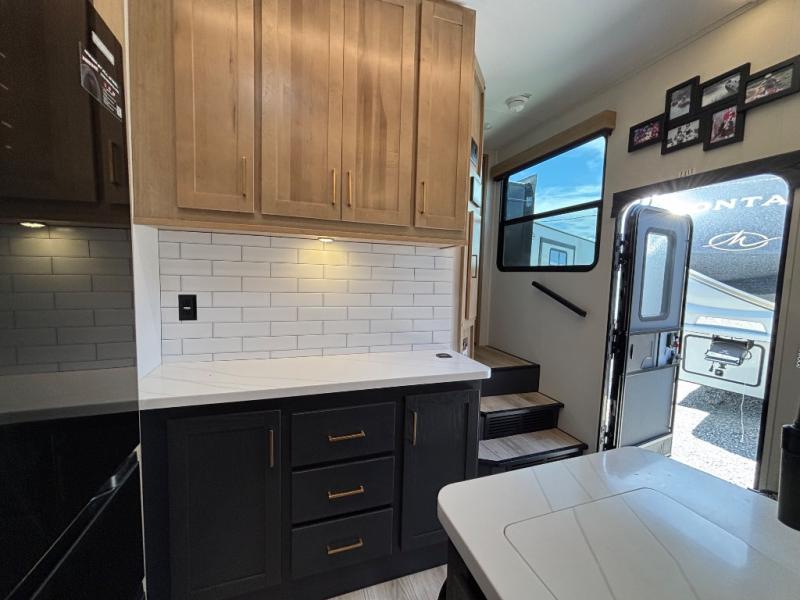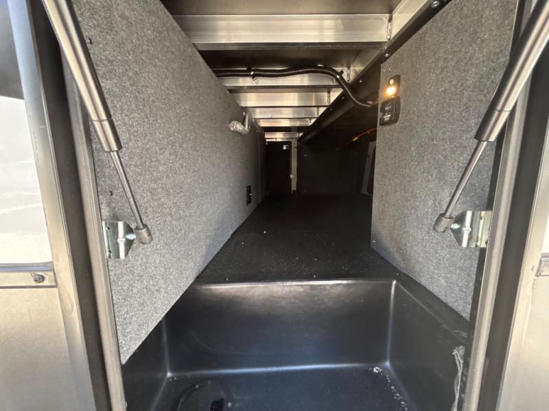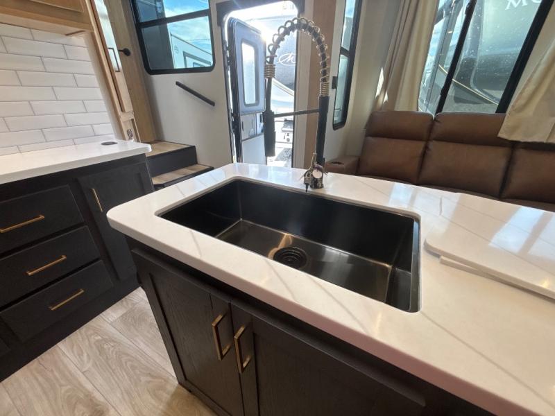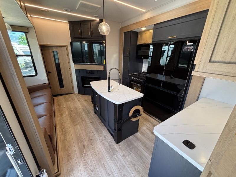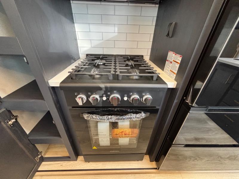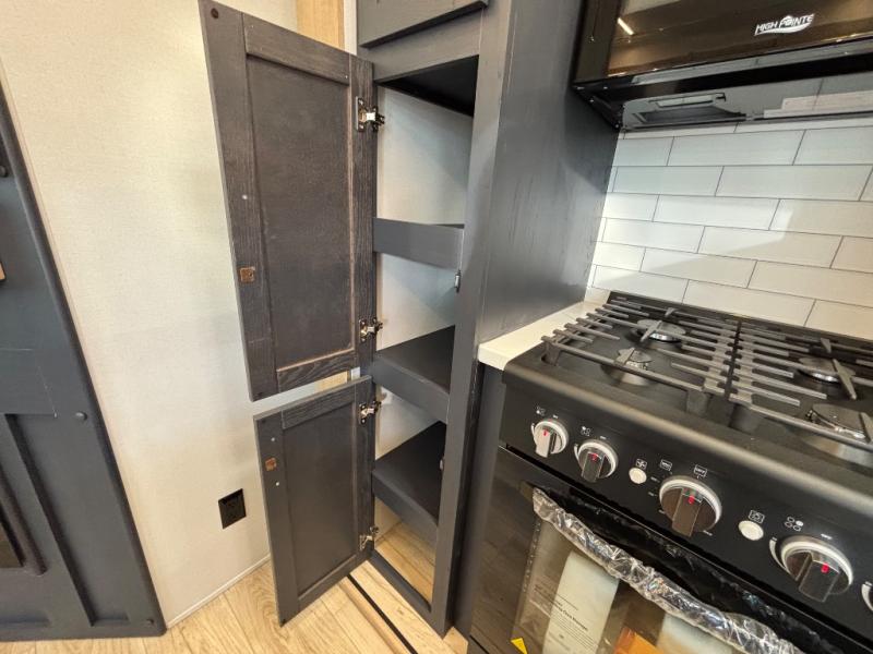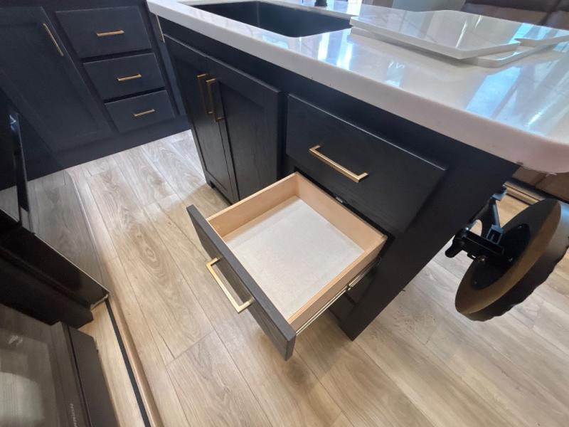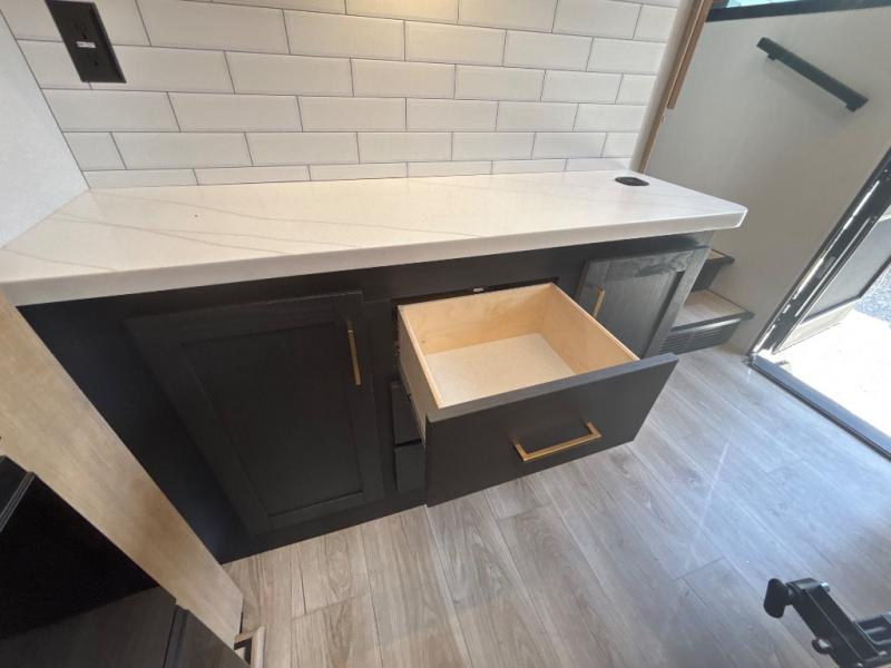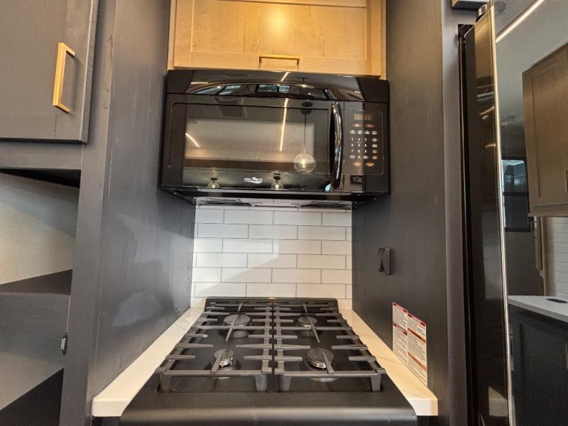 Trips to the lake or woods are made complete in this four slide out toy hauler. You can comfortably sleep eight people each night between the East to West tilting king bed, the electric queen bed with a bed underneath, plus the large sofa in the main living area. There is even a loft for the littles ones or you can use this space for storage! Having a bath and a half on board is sure to come in handy, along with dual entry doors and tons of storage space. This Cyclone kitchen is packed with everything you need while you're away from home, including a massive 24" stand alone oven, a hutch and a pantry for food storage, plus a kitchen island with swing out stools.