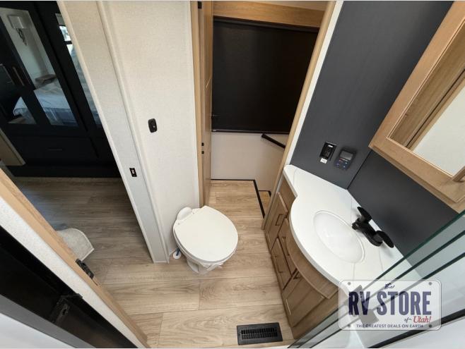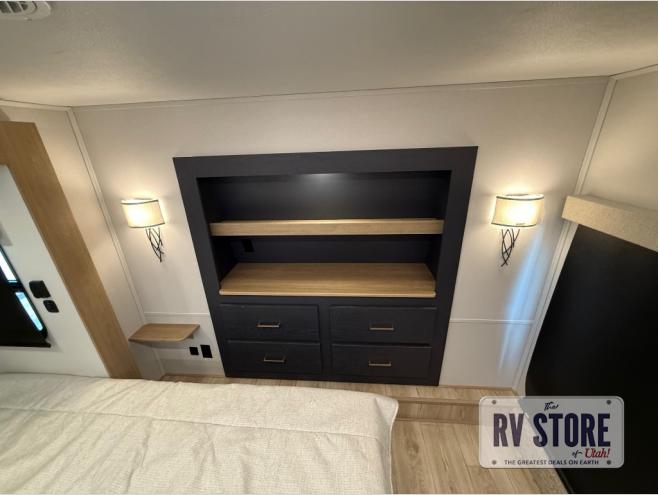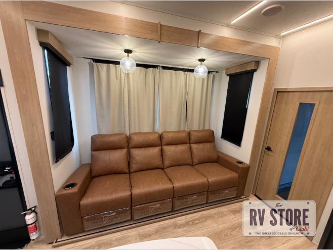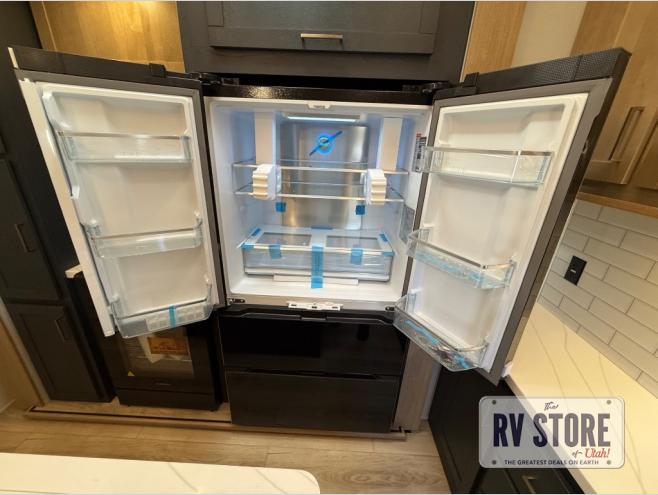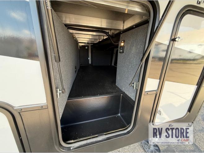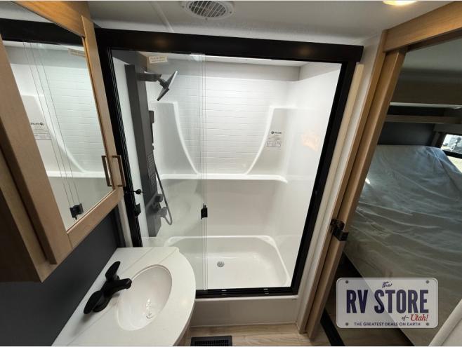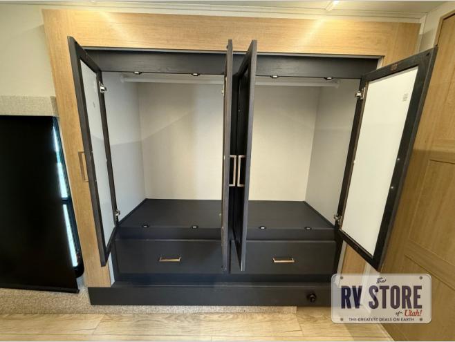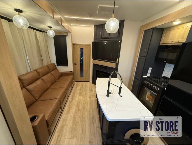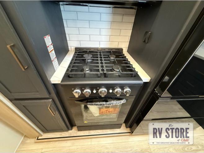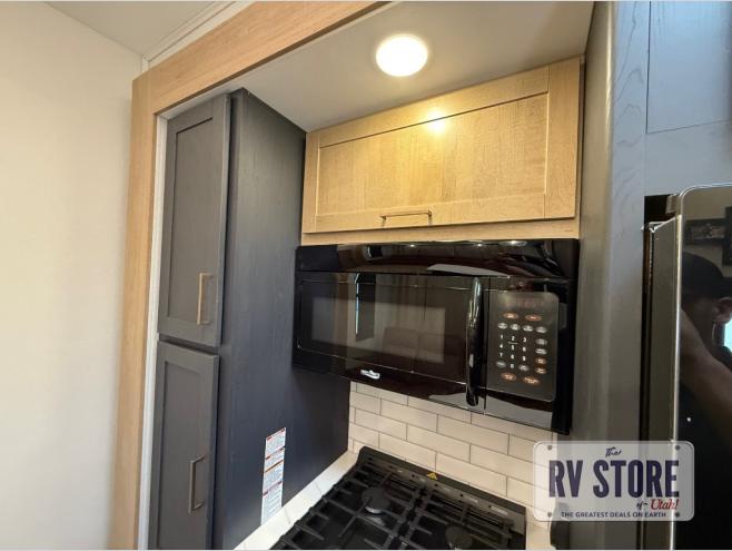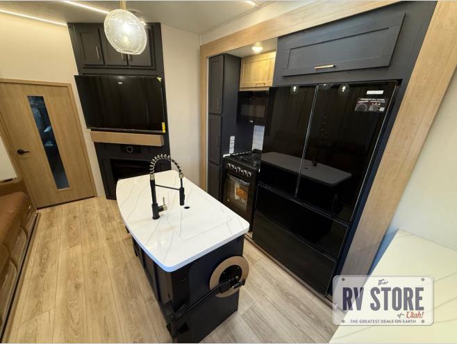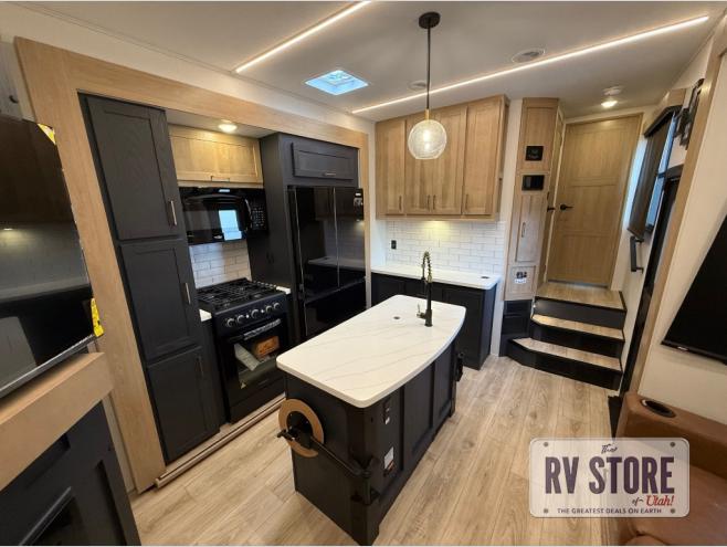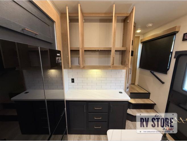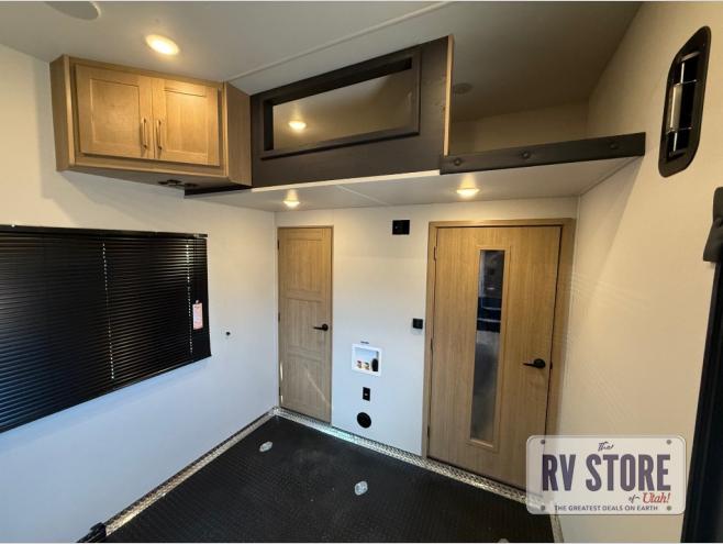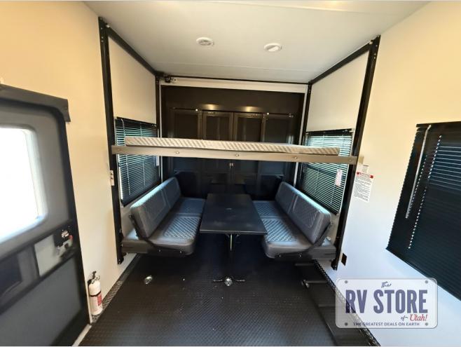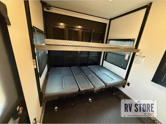 Trips to the lake or woods are made complete in this four slide out toy hauler. You can comfortably sleep eight people each night between the East to West tilting king bed, the electric queen bed with a bed underneath, plus the large sofa in the main living area. There is even a loft for the littles ones or you can use this space for storage! Having a bath and a half on board is sure to come in handy, along with dual entry doors and tons of storage space. This Cyclone kitchen is packed with everything you need while you're away from home, including a massive 24" stand alone oven, a hutch and a pantry for food storage, plus a kitchen island with swing out stools.