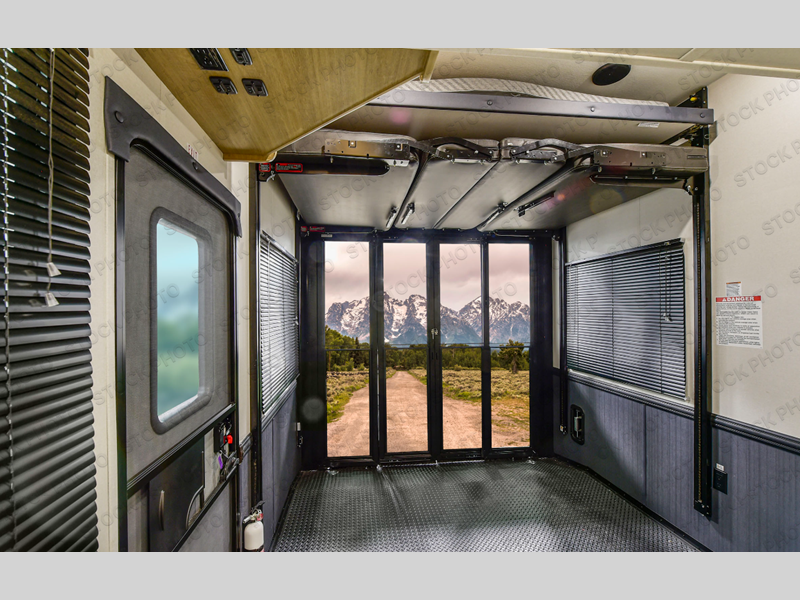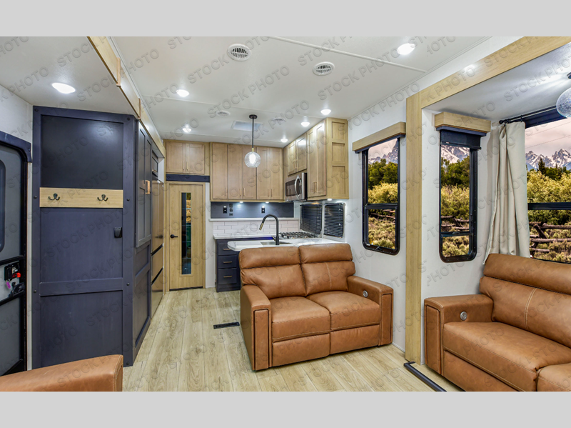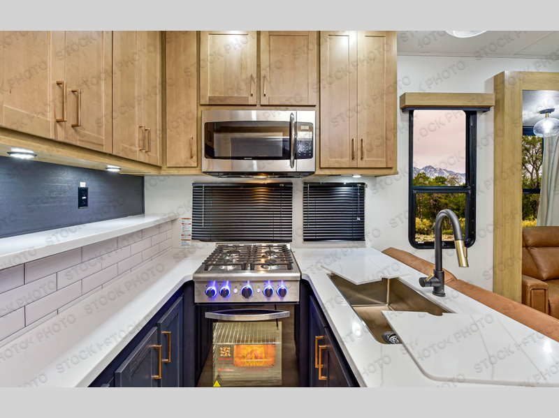 Everyone will have a comfortable place to sit in this toy hauler with the dual opposing theater seating slides and the third theater seating across from the 50" LCD HDTV! The 3,000 lb. weather resistant 8' ramp door makes it easy to load your toys into the 13' garage, and your guest can make this their bedroom at night. Here, you'll find an electric queen bed with a split bench seat/bed underneath, a half bath, plus a loft. There is even washer and dryer prep for wash day! The kitchen includes plenty of countertop space to prepare your best home cooked meals, or you can head outside to cook on the outdoor Grill N Go three burner griddle combo!