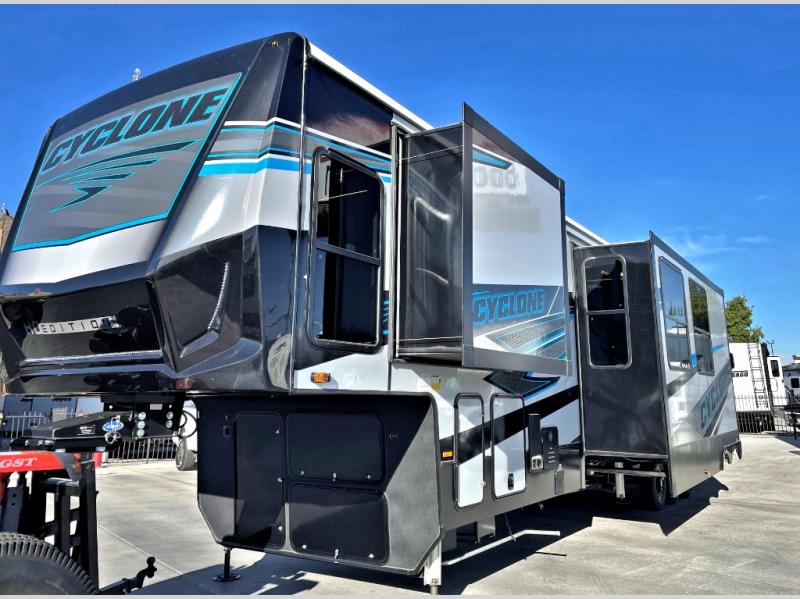 Satisfy your wanderlust with a Heartland Cyclone fifth wheel toy hauler! You won't have to sacrifice any luxury either with indulgent features like the king bedroom suite with an exclusive East to West bed tilt system with 30% more floor space, Stor-Mor three-sided access to the basement with 30% more storage capacity, and Step Caddy folding patio step for better stability as you enter or exit the patio. The industry first Grill and Go 25" residential pull out 3 burner griddle combo comes on models with an exterior kitchen for an easier cooking experience. Full height shaker cabinetry provides 25% more storage space so you can bring more camping necessities with you. If you like to dry camp longer then you will appreciate the industry's largest 150 gallons fresh water tanks. Come find the perfect model for you today!