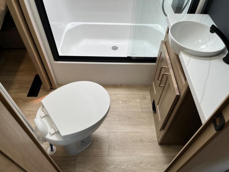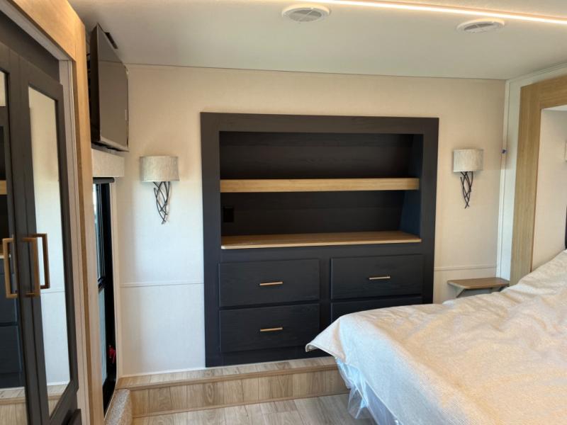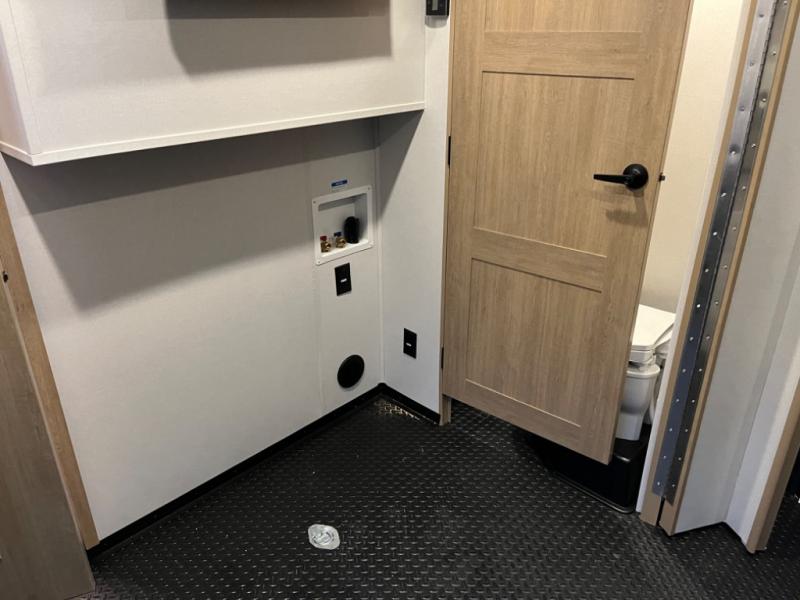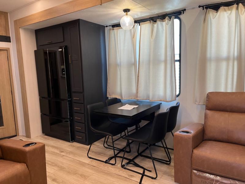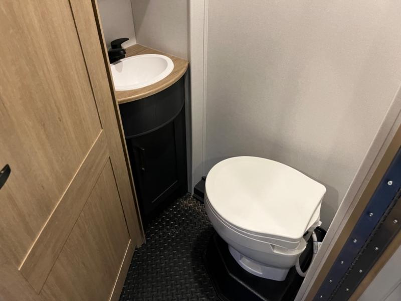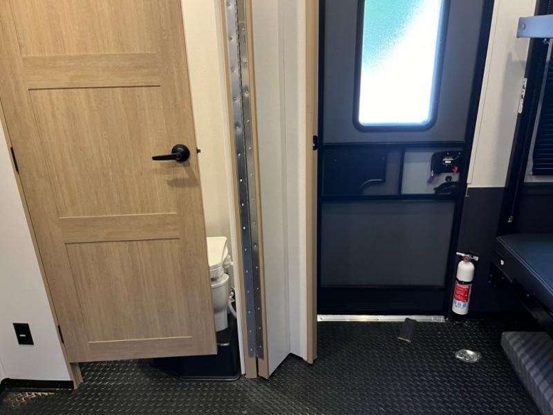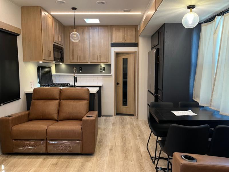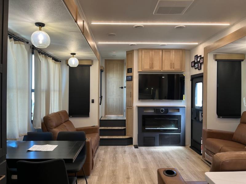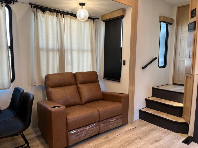 Head to the trails in this spacious toy hauler for eight campers! There is a 13' 6" garage with an electric bed and a split bench seat/bed for guests, plus a half bath and a loft for more sleeping space or storage! You will have your own bedroom up front with a tilting king bed slide out, two wardrobes, and a private entry door into the dual entry full bath. The living room will be a favorite place to visit since there are three sofa in great view of the 50" LCD HDTV, and the free-standing table will provide a place to dine at each day. The chef of your group will have everything they need to prepare meals, including a residential microwave and massive 24" stand-alone oven, or they may just find themselves using the exterior Grill and Go. There is also a 20' awning outside and an exterior TV to watch the big game with campground neighbors!