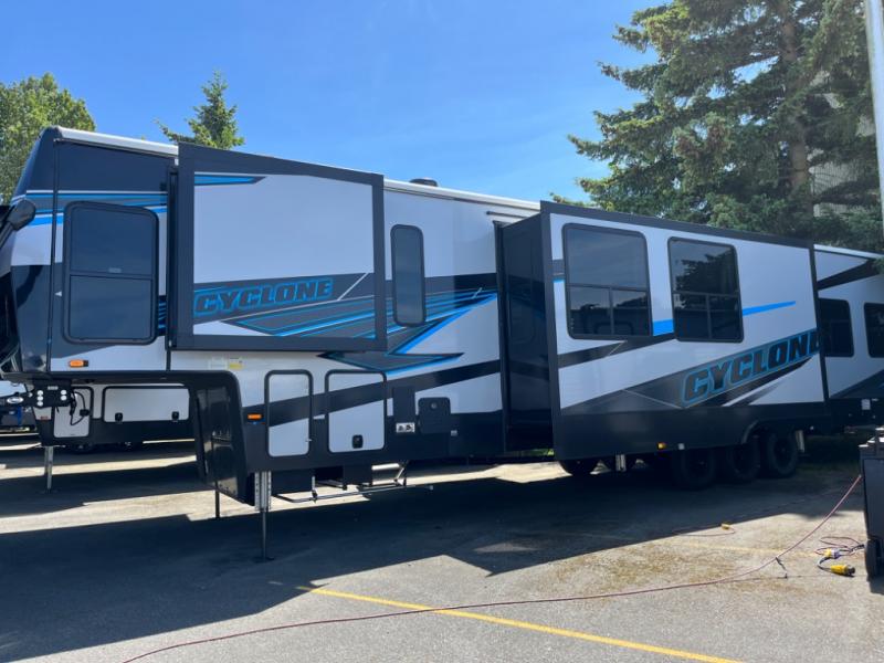 Satisfy your wanderlust with a Heartland Cyclone fifth wheel toy hauler! You won't have to sacrifice any luxury either with indulgent features like the king bedroom suite with an exclusive East to West bed tilt system with 30% more floor space, Stor-Mor three-sided access to the basement with 30% more storage capacity, and Step Caddy folding patio step for better stability as you enter or exit the patio. The industry first Grill and Go 25" residential pull out 3 burner griddle combo comes on models with an exterior kitchen for an easier cooking experience. Full height shaker cabinetry provides 25% more storage space so you can bring more camping necessities with you. If you like to dry camp longer then you will appreciate the industry's largest 150 gallons fresh water tanks. Come find the perfect model for you today!