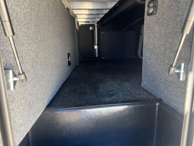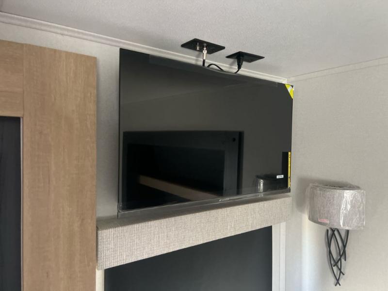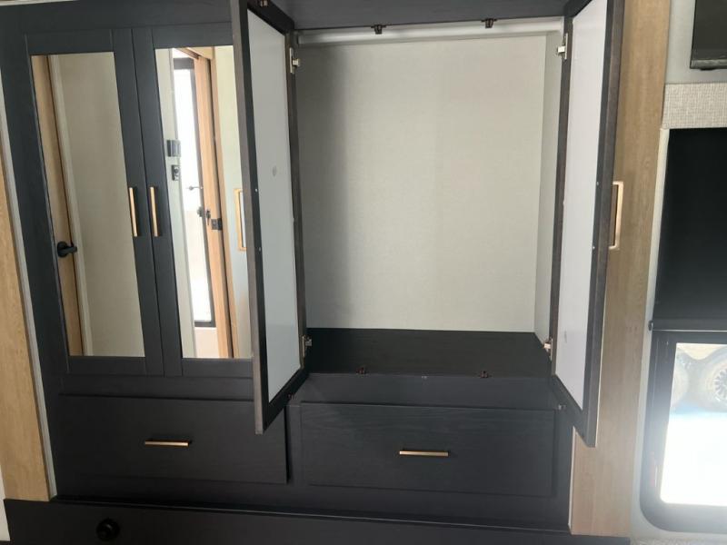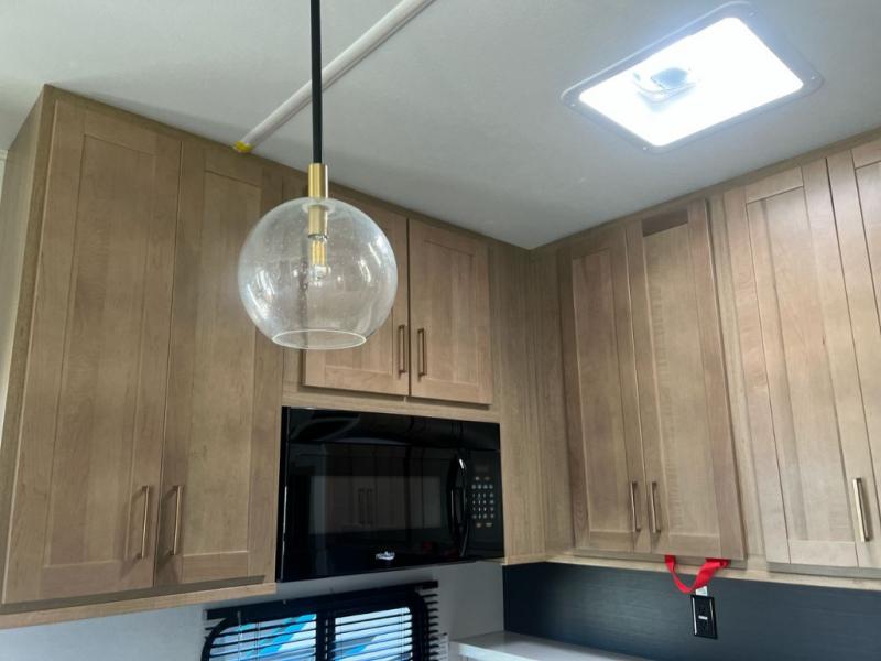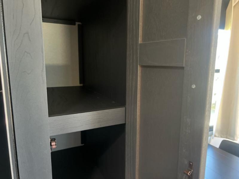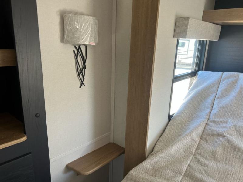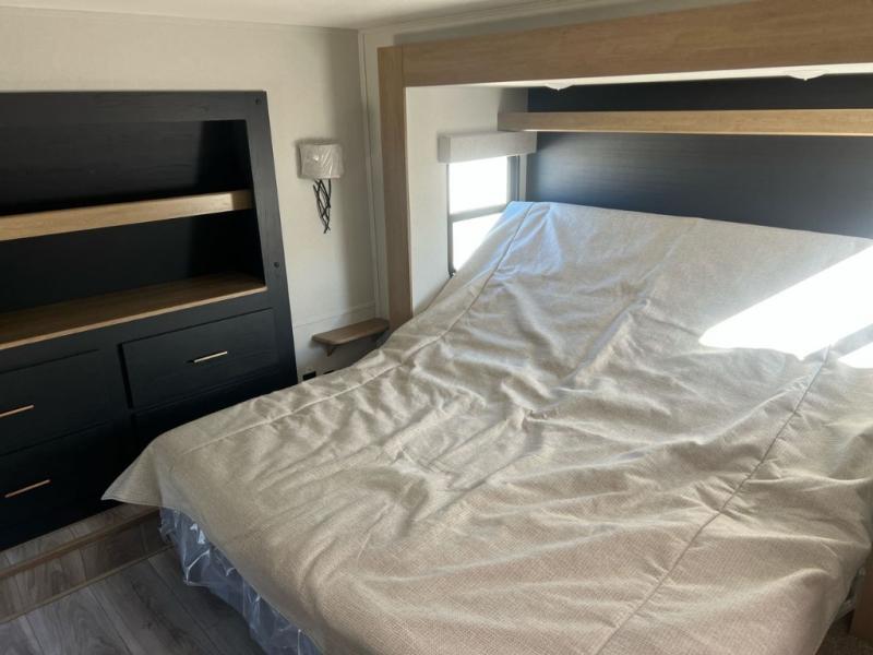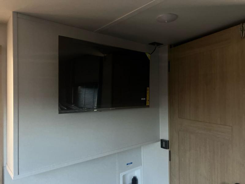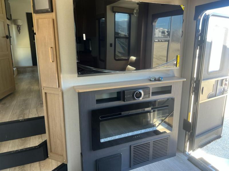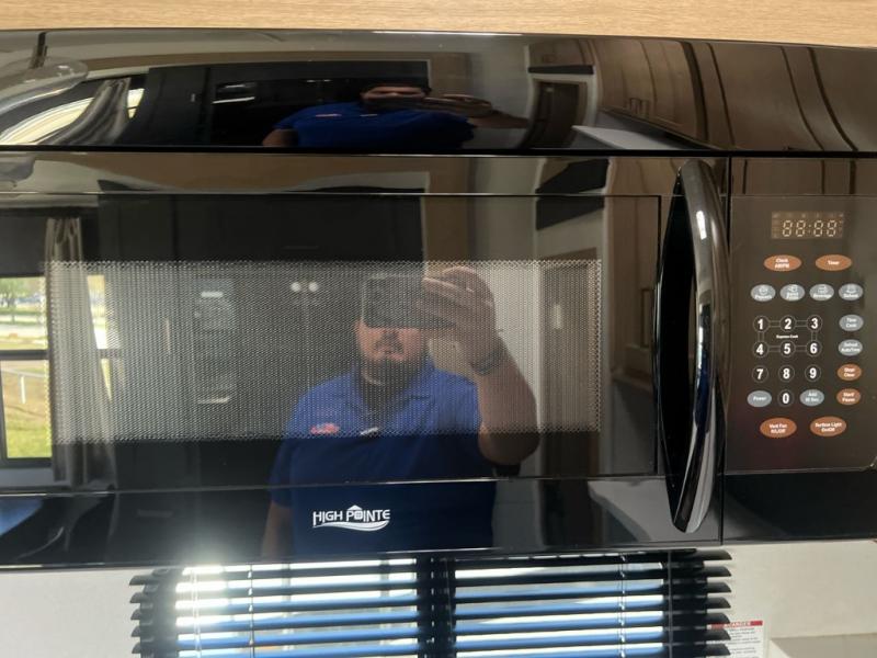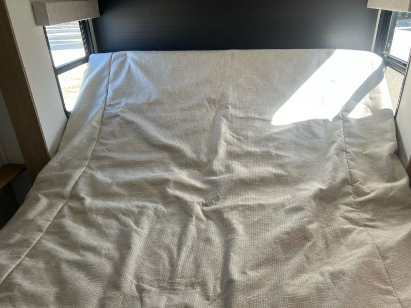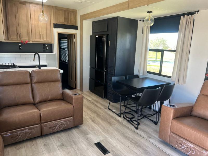 Head to the trails in this spacious toy hauler for eight campers! There is a 13' 6" garage with an electric bed and a split bench seat/bed for guests, plus a half bath and a loft for more sleeping space or storage! You will have your own bedroom up front with a tilting king bed slide out, two wardrobes, and a private entry door into the dual entry full bath. The living room will be a favorite place to visit since there are three sofa in great view of the 50" LCD HDTV, and the free-standing table will provide a place to dine at each day. The chef of your group will have everything they need to prepare meals, including a residential microwave and massive 24" stand-alone oven, or they may just find themselves using the exterior Grill and Go. There is also a 20' awning outside and an exterior TV to watch the big game with campground neighbors!