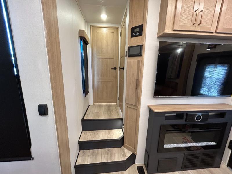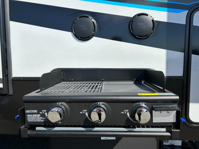 - Outdoor Luxury Package: Lippert Keyless Blue Tooth Entry Doors, 50 AMP Electric Power Cord Reel, Mor-Ryde Safety