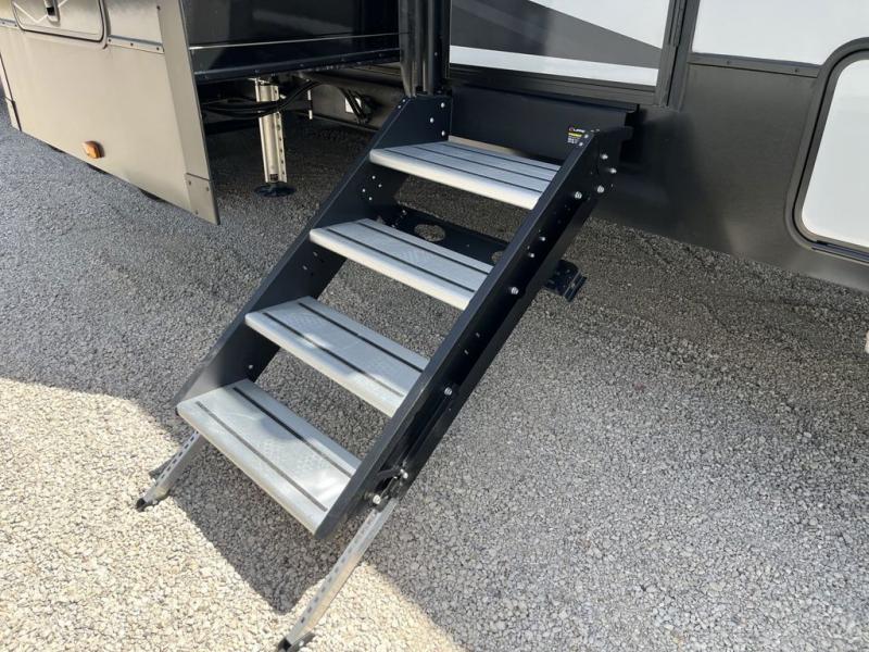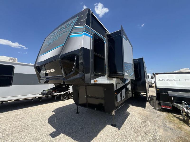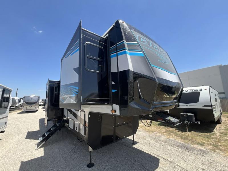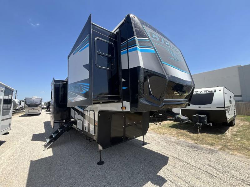 Satisfy your wanderlust with a Heartland Cyclone fifth wheel toy hauler! You won't have to sacrifice any luxury either with indulgent features like the king bedroom suite with an exclusive East to West bed tilt system with 30% more floor space, Stor-Mor three-sided access to the basement with 30% more storage capacity, and Step Caddy folding patio step for better stability as you enter or exit the patio. The industry first Grill and Go 25" residential pull out 3 burner griddle combo comes on models with an exterior kitchen for an easier cooking experience. Full height shaker cabinetry provides 25% more storage space so you can bring more camping necessities with you. If you like to dry camp longer then you will appreciate the industry's largest 150 gallons fresh water tanks. Come find the perfect model for you today!