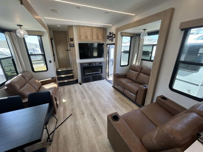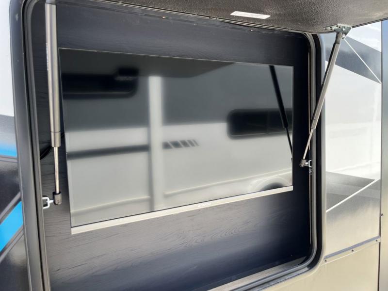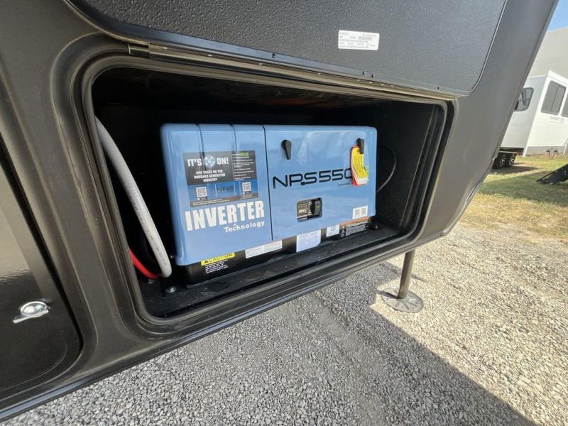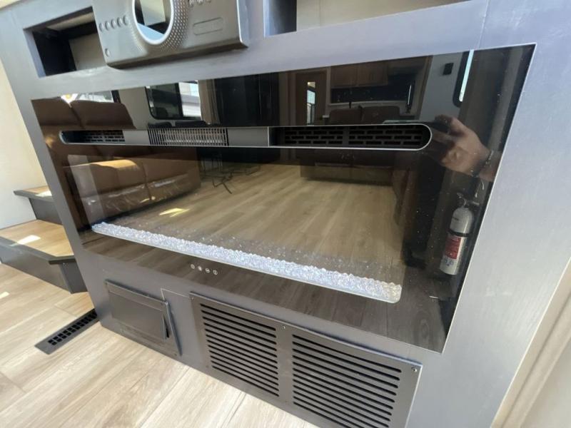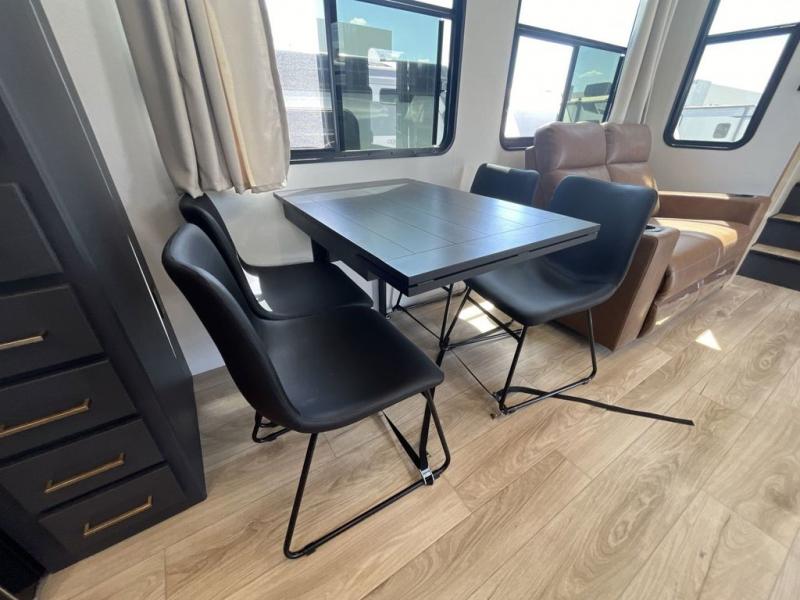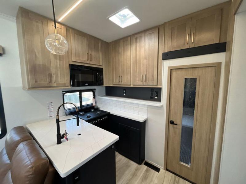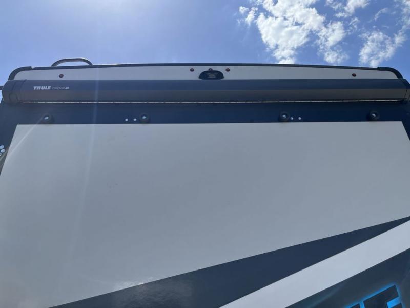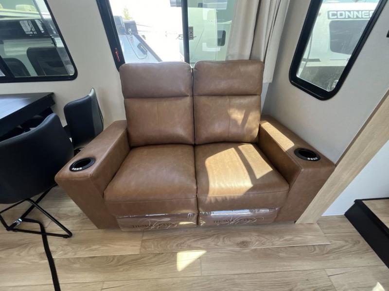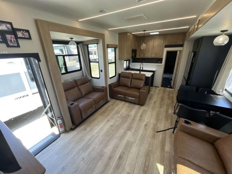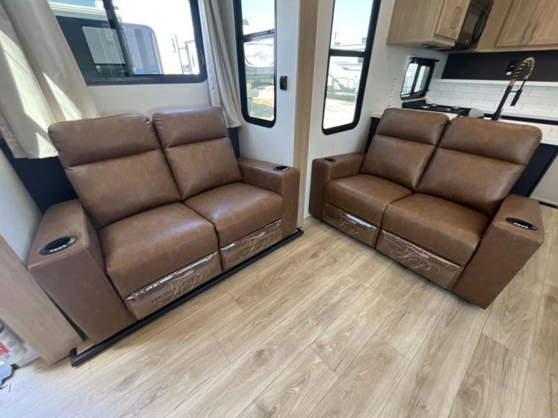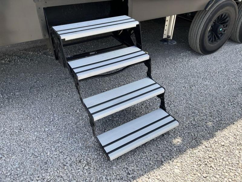 Head to the trails in this spacious toy hauler for eight campers! There is a 13' 6" garage with an electric bed and a split bench seat/bed for guests, plus a half bath and a loft for more sleeping space or storage! You will have your own bedroom up front with a tilting king bed slide out, two wardrobes, and a private entry door into the dual entry full bath. The living room will be a favorite place to visit since there are three sofa in great view of the 50" LCD HDTV, and the free-standing table will provide a place to dine at each day. The chef of your group will have everything they need to prepare meals, including a residential microwave and massive 24" stand-alone oven, or they may just find themselves using the exterior Grill and Go. There is also a 20' awning outside and an exterior TV to watch the big game with campground neighbors!