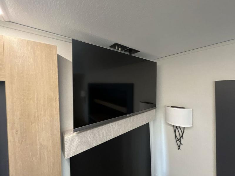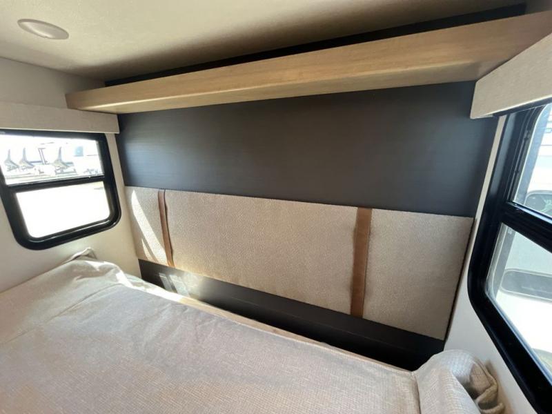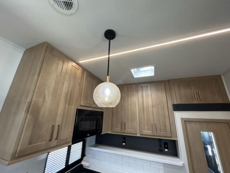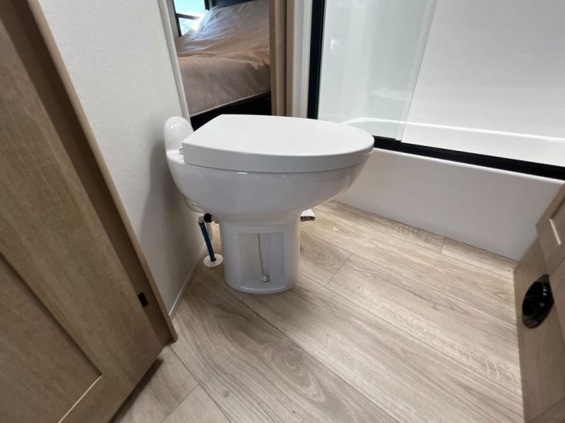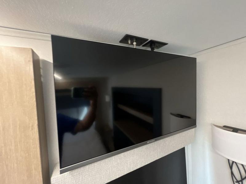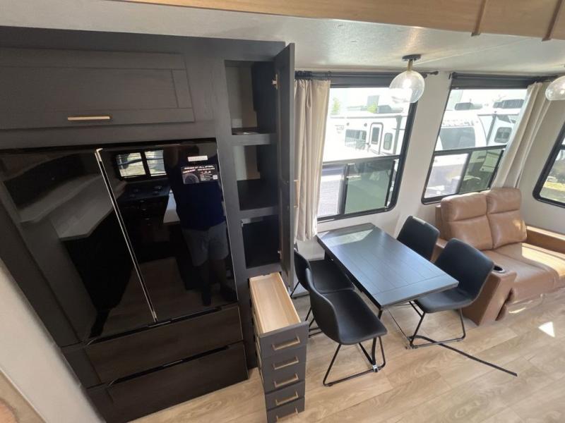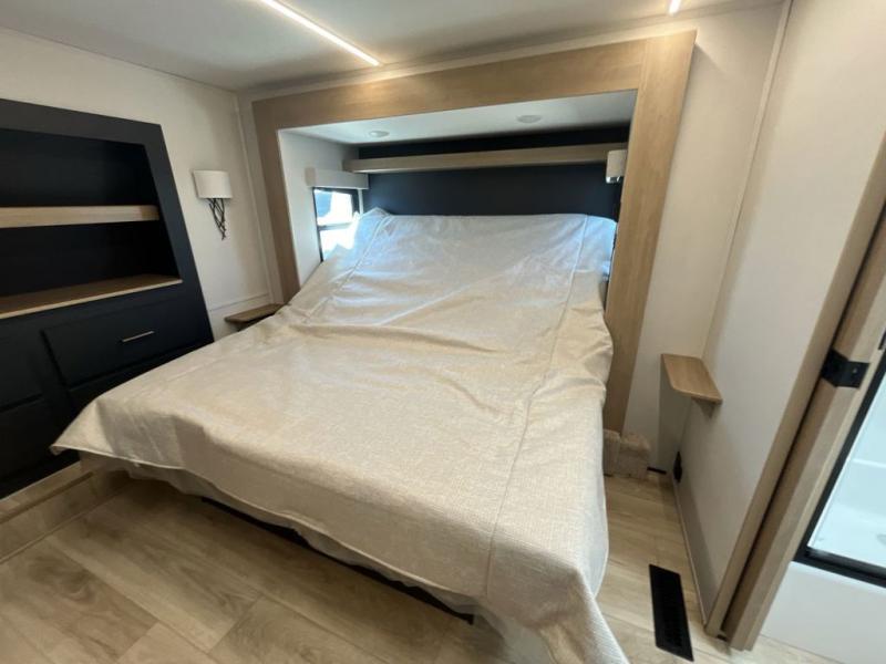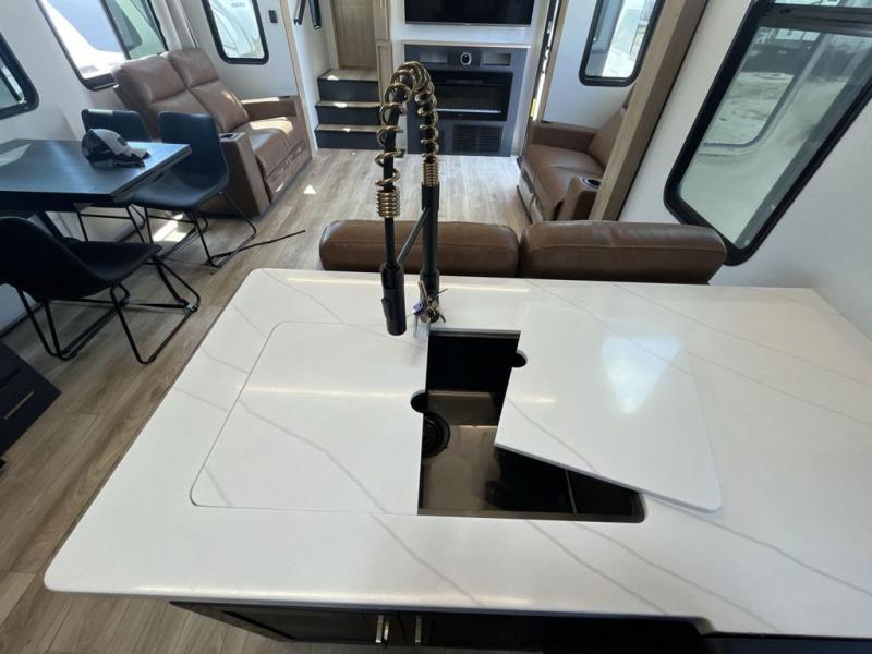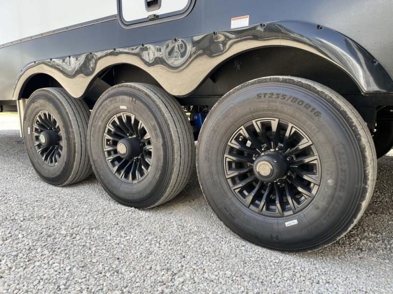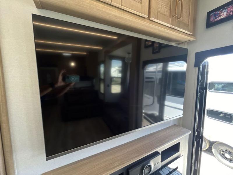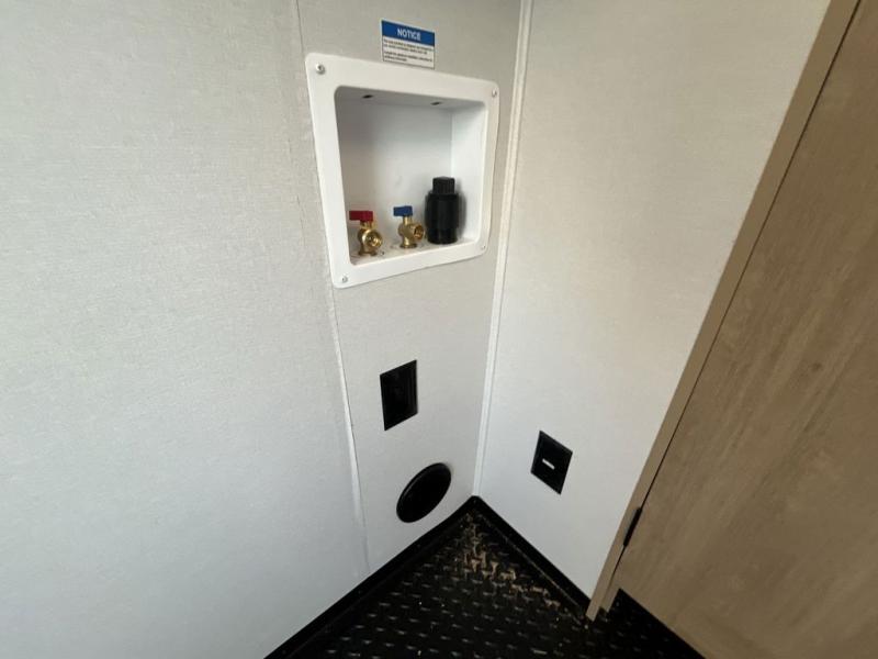 Head to the trails in this spacious toy hauler for eight campers! There is a 13' 6" garage with an electric bed and a split bench seat/bed for guests, plus a half bath and a loft for more sleeping space or storage! You will have your own bedroom up front with a tilting king bed slide out, two wardrobes, and a private entry door into the dual entry full bath. The living room will be a favorite place to visit since there are three sofa in great view of the 50" LCD HDTV, and the free-standing table will provide a place to dine at each day. The chef of your group will have everything they need to prepare meals, including a residential microwave and massive 24" stand-alone oven, or they may just find themselves using the exterior Grill and Go. There is also a 20' awning outside and an exterior TV to watch the big game with campground neighbors!