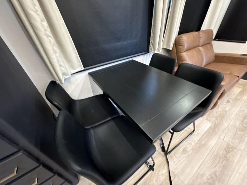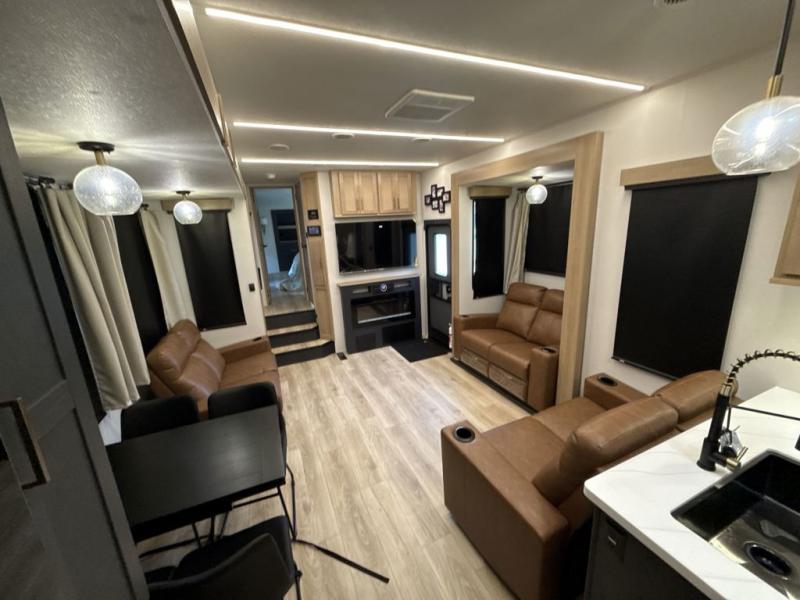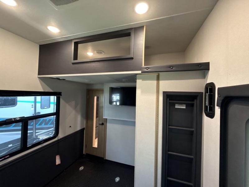 Head to the trails in this spacious toy hauler for eight campers! There is a 13' 6" garage with an electric bed and a split bench seat/bed for guests, plus a half bath and a loft for more sleeping space or storage! You will have your own bedroom up front with a tilting king bed slide out, two wardrobes, and a private entry door into the dual entry full bath. The living room will be a favorite place to visit since there are three sofa in great view of the 50" LCD HDTV, and the free-standing table will provide a place to dine at each day. The chef of your group will have everything they need to prepare meals, including a residential microwave and massive 24" stand-alone oven, or they may just find themselves using the exterior Grill and Go. There is also a 20' awning outside and an exterior TV to watch the big game with campground neighbors!