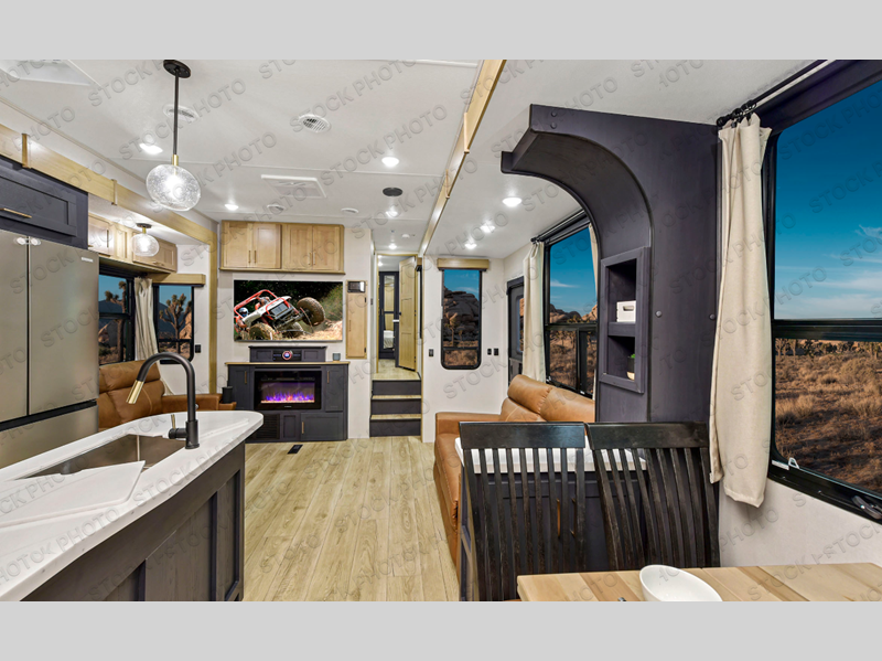 This toy hauler with two full bathrooms is a clean decision! You can prepare delicious home cooked meals for everyone in the fully equipped kitchen with island peninsula for plenty of prepping space, plus there is a hutch to store your dishes. The garage has a bathroom with a neo-angled shower so mud doesn't get tracked throughout the rest of the unit and two loft areas for extra sleeping space. With two awnings, you are sure to stay protected rain or shine and one of the awnings even protects the Grill N Go three burner griddle combo. Enjoy a good night's rest on the tilting king bed slide, keep your clothes looking their best with the front wardrobe, and the washer and dryer prep give you the option to make laundry day easier than ever. You will also have quick access into the dual entry bath!