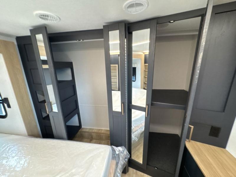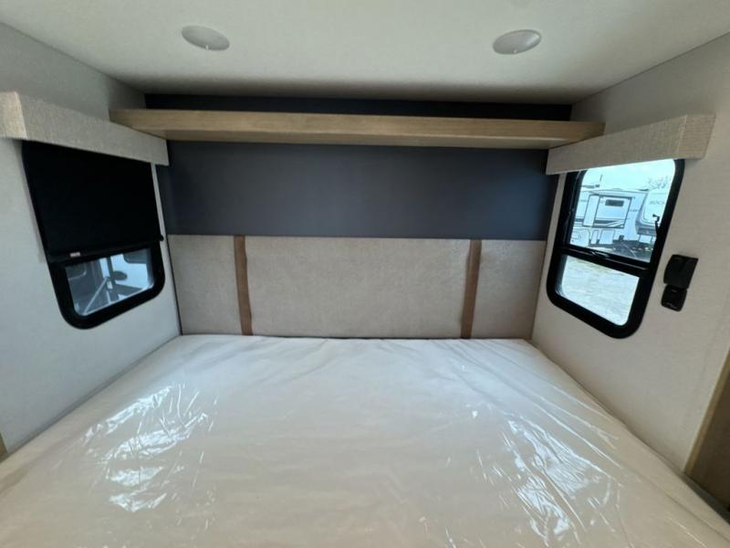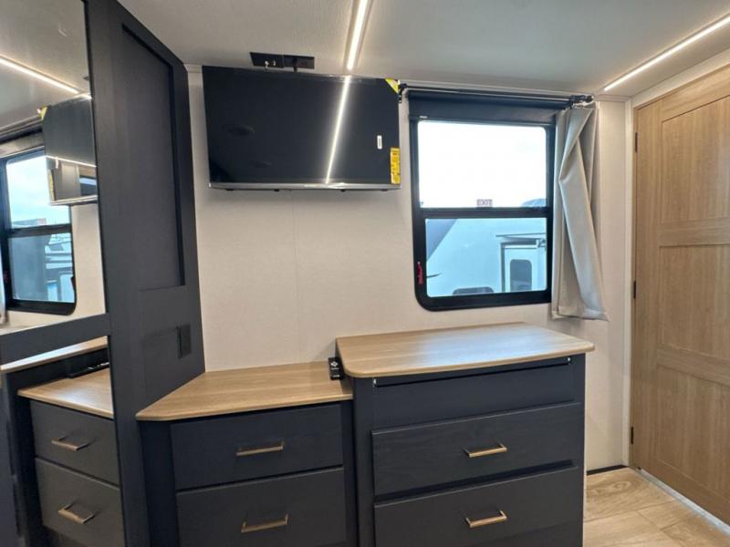 This toy hauler with two full bathrooms is a clean decision! You can prepare delicious home cooked meals for everyone in the fully equipped kitchen with island peninsula for plenty of prepping space, plus there is a hutch to store your dishes. The garage has a bathroom with a neo-angled shower so mud doesn't get tracked throughout the rest of the unit and two loft areas for extra sleeping space. With two awnings, you are sure to stay protected rain or shine and one of the awnings even protects the Grill N Go three burner griddle combo. Enjoy a good night's rest on the tilting king bed slide, keep your clothes looking their best with the front wardrobe, and the washer and dryer prep give you the option to make laundry day easier than ever. You will also have quick access into the dual entry bath!