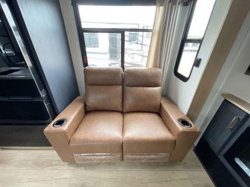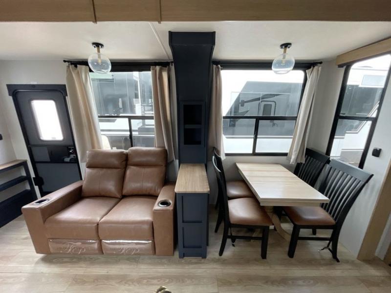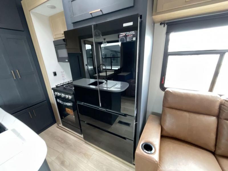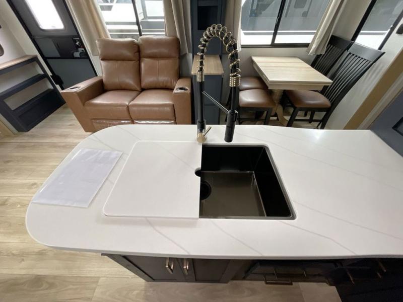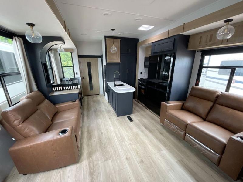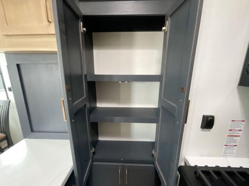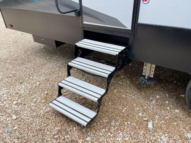 This toy hauler with two full bathrooms is a clean decision! You can prepare delicious home cooked meals for everyone in the fully equipped kitchen with island peninsula for plenty of prepping space, plus there is a hutch to store your dishes. The garage has a bathroom with a neo-angled shower so mud doesn't get tracked throughout the rest of the unit and two loft areas for extra sleeping space. With two awnings, you are sure to stay protected rain or shine and one of the awnings even protects the Grill N Go three burner griddle combo. Enjoy a good night's rest on the tilting king bed slide, keep your clothes looking their best with the front wardrobe, and the washer and dryer prep give you the option to make laundry day easier than ever. You will also have quick access into the dual entry bath!