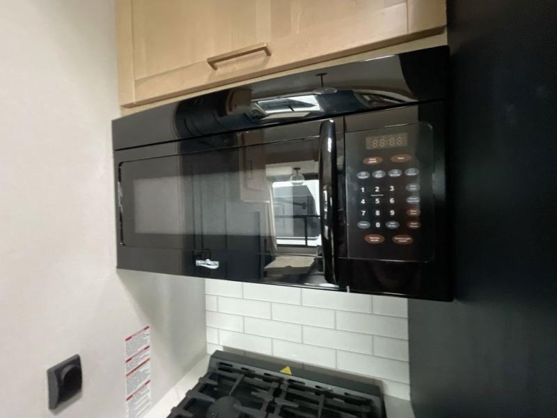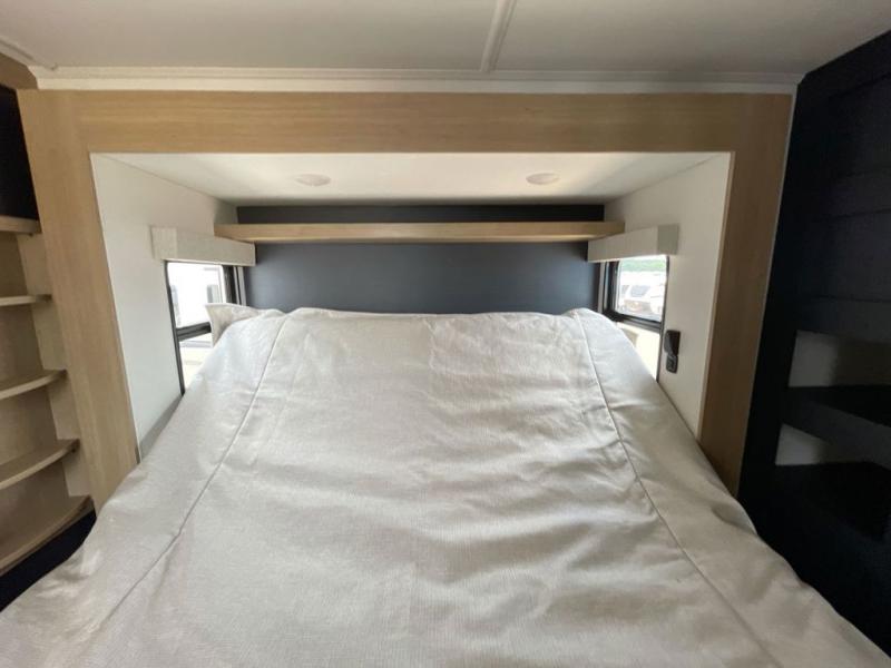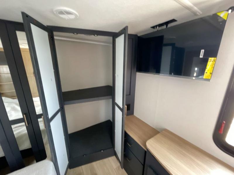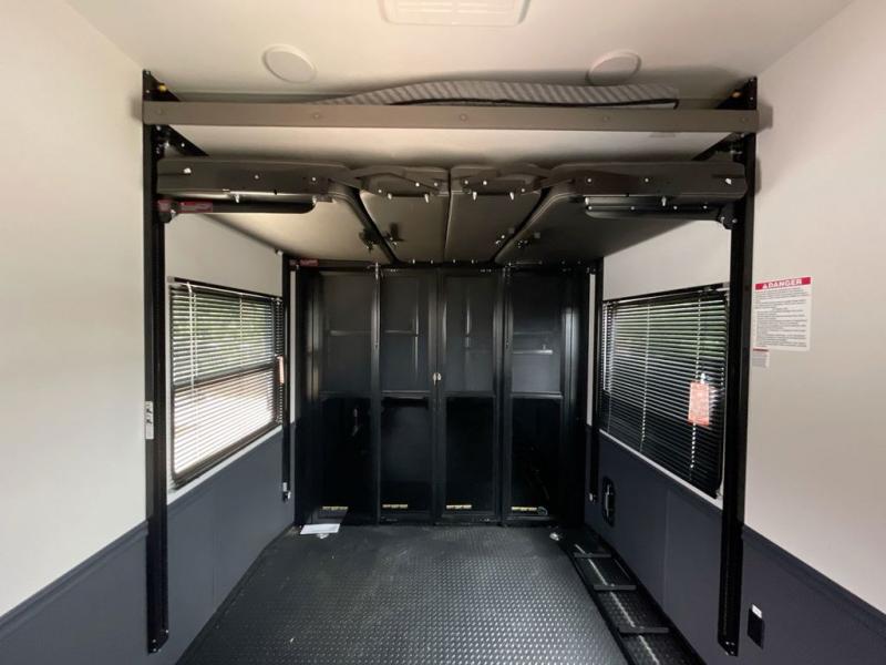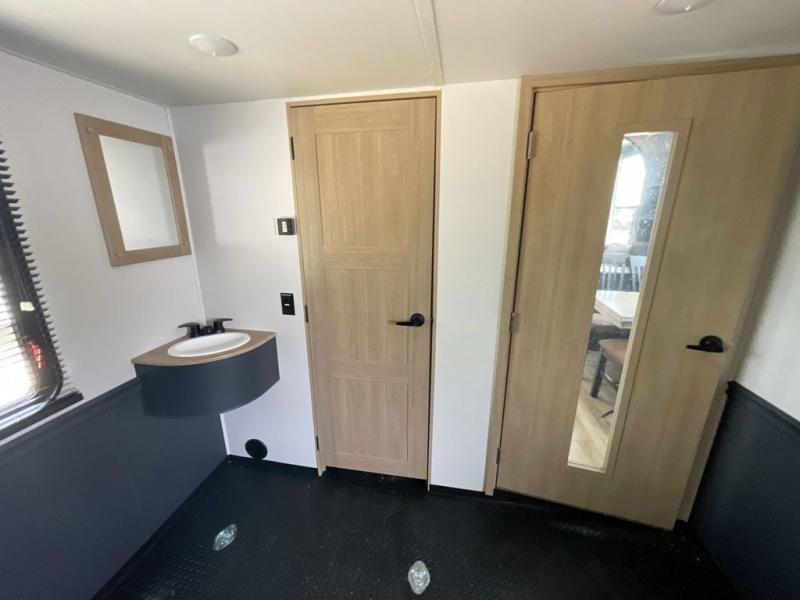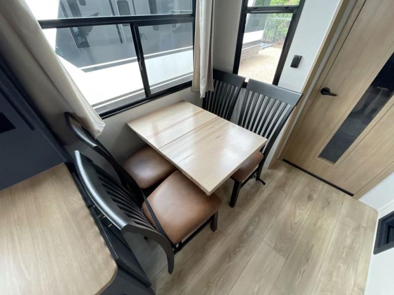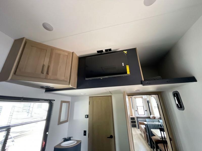 This toy hauler with two full bathrooms is a clean decision! You can prepare delicious home cooked meals for everyone in the fully equipped kitchen with island peninsula for plenty of prepping space, plus there is a hutch to store your dishes. The garage has a bathroom with a neo-angled shower so mud doesn't get tracked throughout the rest of the unit and two loft areas for extra sleeping space. With two awnings, you are sure to stay protected rain or shine and one of the awnings even protects the Grill N Go three burner griddle combo. Enjoy a good night's rest on the tilting king bed slide, keep your clothes looking their best with the front wardrobe, and the washer and dryer prep give you the option to make laundry day easier than ever. You will also have quick access into the dual entry bath!