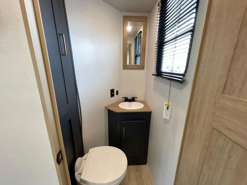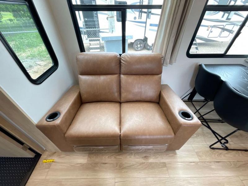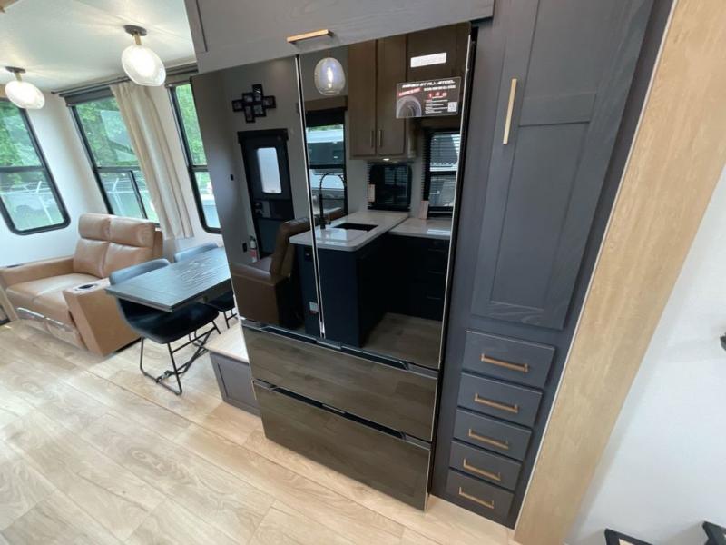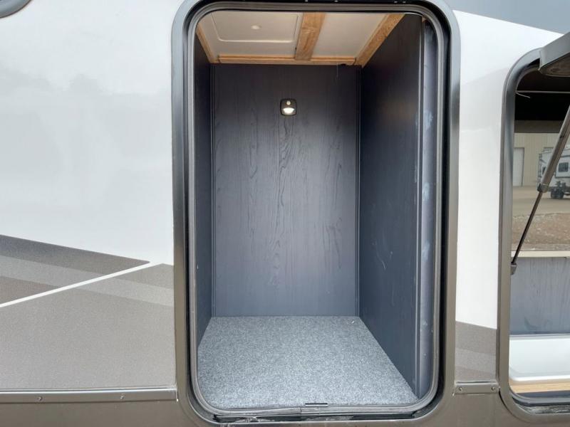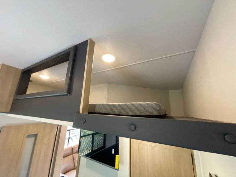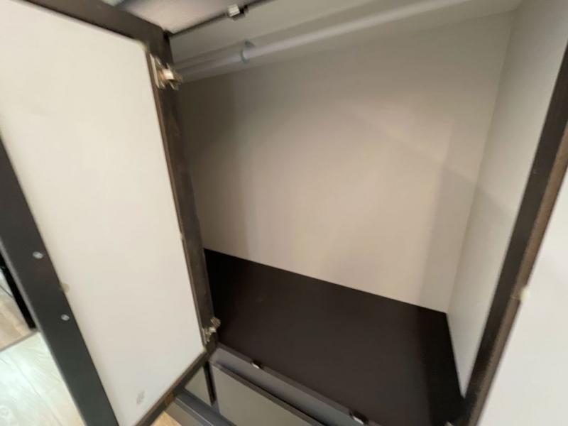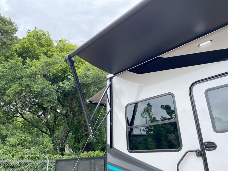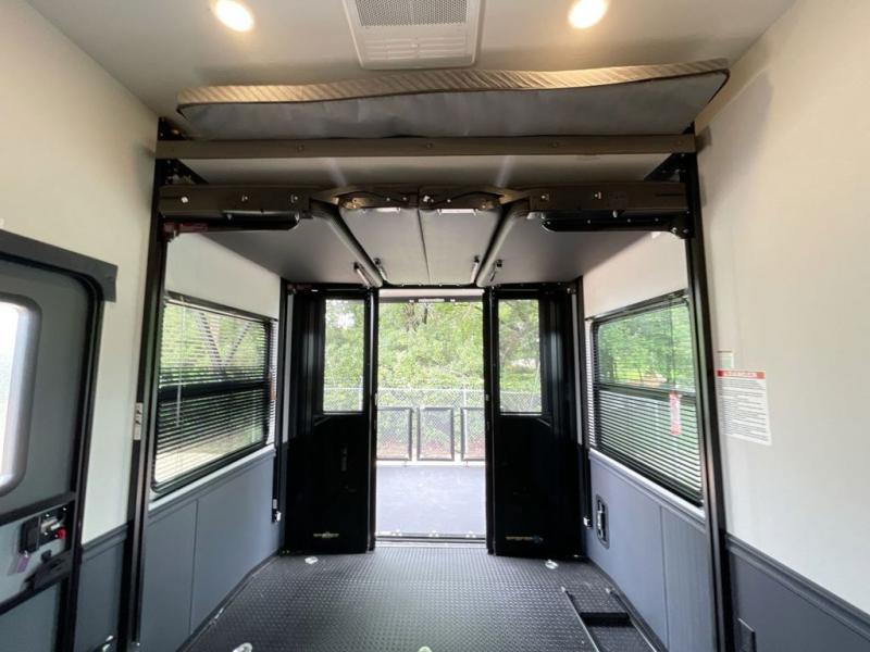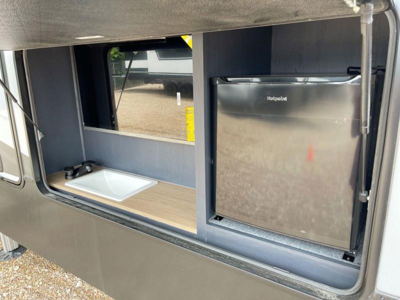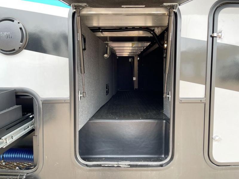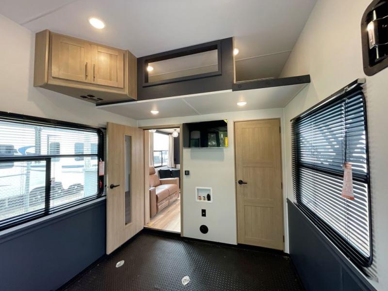 This toy hauler with a 15' separate garage is sure to meet all your needs! Once your toys are unloaded, you can set up the split bench seat/bed or let your guests take a rest on the electric queen bed above this area. There is also a loft here for additional sleeping or storage space plus a half bath for added convenience. The combined kitchen and living area includes a large slide out, two sofas and a free-standing table with chairs and a bench on one side. The U-shaped kitchen will let you whip up your best meals, or you can take your prep outdoors to cook on the outside kitchen. There is also a mini refrigerator here and a Grill N Go pull-out three burner griddle/grill combo. The full dual entry bath will create a front master bedroom, complete with a tilting king bed slide out and a wardrobe slide out for maximum space!