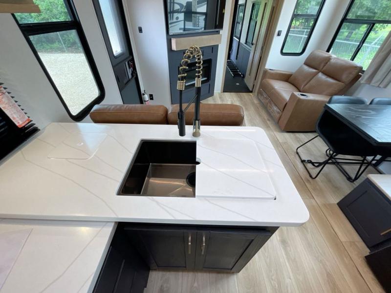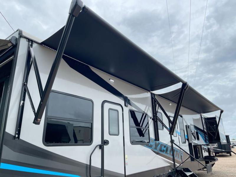 Satisfy your wanderlust with a Heartland Cyclone fifth wheel toy hauler! You won't have to sacrifice any luxury either with indulgent features like the king bedroom suite with an exclusive East to West bed tilt system with 30% more floor space, Stor-Mor three-sided access to the basement with 30% more storage capacity, and Step Caddy folding patio step for better stability as you enter or exit the patio. The industry first Grill and Go 25" residential pull out three burner griddle combo comes on models with an exterior kitchen for an easier cooking experience. Full height shaker cabinetry provides 25% more storage space so you can bring more camping necessities with you. If you like to dry camp longer then you will appreciate the industry's largest 150 gallons fresh water tanks. Come find the perfect model for you today!