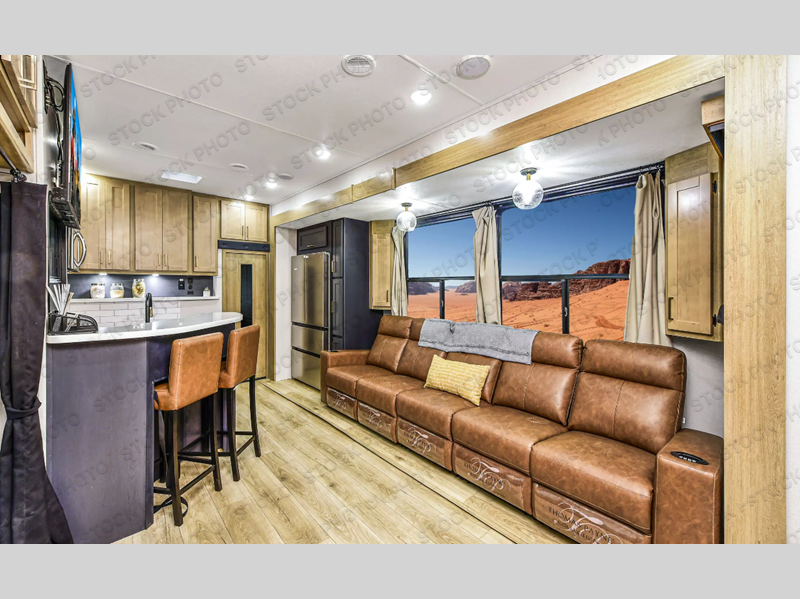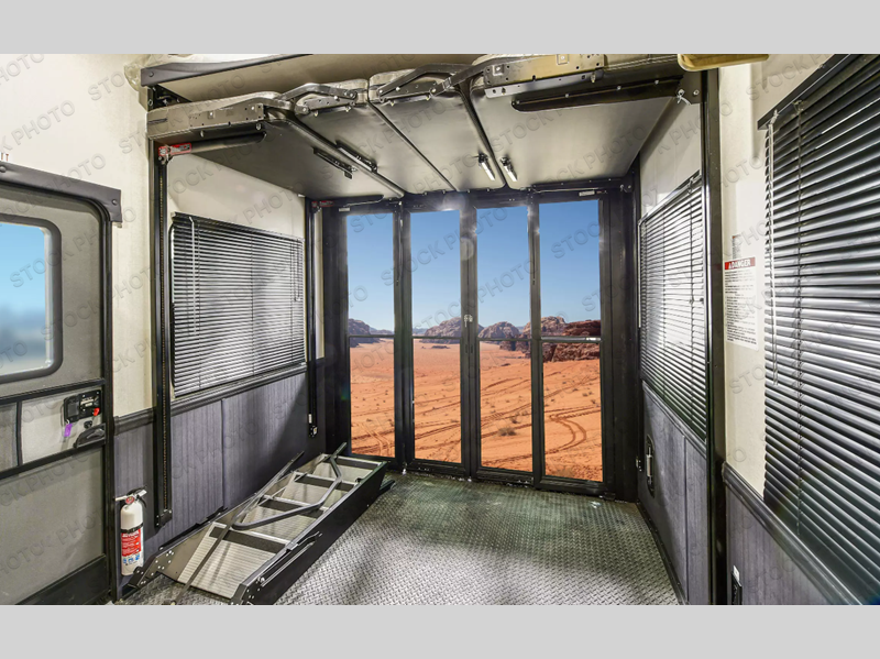 You won't believe all this toy hauler has to offer! The 13' garage includes dual entry doors, an electric queen bed above split bench seating, a loft, and a half bathroom. The chef can prepare their best home cooked meals with the three burner cooktop, and the curved bar top offers the perfect spot to enjoy your morning coffee and eggs. You can exit the kitchen through the two sliding doors and relax on the side patio where you can entertain friends. The exterior not only has two awnings to protect you rain or shine, but also an outside trash access which will come in very handy. When you're ready to wind down your nights, take a hot shower in the dual entry bathroom, then head directly into the front master suite where you can change into your pajamas stored in the wardrobe/closet slide and sleep on the tilting king bed!