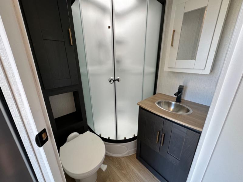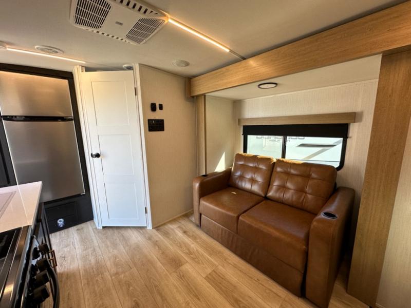 The front king bed provides a restful night’s sleep, while the privacy curtain offers separation from the living space. The sofa with stowaway table works for dining, relaxing, or accommodating an overnight guest.