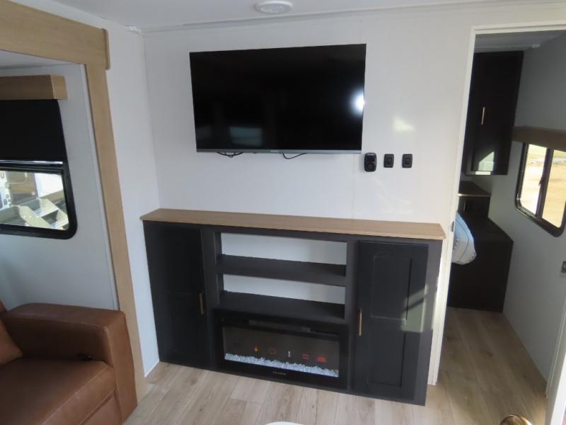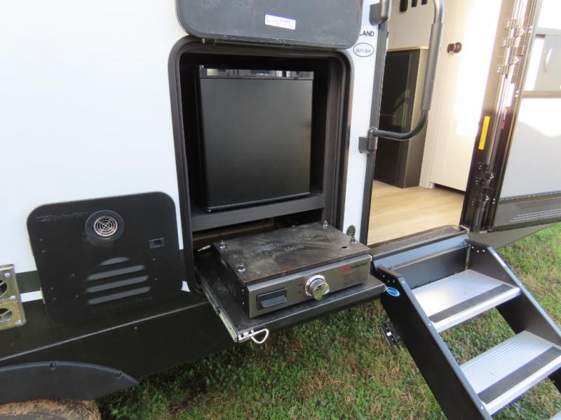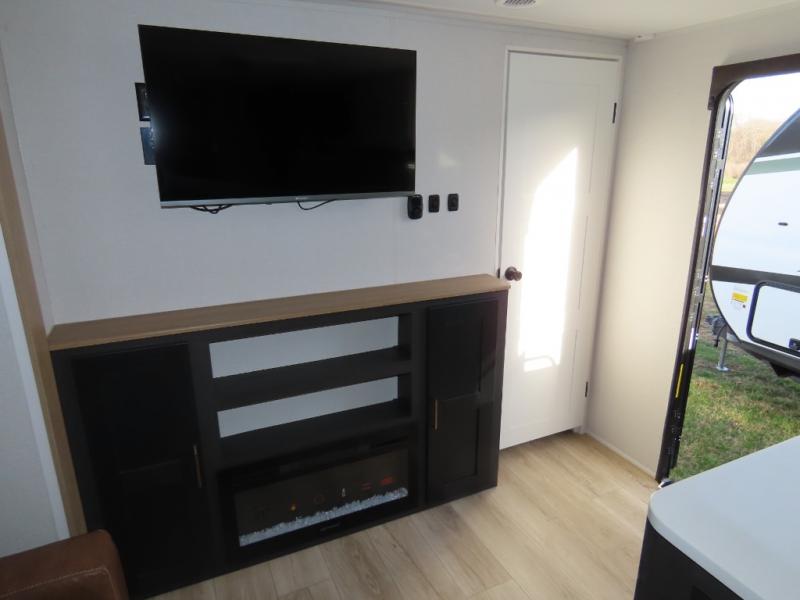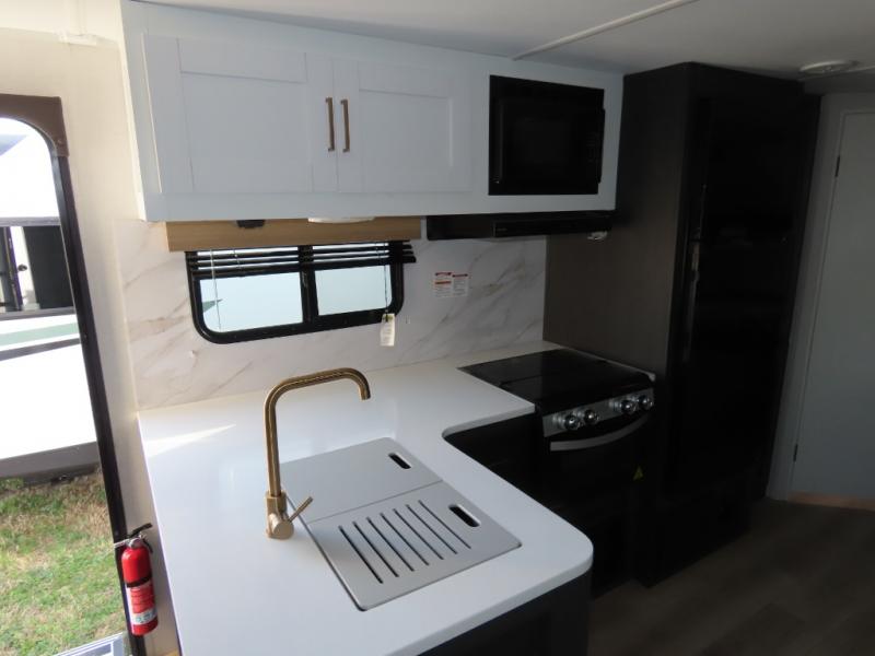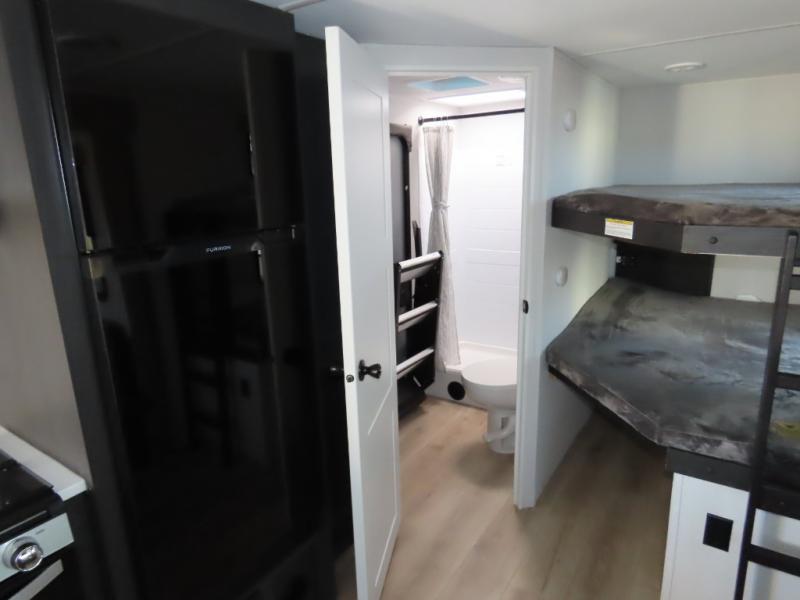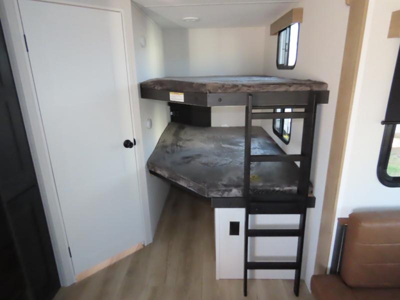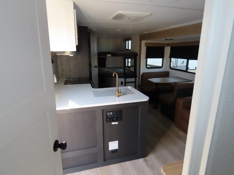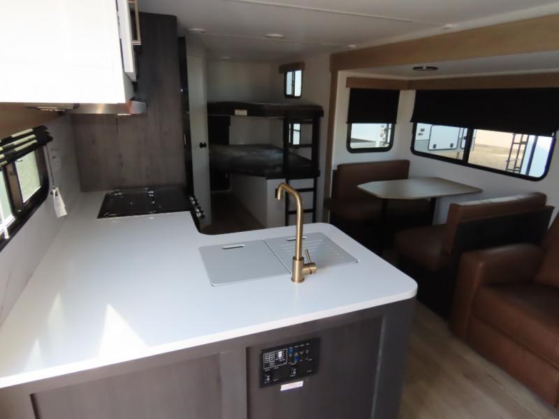 You'll love camping with friends and family in this dual entry travel trailer! One of the doors leads to the full bath so you can easily access it when you're visiting outdoors with friends. There are double-size bunks where the little ones or your guests can sleep, while you take the king bed in the front private bedroom. Everyone can meet in the combined kitchen and living room in the morning while the cook makes breakfast on the three burner cooktop. There is a booth dinette and sofa here for seating and sleeping space, although you might just want to sit under the 19' awning if breakfast is being made at the exterior kitchen!