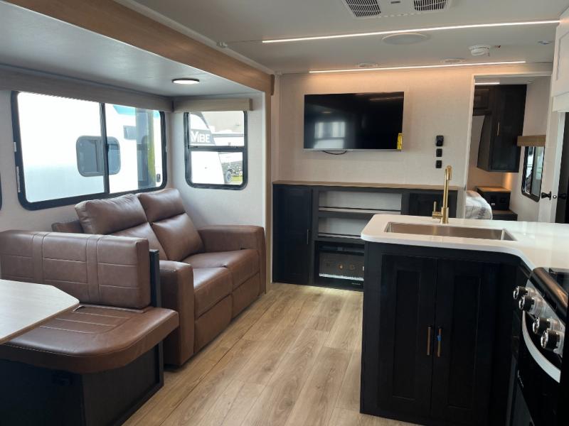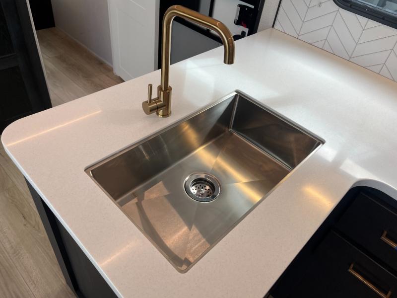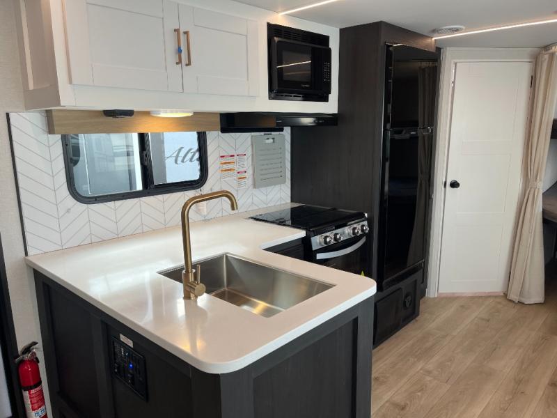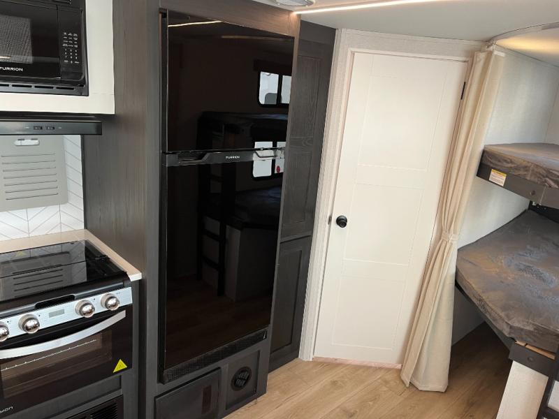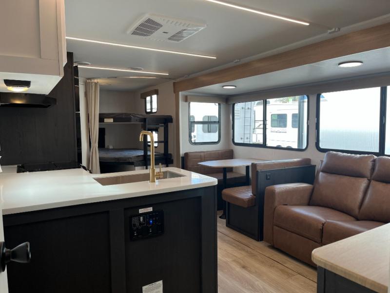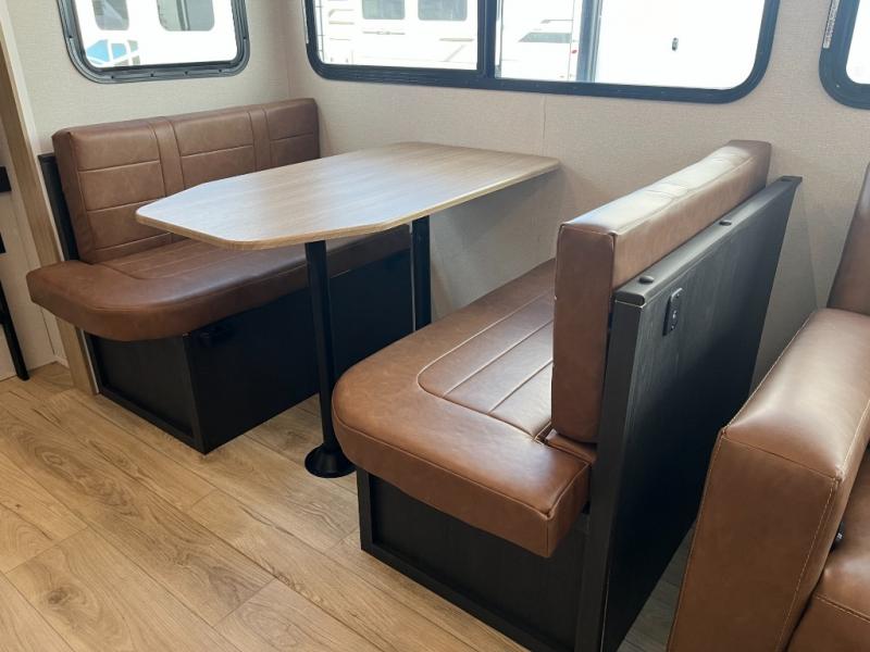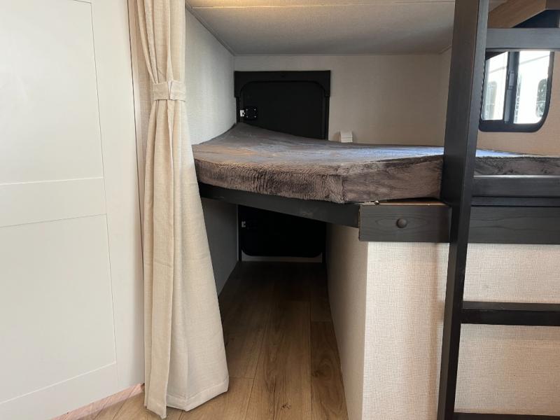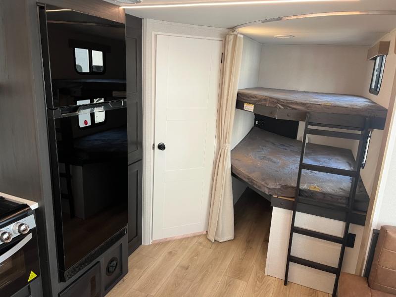 You'll love camping with friends and family in this dual entry travel trailer! One of the doors leads to the full bath so you can easily access it when you're visiting outdoors with friends. There are double-size bunks where the little ones or your guests can sleep, while you take the king bed in the front private bedroom. Everyone can meet in the combined kitchen and living room in the morning while the cook makes breakfast on the three burner cooktop. There is a booth dinette and sofa here for seating and sleeping space, although you might just want to sit under the 19' awning if breakfast is being made at the exterior kitchen!