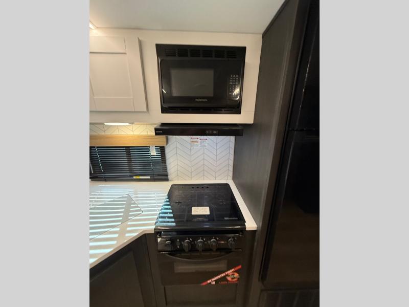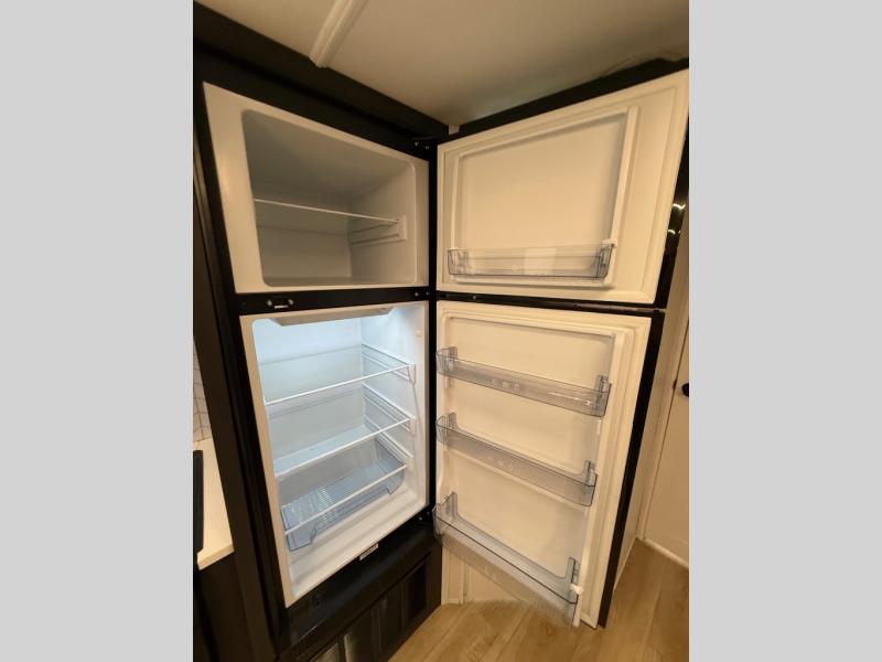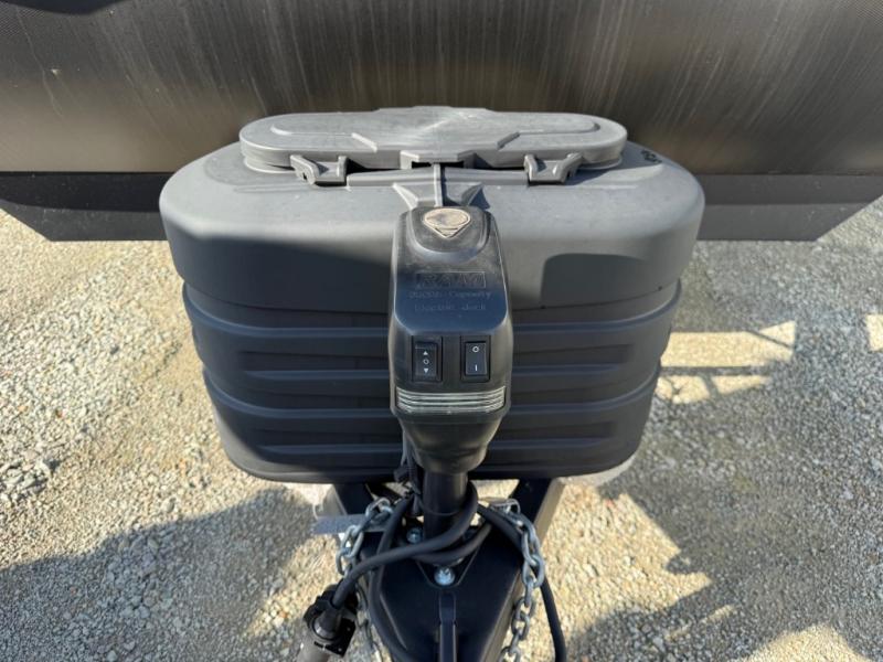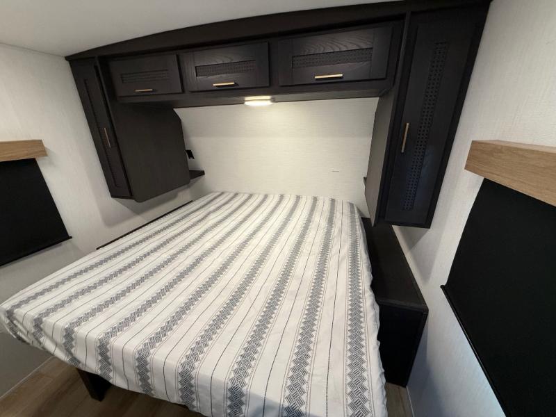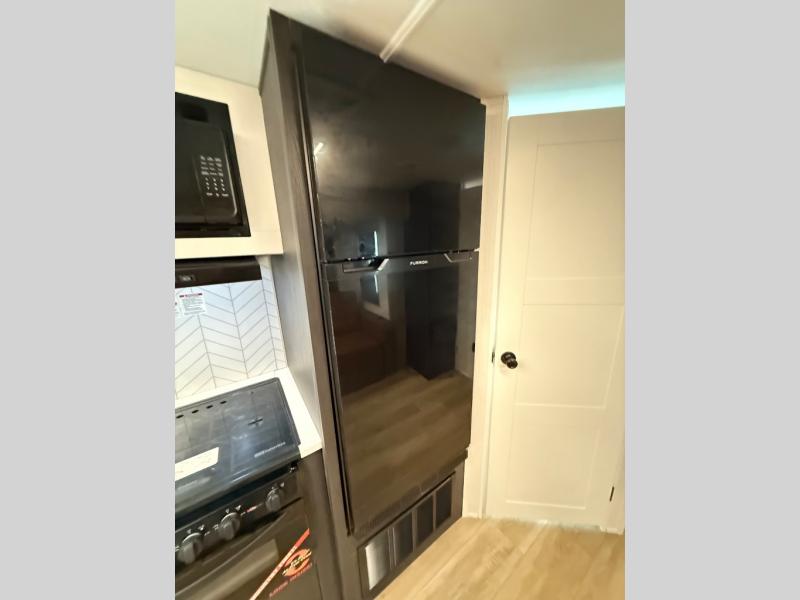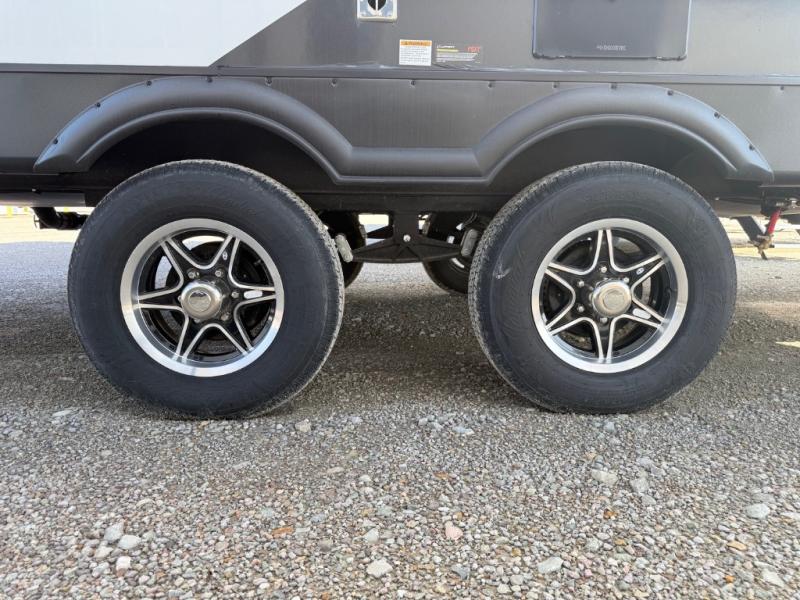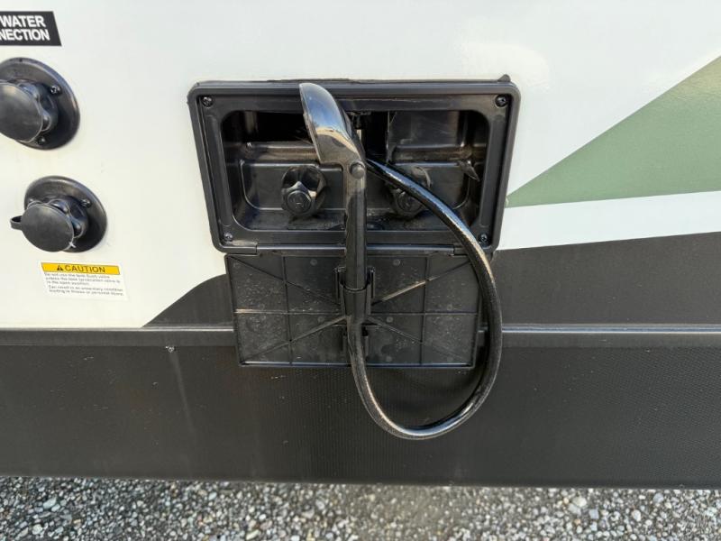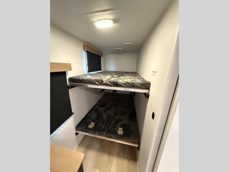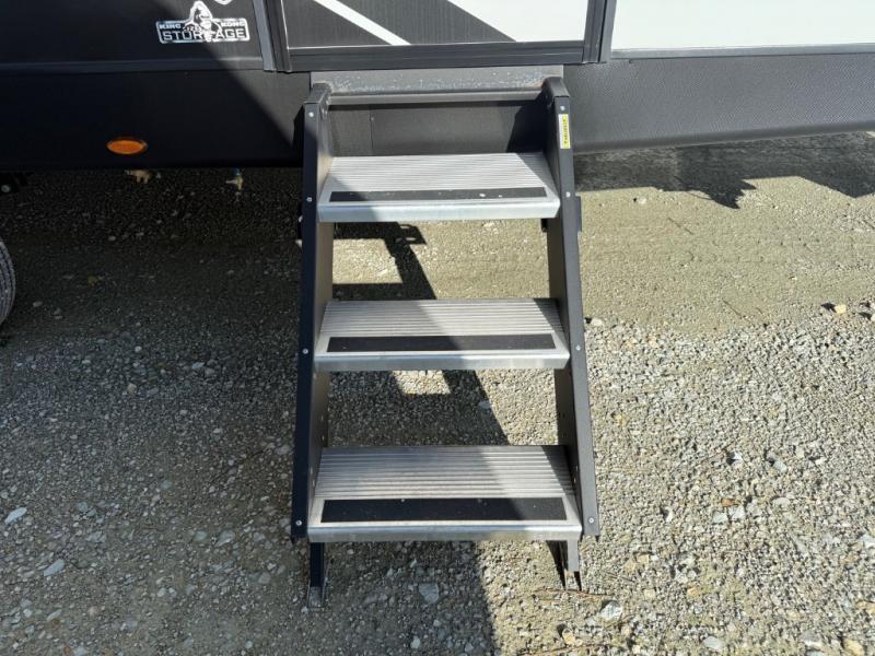 Head out to your favorite camping spots and take along a few friends! This North Trail unit features a set of flip-up double-size bunks for four family members or friends, plus a private bedroom up front featuring a king sized 68" x 76" mattress for two more. Beneath the bunks, you will have storage space for bicycles and kayaks if you like, or just more storage for totes and things until you get to your camping spot. The private bedroom up front features a space saving sliding door and nightstands and clothing storage along either side of the bed. In the combined living and kitchen area, you will enjoy the added floor space thanks to the large slide out with the convertible sleeper sofa with a stowaway table. Outside, a 15' power awning offers more living space to enjoy both day and night. What are you waiting for, come check this unit out!