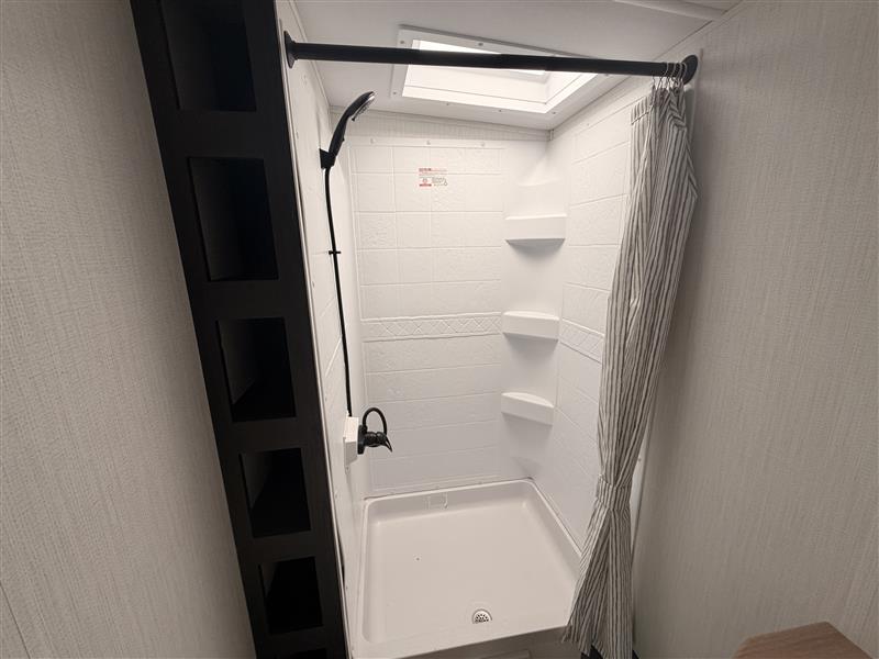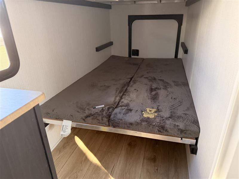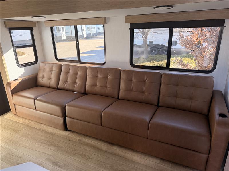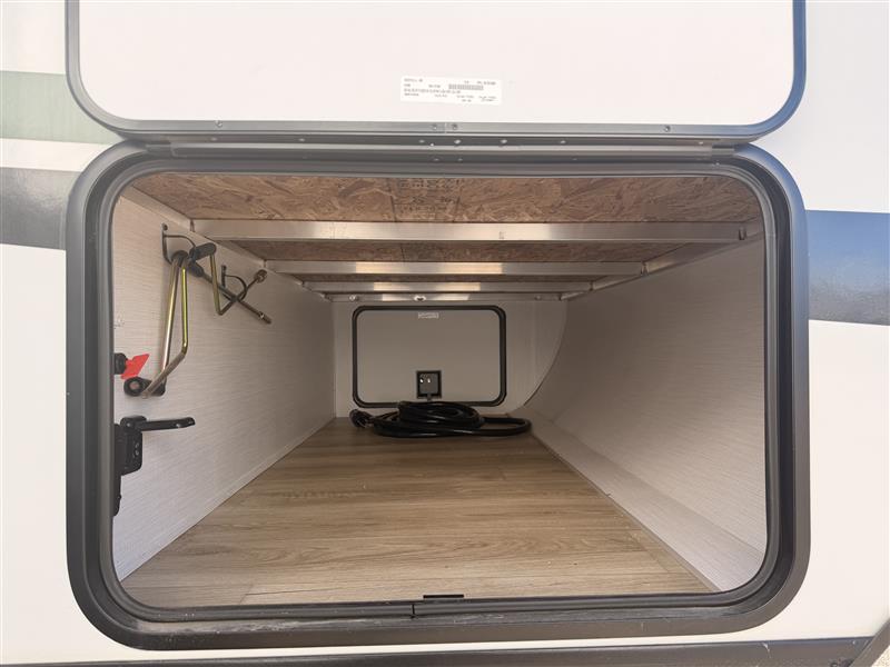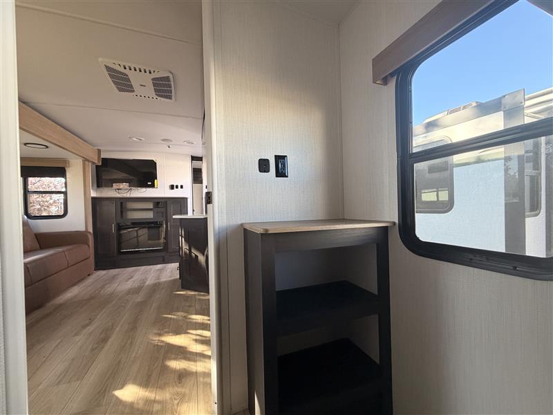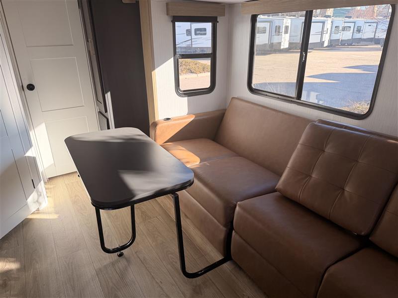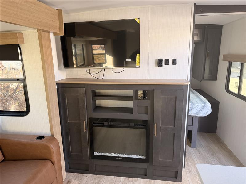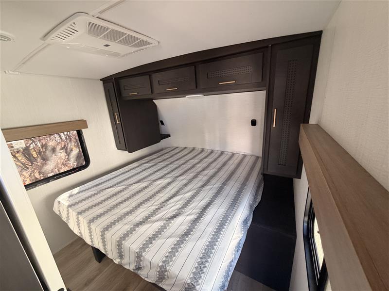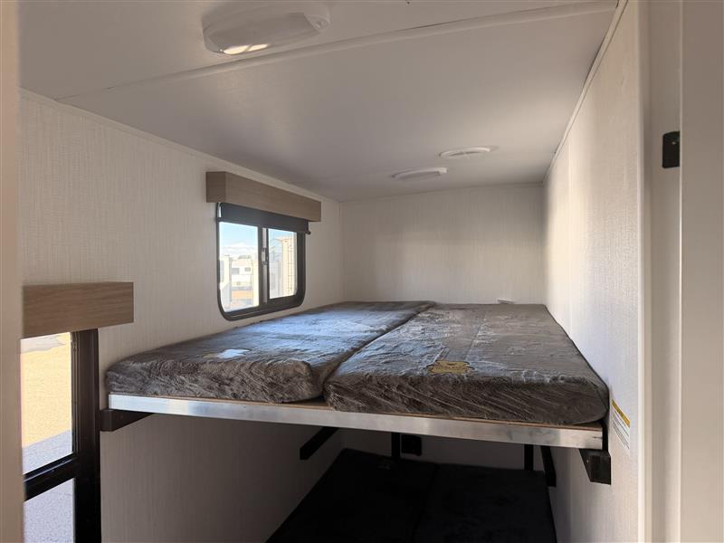 Head out to your favorite camping spots and take along a few friends! This North Trail unit features a set of flip-up double-size bunks for four family members or friends, plus a private bedroom up front featuring a king sized 68" x 76" mattress for two more. Beneath the bunks, you will have storage space for bicycles and kayaks if you like, or just more storage for totes and things until you get to your camping spot. The private bedroom up front features a space saving sliding door and nightstands and clothing storage along either side of the bed. In the combined living and kitchen area, you will enjoy the added floor space thanks to the large slide out with the convertible sleeper sofa with a stowaway table. Outside, a 15' power awning offers more living space to enjoy both day and night. What are you waiting for, come check this unit out!