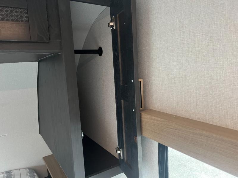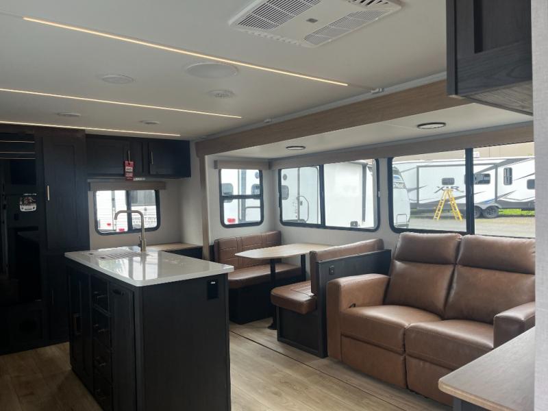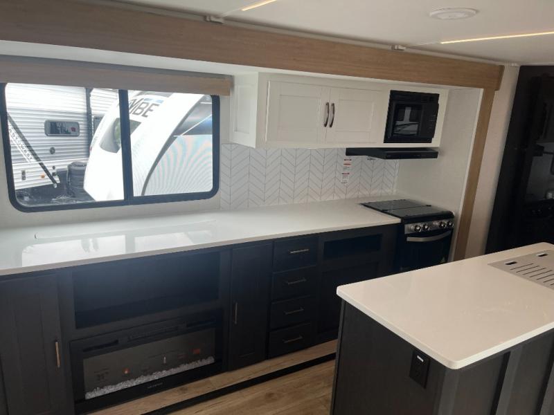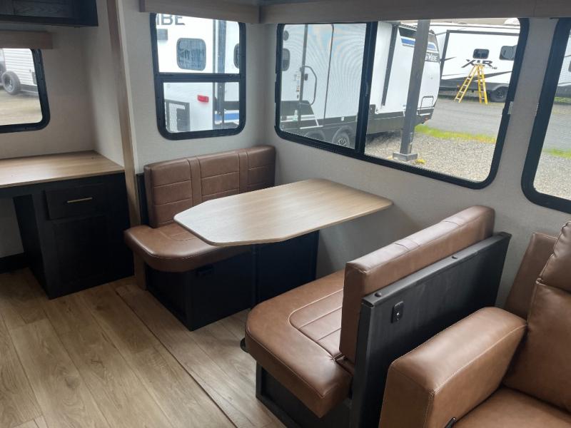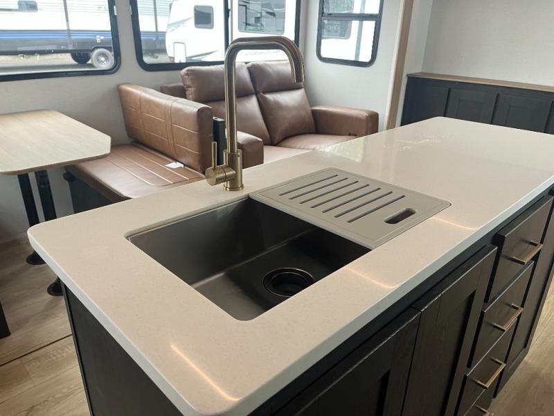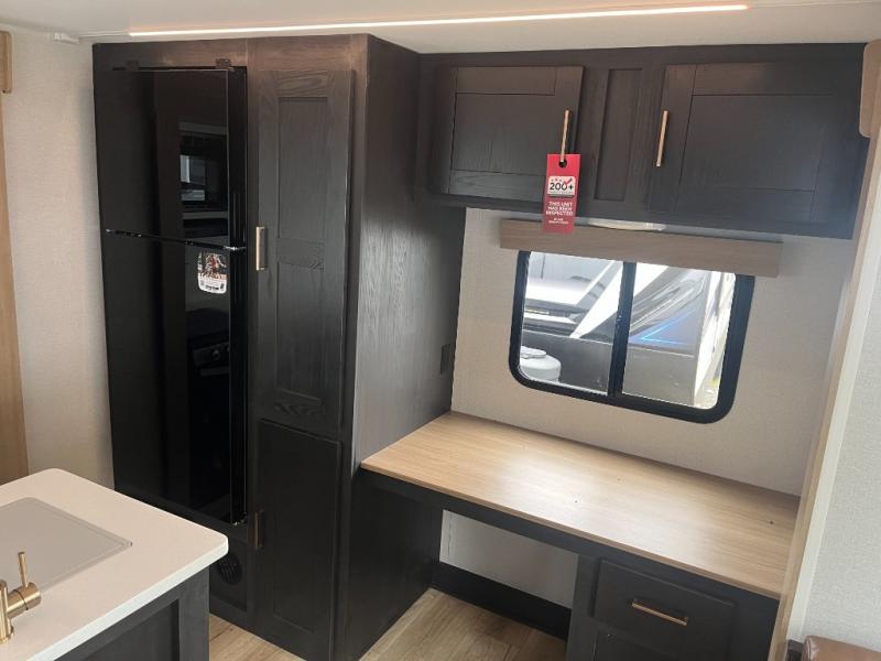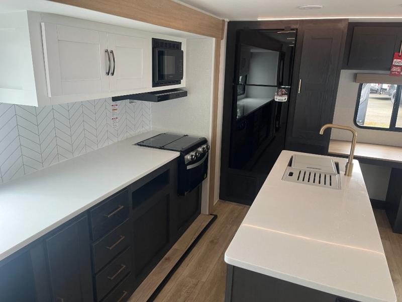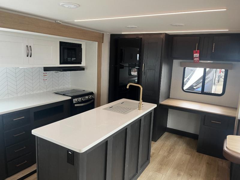 Trips to the campground are made complete in this travel trailer! There are dual opposing slides in the combined kitchen and living area to give you an open floorplan. The chef of your group will appreciate the kitchen island for more counter space, along with all the appliances needed to make meals. The rear kitchen also includes a desk with a chair and overhead storage for work necessities if you're working remotely. When you're not outside relaxing under the 18' awning, you can play games at the booth dinette or watch movies on the sofa. And the king bed in the front bedroom is sure to bring a great night's rest. There are also dual bedside wardrobes plus a dresser with washer and dryer prep if you plan to add those appliances.