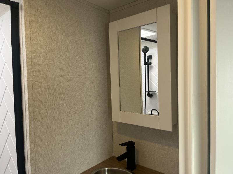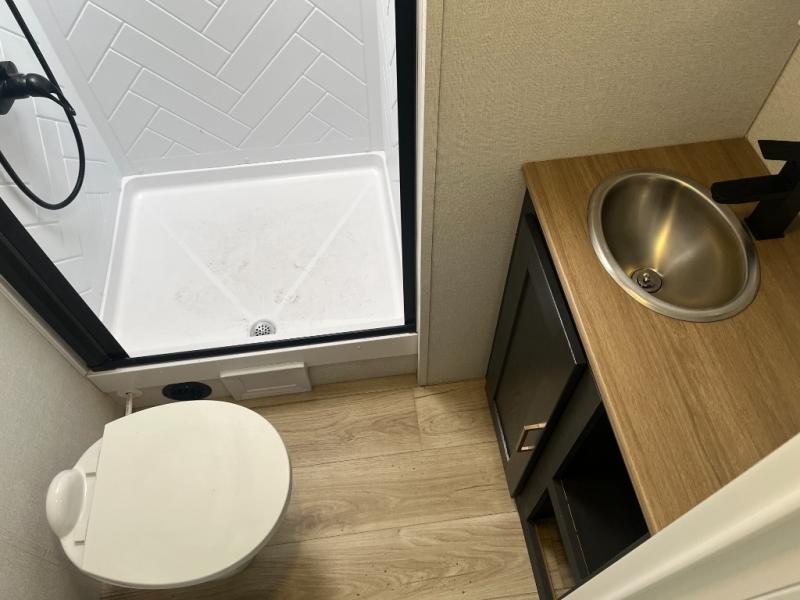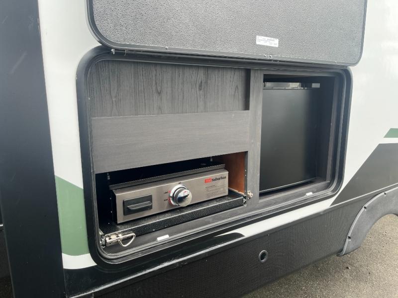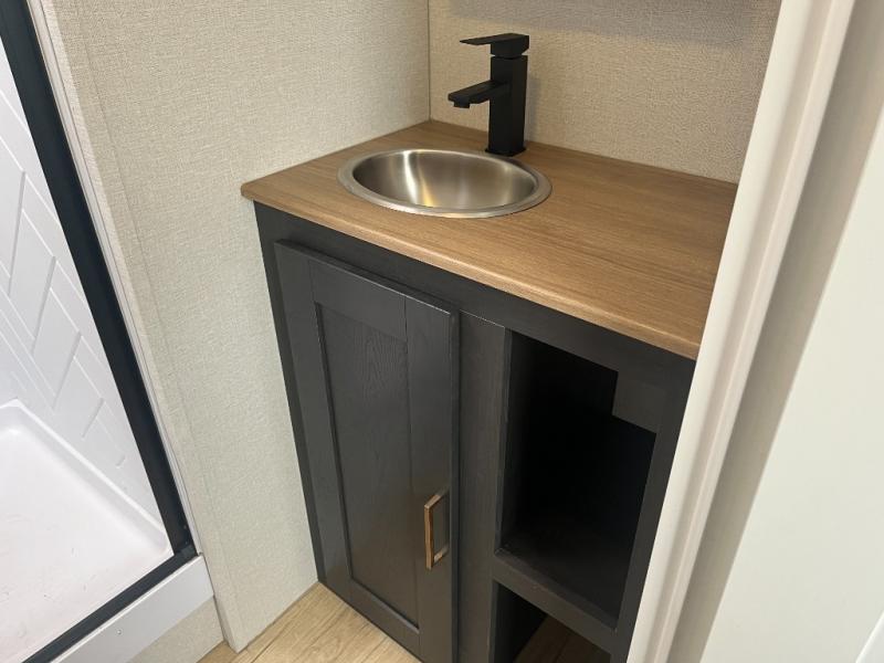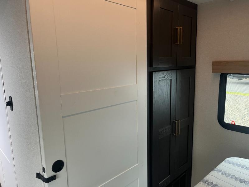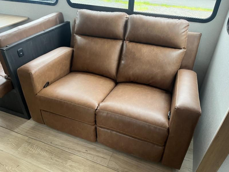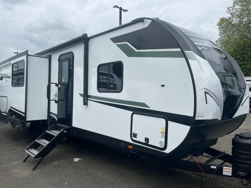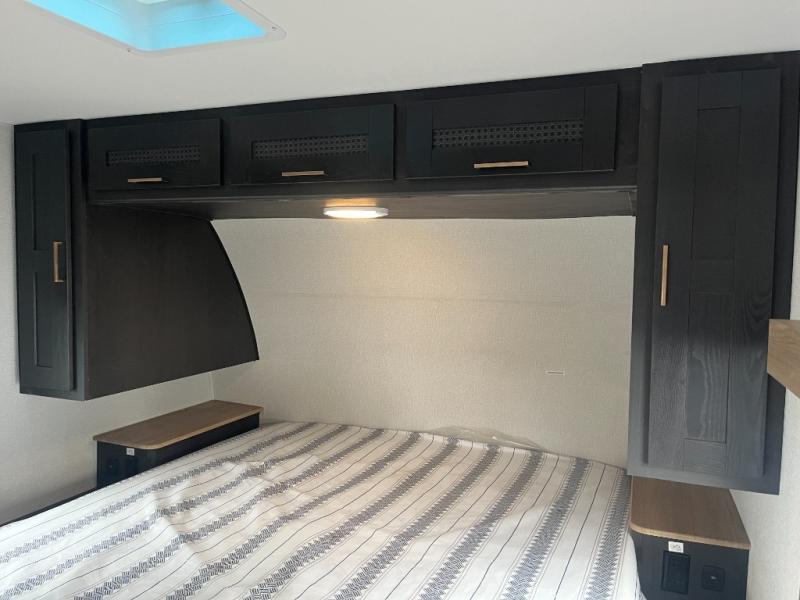 Trips to the campground are made complete in this travel trailer! There are dual opposing slides in the combined kitchen and living area to give you an open floorplan. The chef of your group will appreciate the kitchen island for more counter space, along with all the appliances needed to make meals. The rear kitchen also includes a desk with a chair and overhead storage for work necessities if you're working remotely. When you're not outside relaxing under the 18' awning, you can play games at the booth dinette or watch movies on the sofa. And the king bed in the front bedroom is sure to bring a great night's rest. There are also dual bedside wardrobes plus a dresser with washer and dryer prep if you plan to add those appliances.