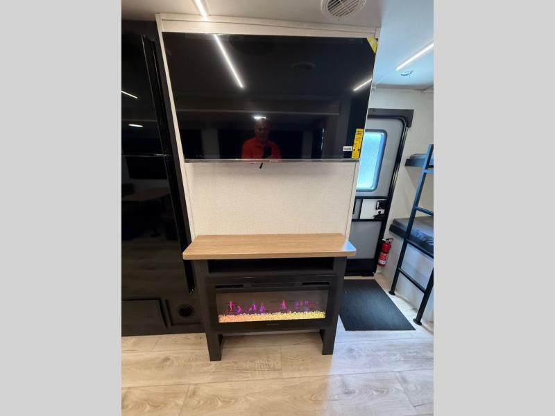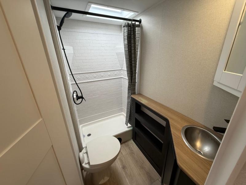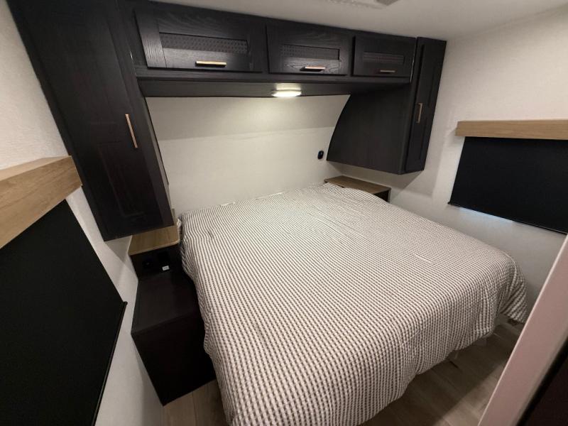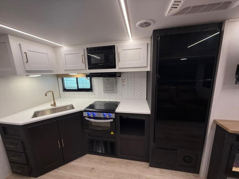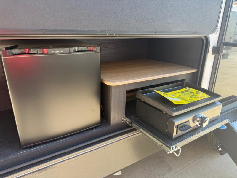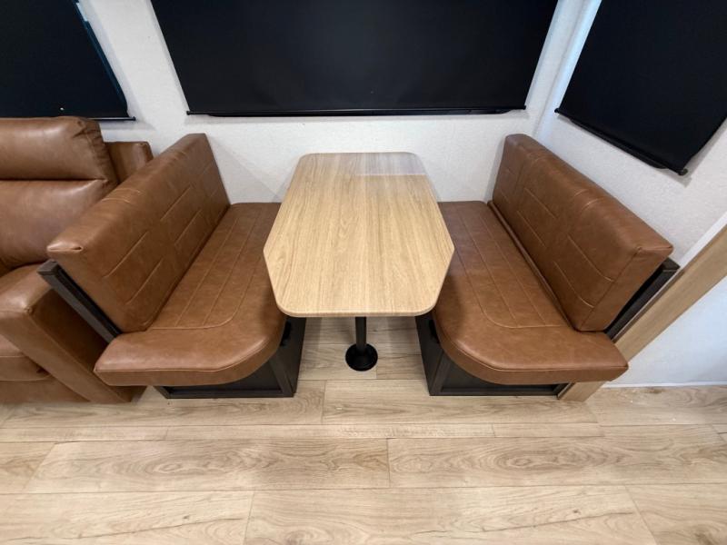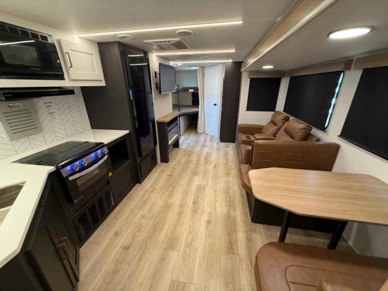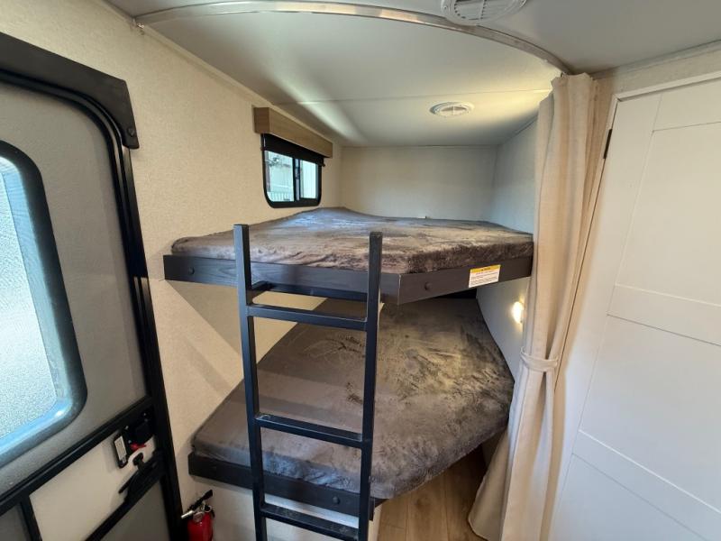 You'll love camping with friends and family in this bunkhouse travel trailer! There are double-size bunks where the little ones or your guests can sleep, while you take the king bed in the front private bedroom. Everyone can meet in the combined kitchen and living room in the morning while the cook makes breakfast on the three burner cooktop. There is a booth dinette and sofa here for seating and sleeping space, although you might just want to sit under the 16' awning if breakfast is being made at the exterior kitchen!