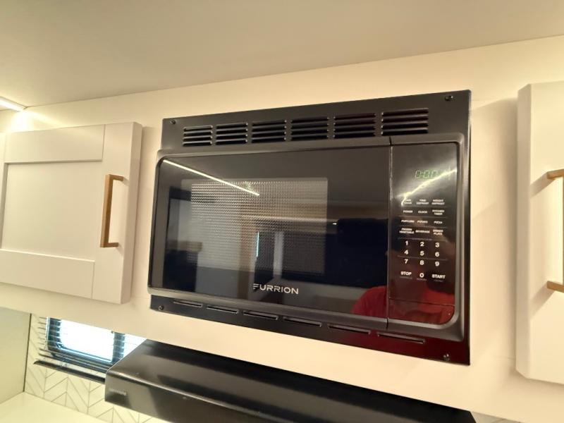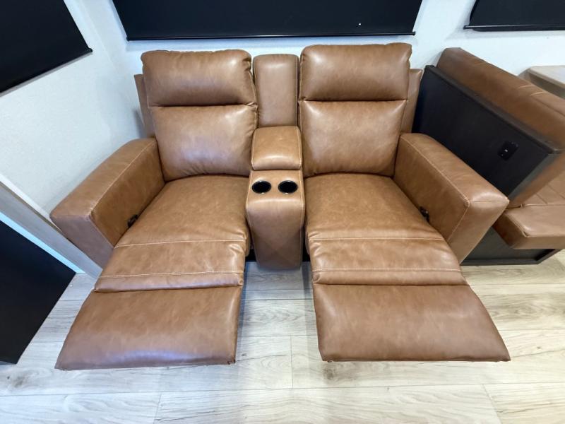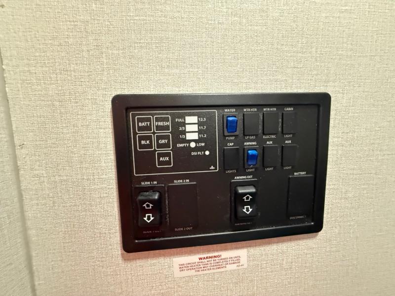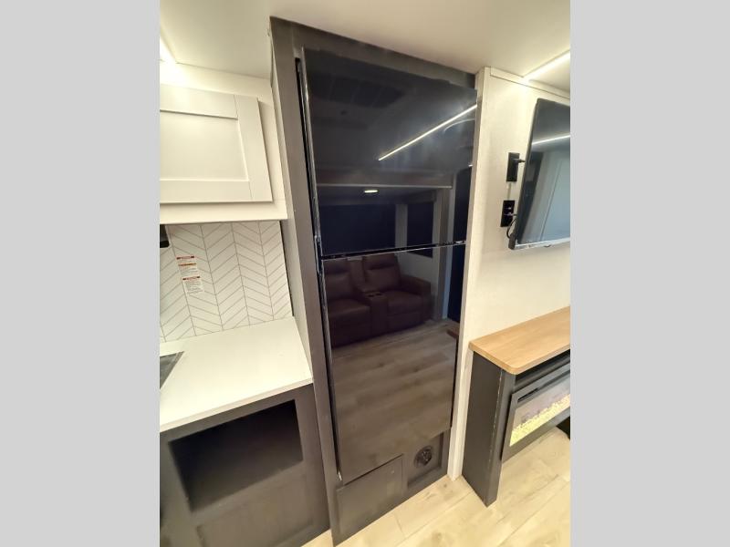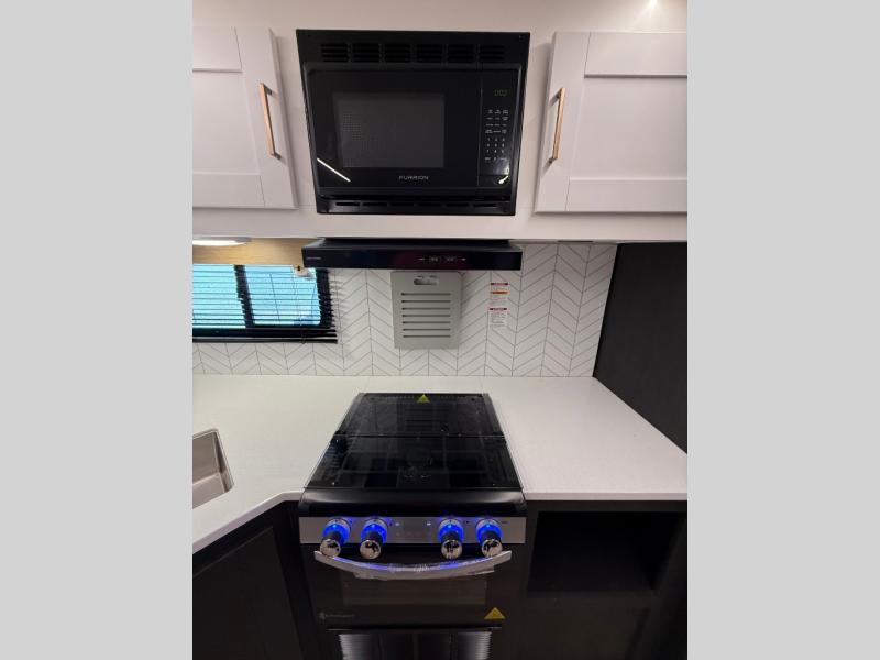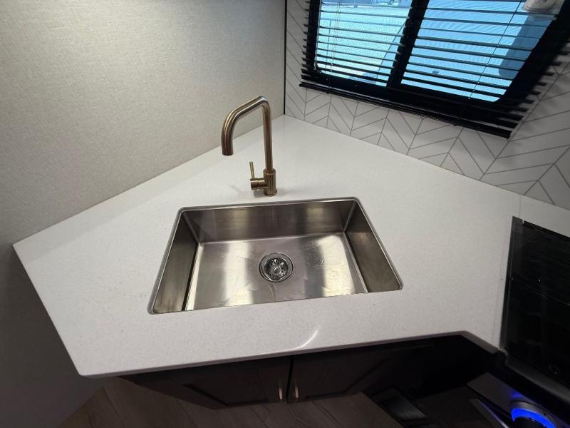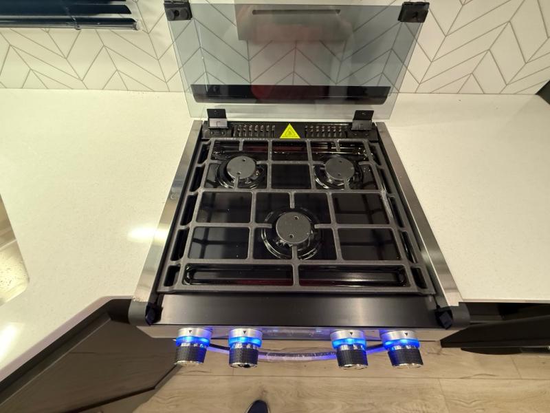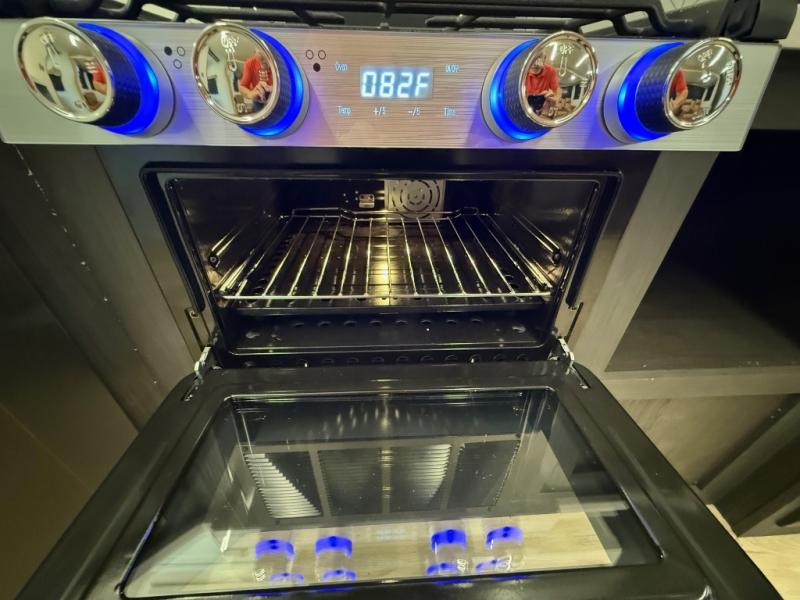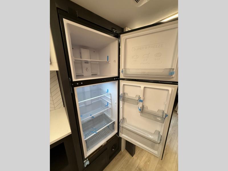 You'll love camping with friends and family in this bunkhouse travel trailer! There are double-size bunks where the little ones or your guests can sleep, while you take the king bed in the front private bedroom. Everyone can meet in the combined kitchen and living room in the morning while the cook makes breakfast on the three burner cooktop. There is a booth dinette and sofa here for seating and sleeping space, although you might just want to sit under the 16' awning if breakfast is being made at the exterior kitchen!