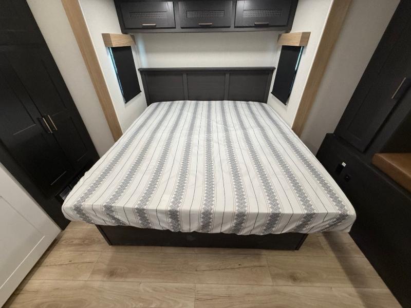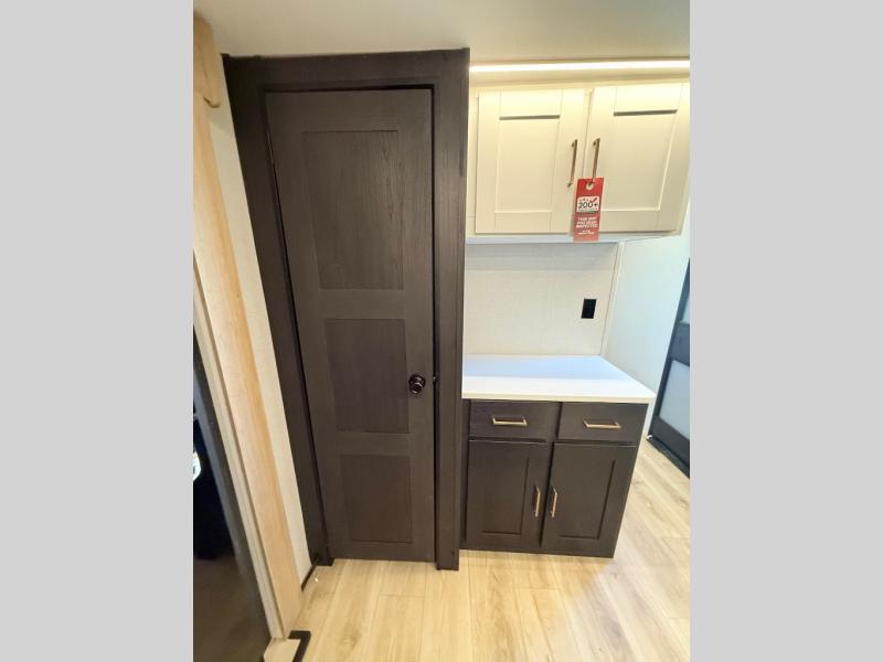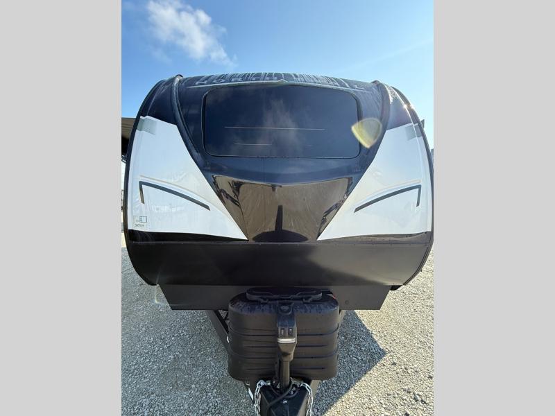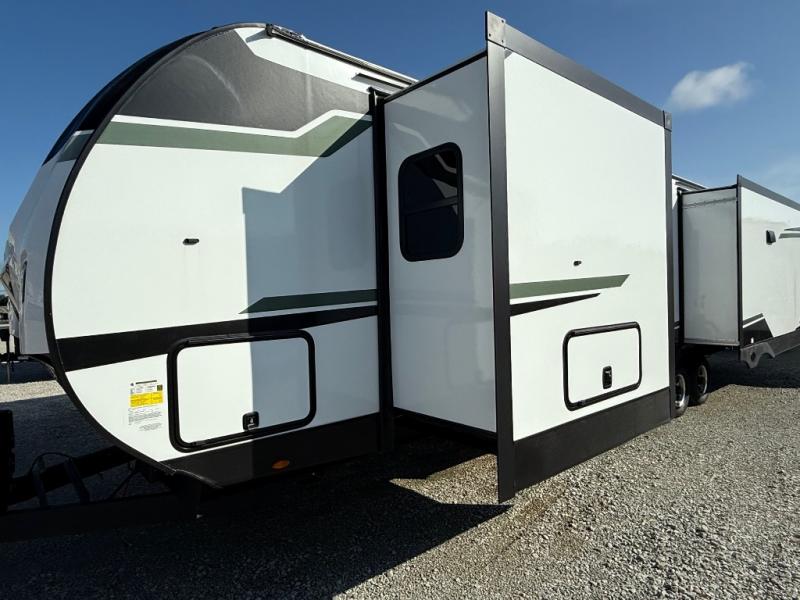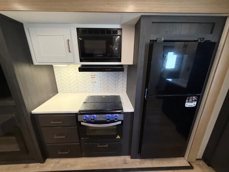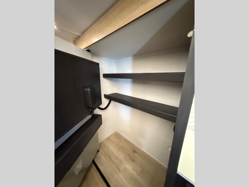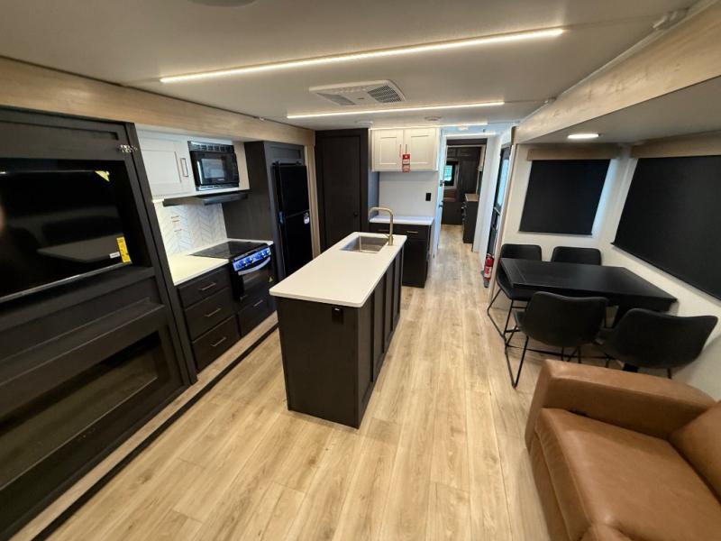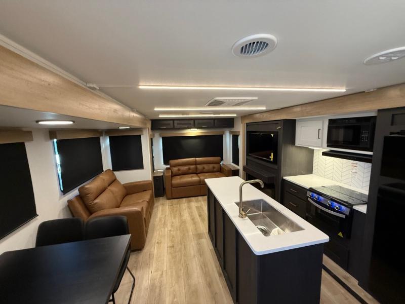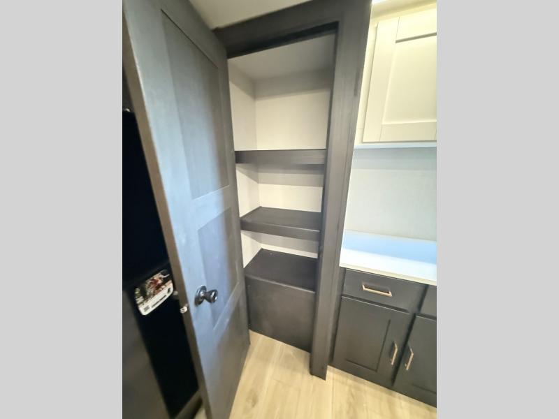 When you're ready to escape the everyday life, hitch up this travel trailer and head to the campground! You'll have your own front bedroom with a king bed slide, dual shirt closets with additional storage in between, plus a dresser and a closet with washer and dryer prep. If you have any guests staying over, they can sleep on the rear sofa or the second sofa in the living area. There is also a free-standing table here where you can dine together each morning. A kitchen island provides extra counter space when prepping meals, and the pantry will let you keep food stocked!