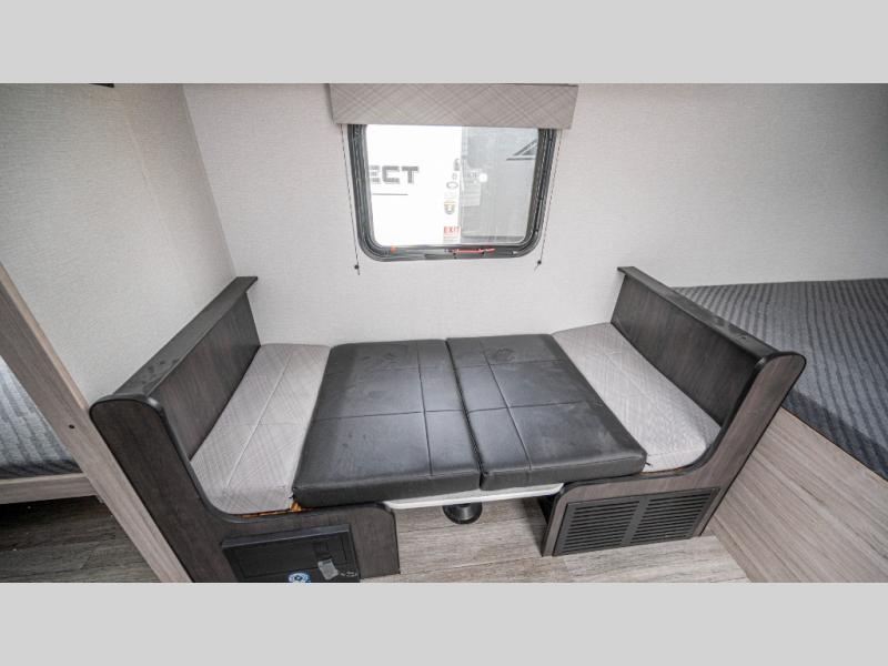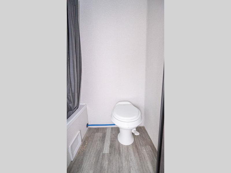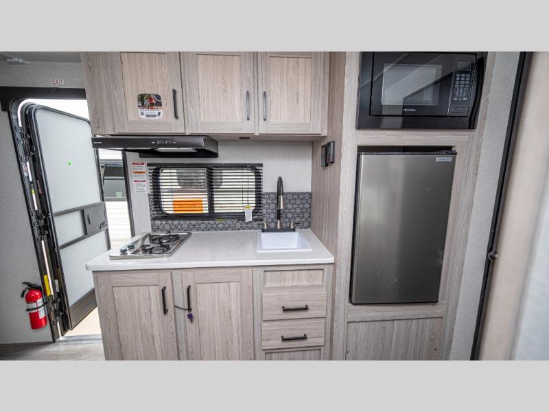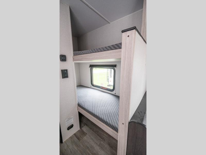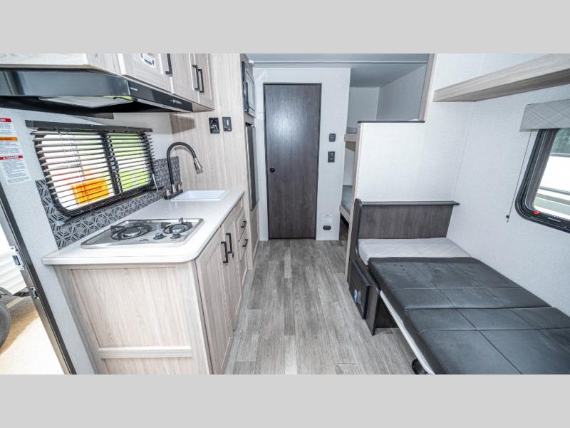 You'll love every minute spent in this travel trailer that can sleep five each night. There are bunk beds towards the back right beside the private bath for easy nighttime use. The queen bed up front will provide a great night's rest, and the booth dinette can double as dining and sleeping space. A two burner cooktop will let you cook meals each day, and there is a 3.3 cu. ft. 12V refrigerator for perishables.