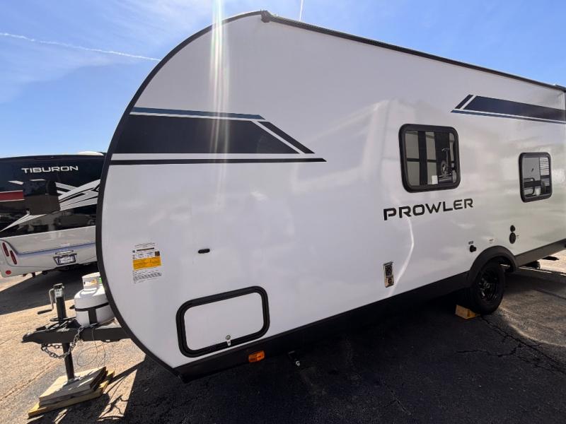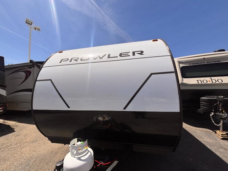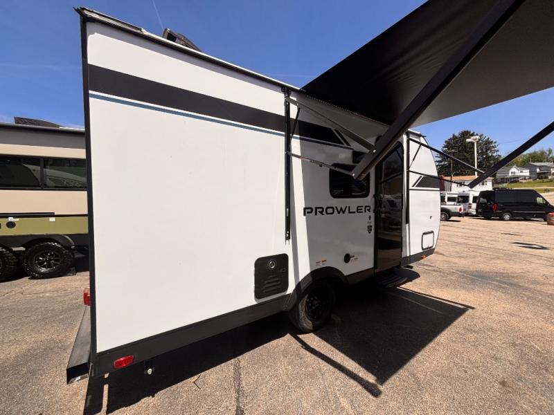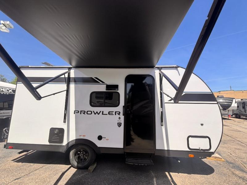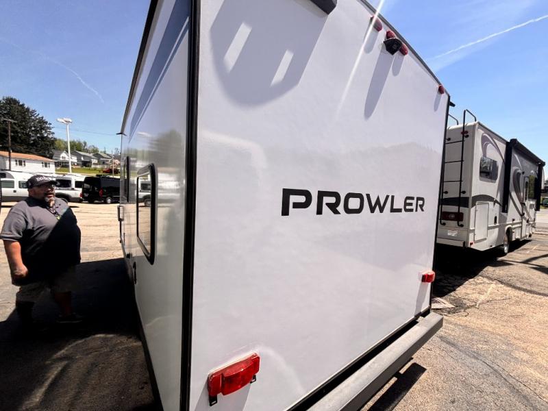 Get ready for comfortable and easy camping with the Prowler travel trailers by Heartland. The exterior features a power awning with LED lighting, stabilizer jacks, and diamond plate rock guard to help protect against rock and debris on the way to the campground. There is also a ladder and rear camera prep, an 8K roof mounted A/C, and a 20 lb. LP tank. Inside, you'll enjoy the dimmable LED ceiling lighting to keep your space well lit, and the on-demand water heater will provide endless hot showers.
