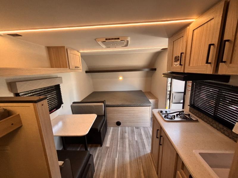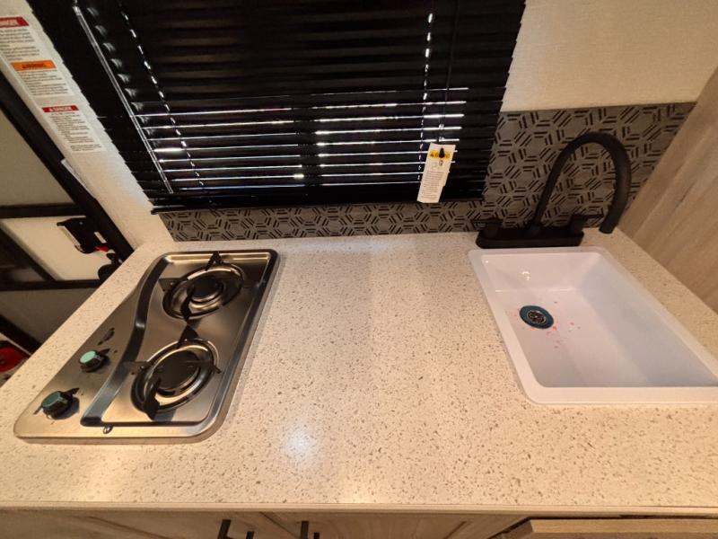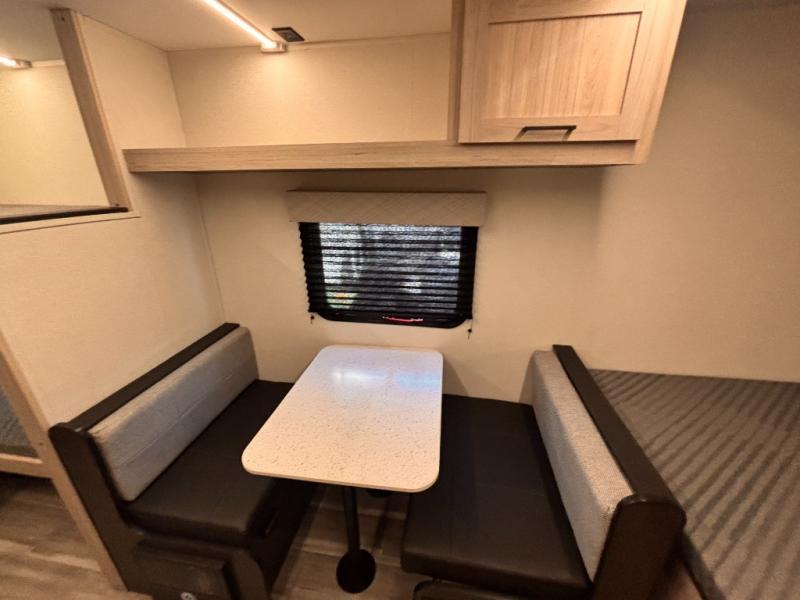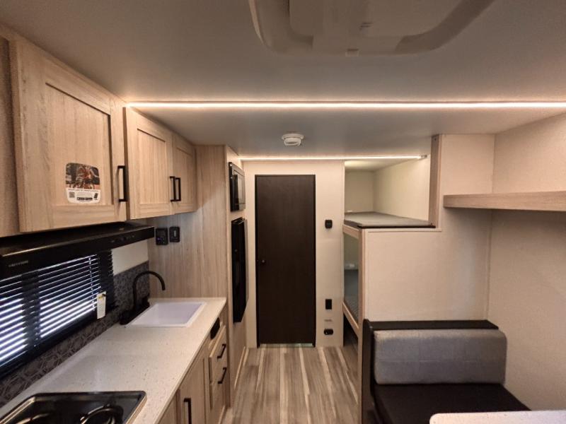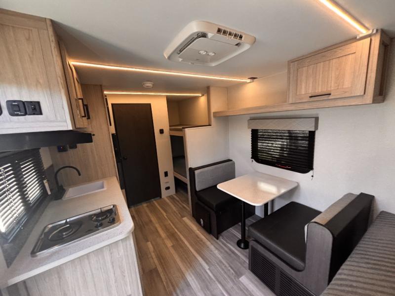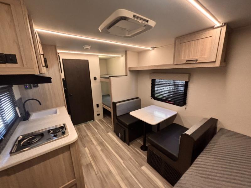 You'll love every minute spent in this travel trailer that can sleep five each night. There are bunk beds towards the back right beside the private bath for easy nighttime use. The queen bed up front will provide a great night's rest, and the booth dinette can double as dining and sleeping space. A two burner cooktop will let you cook meals each day, and there is a 3.3 cu. ft. 12V refrigerator for perishables.