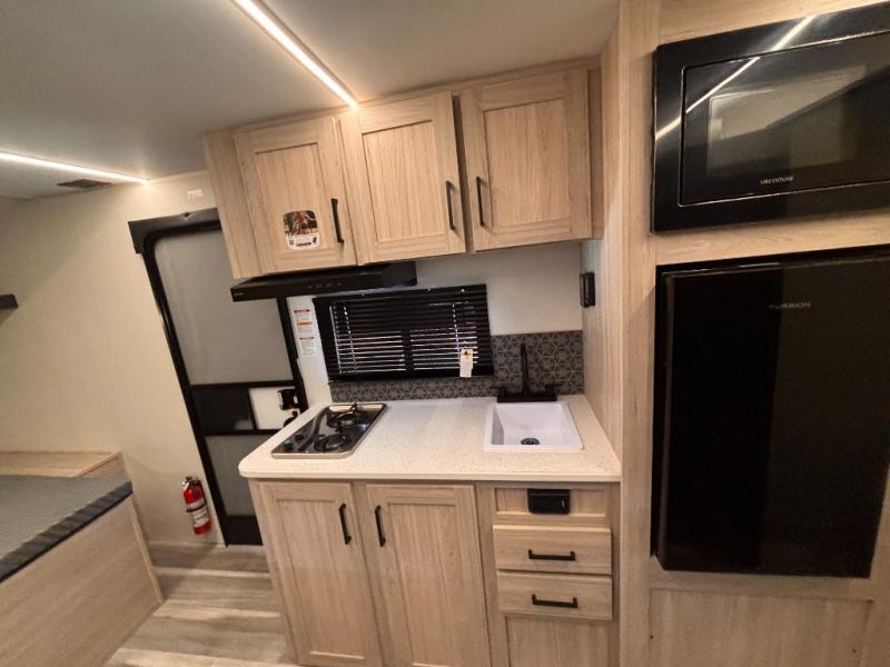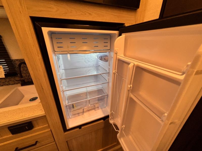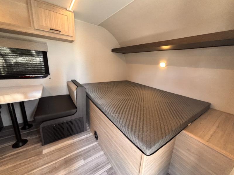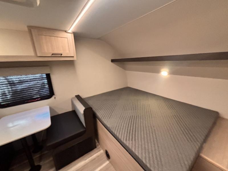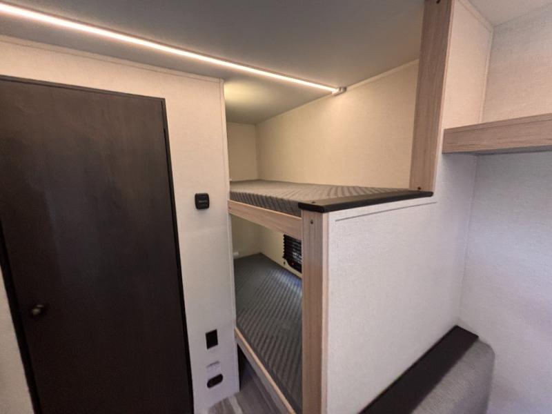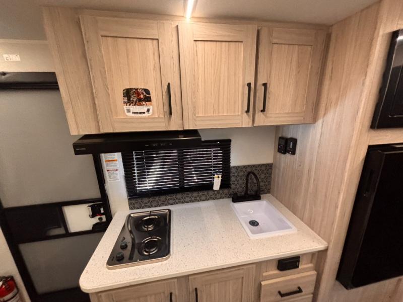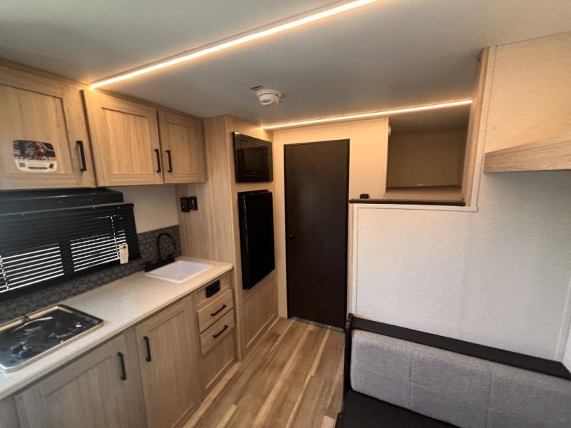 You'll love every minute spent in this travel trailer that can sleep five each night. There are bunk beds towards the back right beside the private bath for easy nighttime use. The queen bed up front will provide a great night's rest, and the booth dinette can double as dining and sleeping space. A two burner cooktop will let you cook meals each day, and there is a 3.3 cu. ft. 12V refrigerator for perishables.