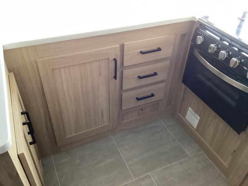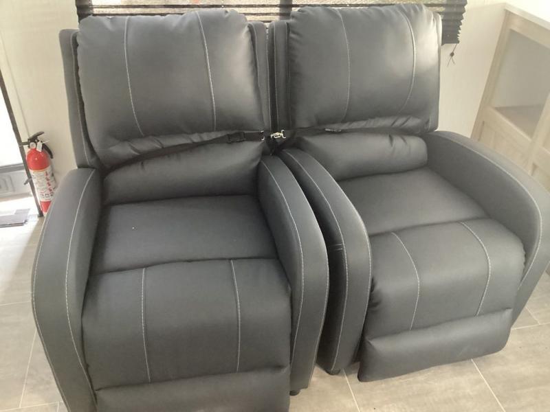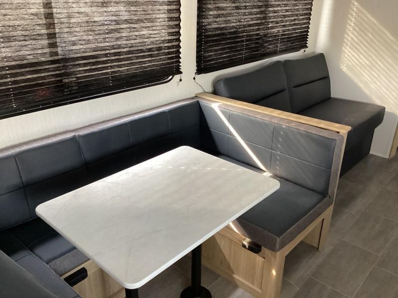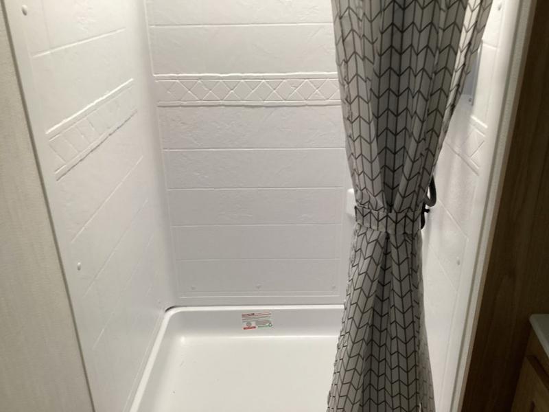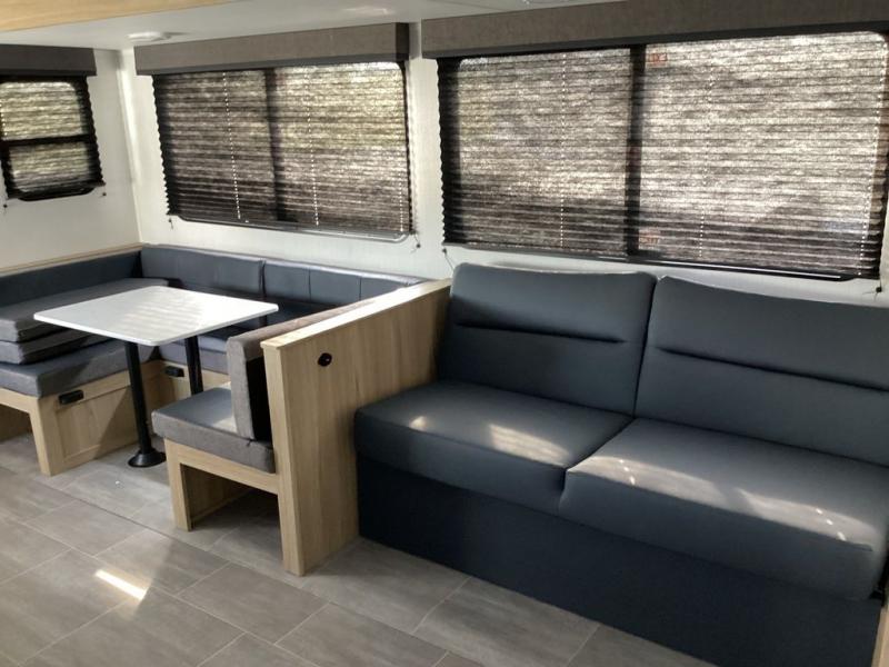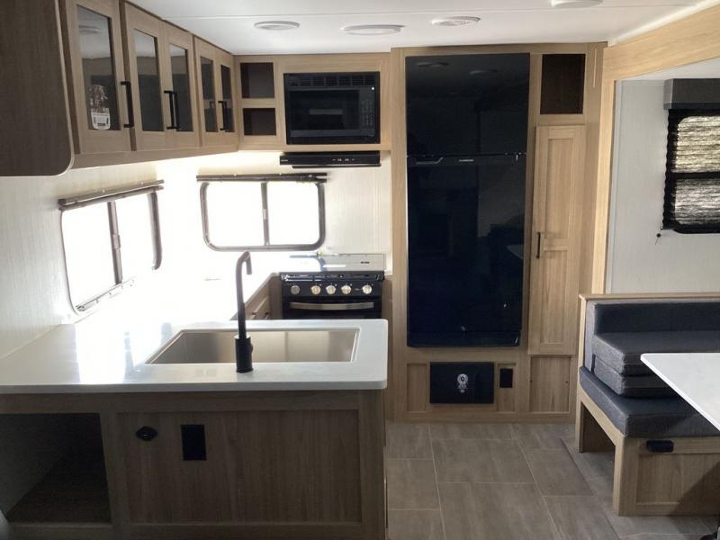 One look at this travel trailer and you'll be hooked! The front private bedroom with a queen bed provides a place for you to retreat to each night, and the full bath will let you freshen up in the morning. A full kitchen, complete with a three burner cooktop, microwave oven, and farmhouse sink will be perfect for meal times, and there is generous counter space to set out drinks and snacks. In the evening, you can relax on the sofa by the fireplace or head outdoors to relax under the power awning with LED lights. There is also an outdoor refrigerator to keep cold drinks stocked!