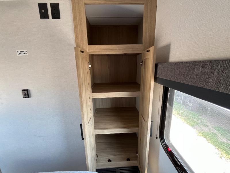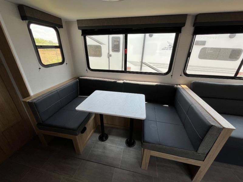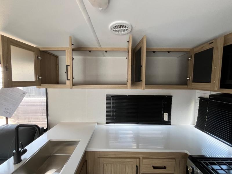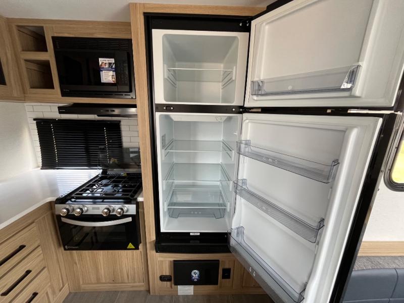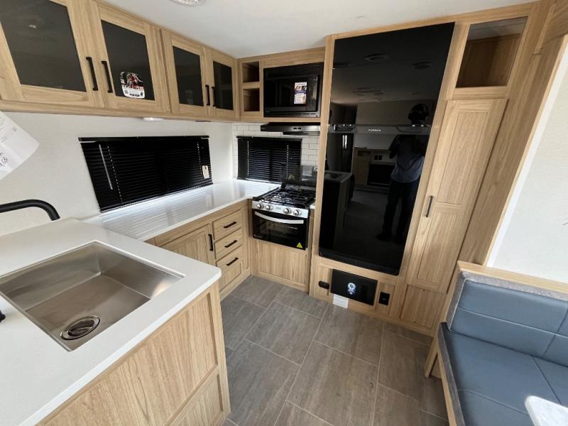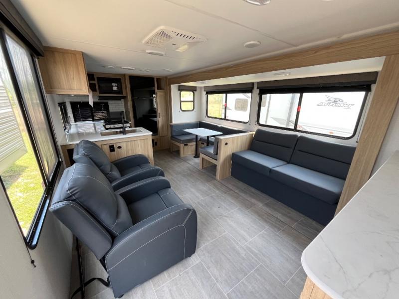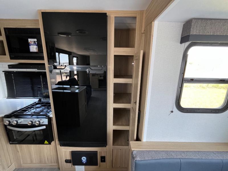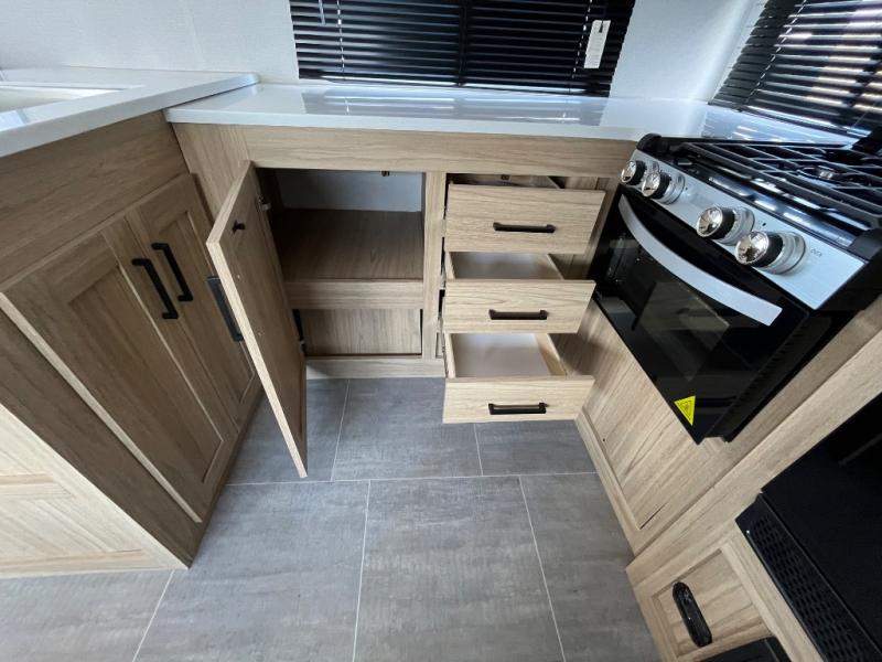 This spacious and inviting travel trailer is perfect for four campers. There is a front private bedroom with a queen bed, dual wardrobes, plus a third wardrobe with washer and dryer prep if you choose to add those appliances. The chef of your group can make breakfast on the three burner cooktop, and there is additional counter space thanks to the kitchen island. You'll also find a pantry and overhead cabinets for storage plus TV prep and a fireplace with hidden storage for movies, games and more. Your crew can get comfy on the theater seating or rear sofa, and there is a free-standing table with chairs where you can dine at and play games!