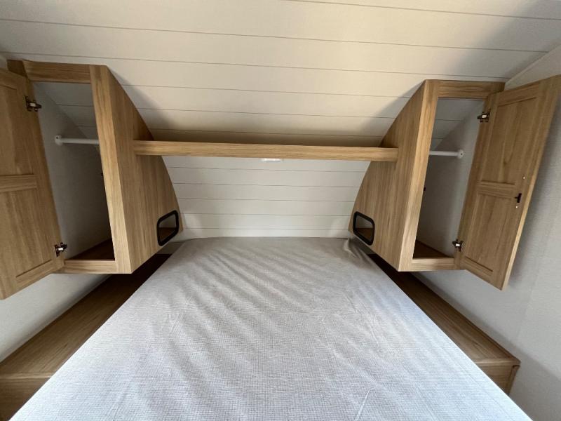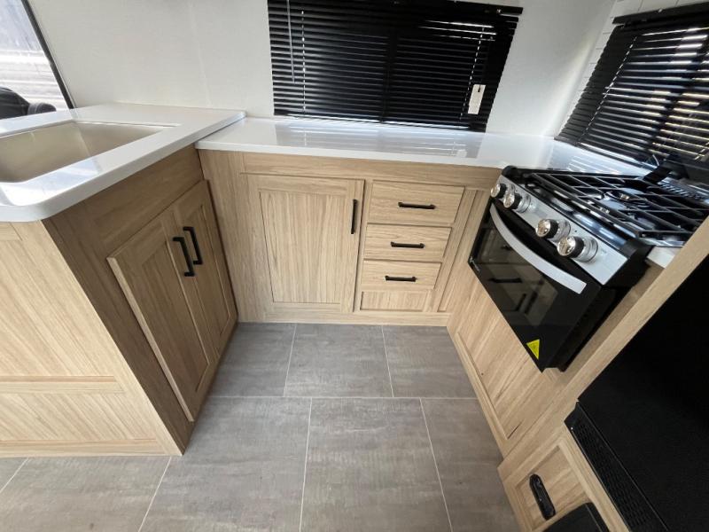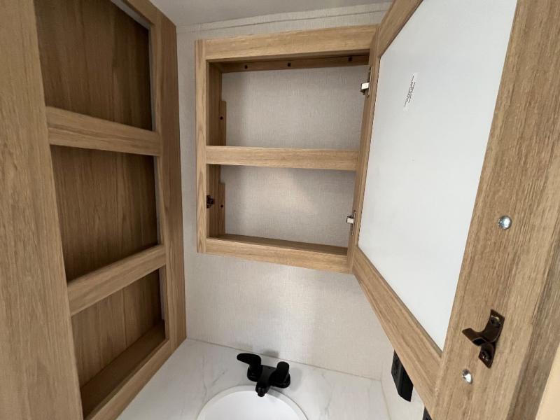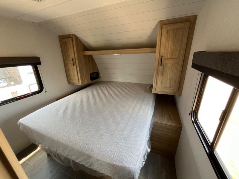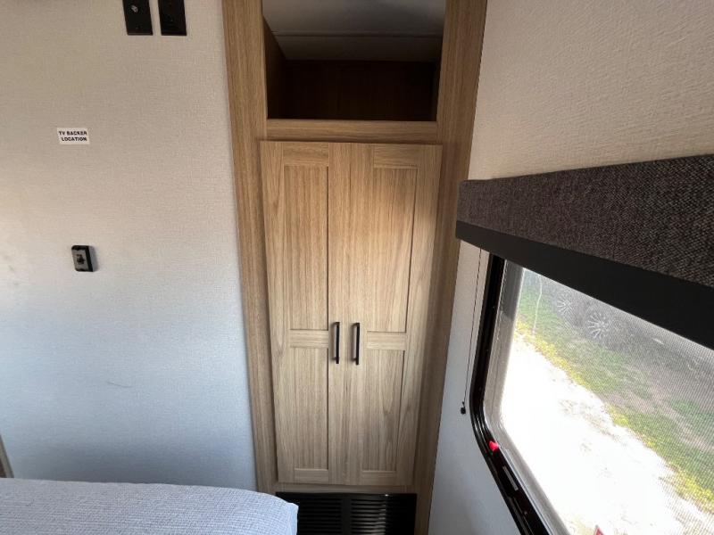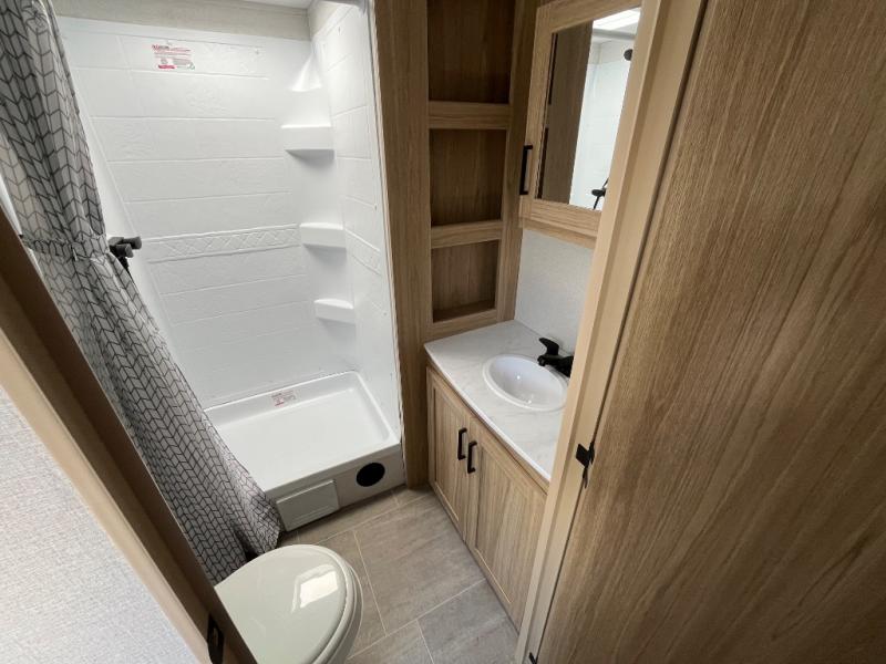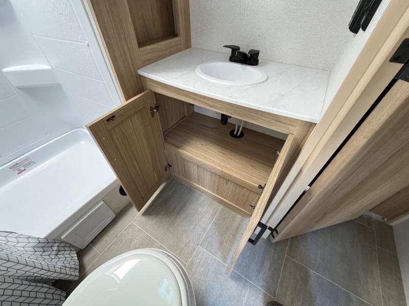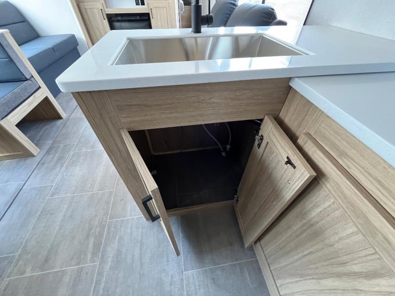 This spacious and inviting travel trailer is perfect for four campers. There is a front private bedroom with a queen bed, dual wardrobes, plus a third wardrobe with washer and dryer prep if you choose to add those appliances. The chef of your group can make breakfast on the three burner cooktop, and there is additional counter space thanks to the kitchen island. You'll also find a pantry and overhead cabinets for storage plus TV prep and a fireplace with hidden storage for movies, games and more. Your crew can get comfy on the theater seating or rear sofa, and there is a free-standing table with chairs where you can dine at and play games!